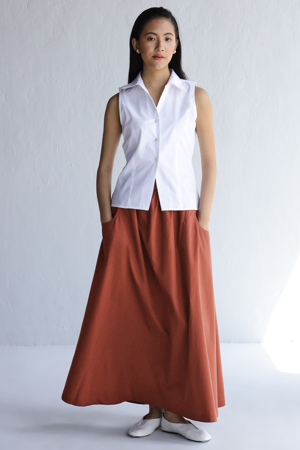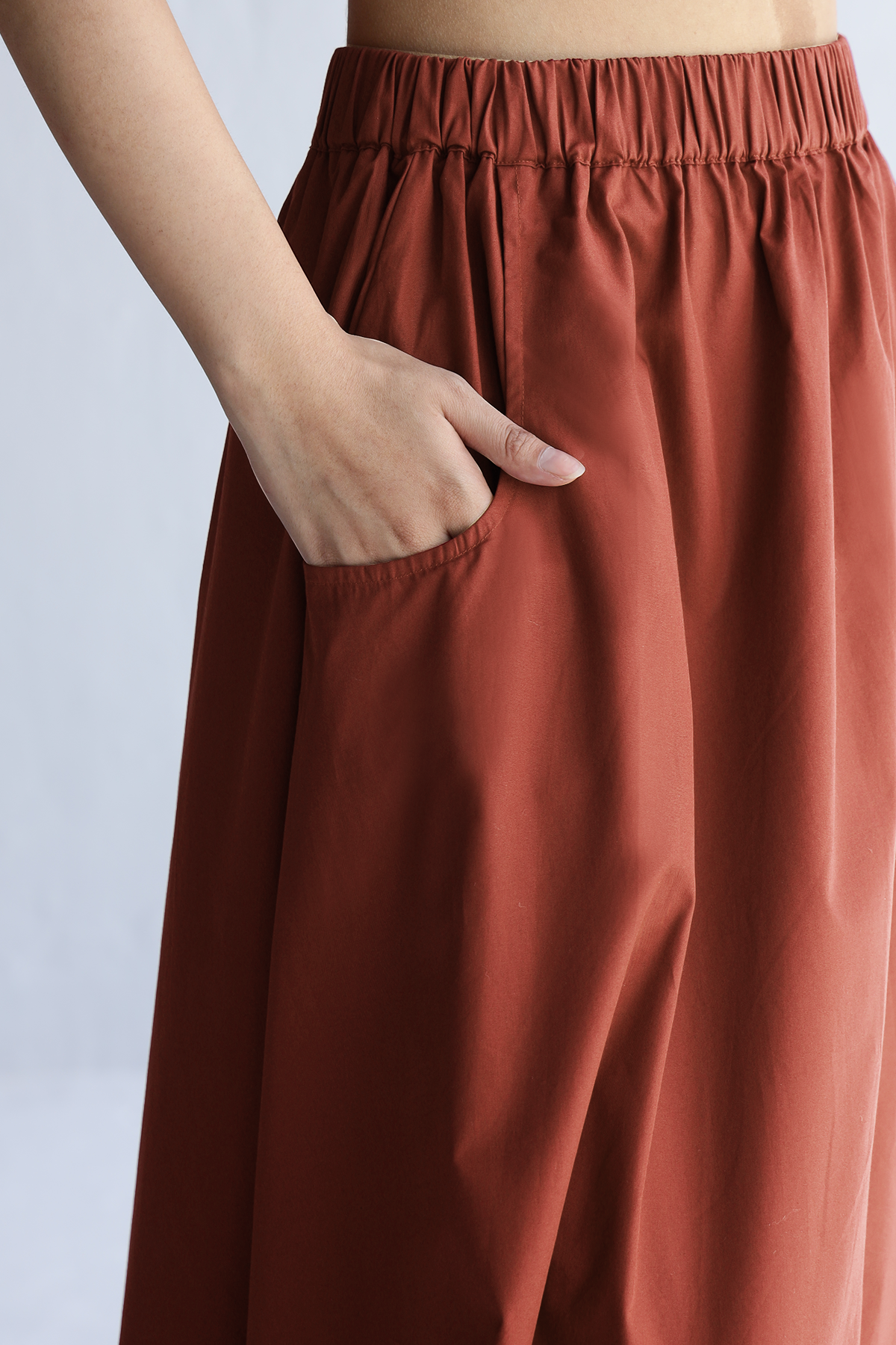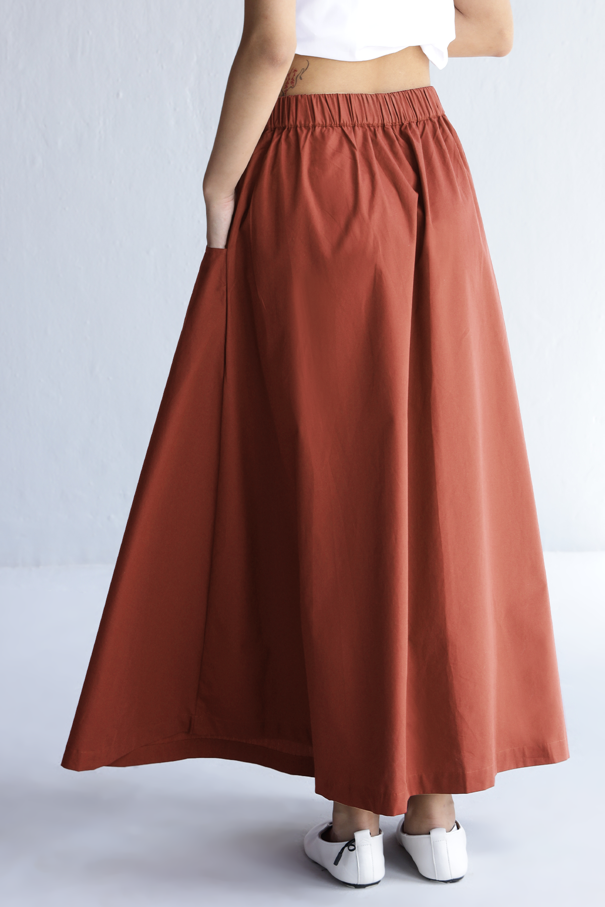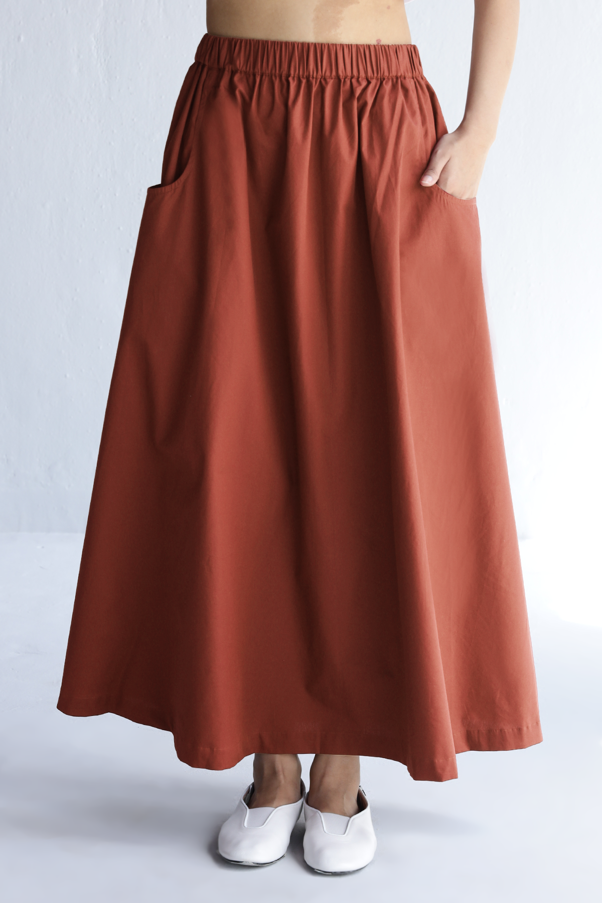 This rust maxi skirt brings ease to your 9am-to-dinner schedule. Clean A-line cut, secretly stretchy waistband, and pockets that actually hold stuff. Made in crisp cotton poplin that moves with you, not against you. Feels like effort, looks like intention. Basically, your “I have my life together” skirt.