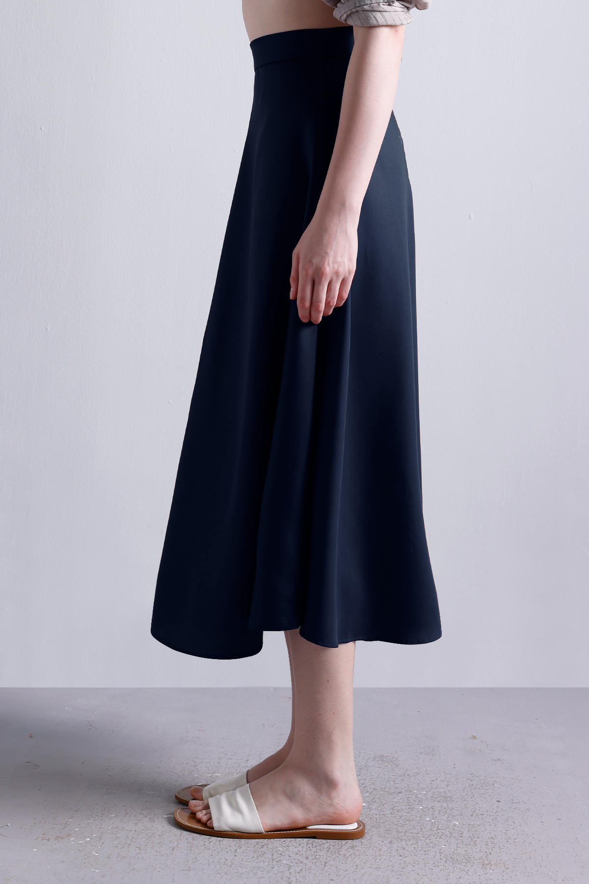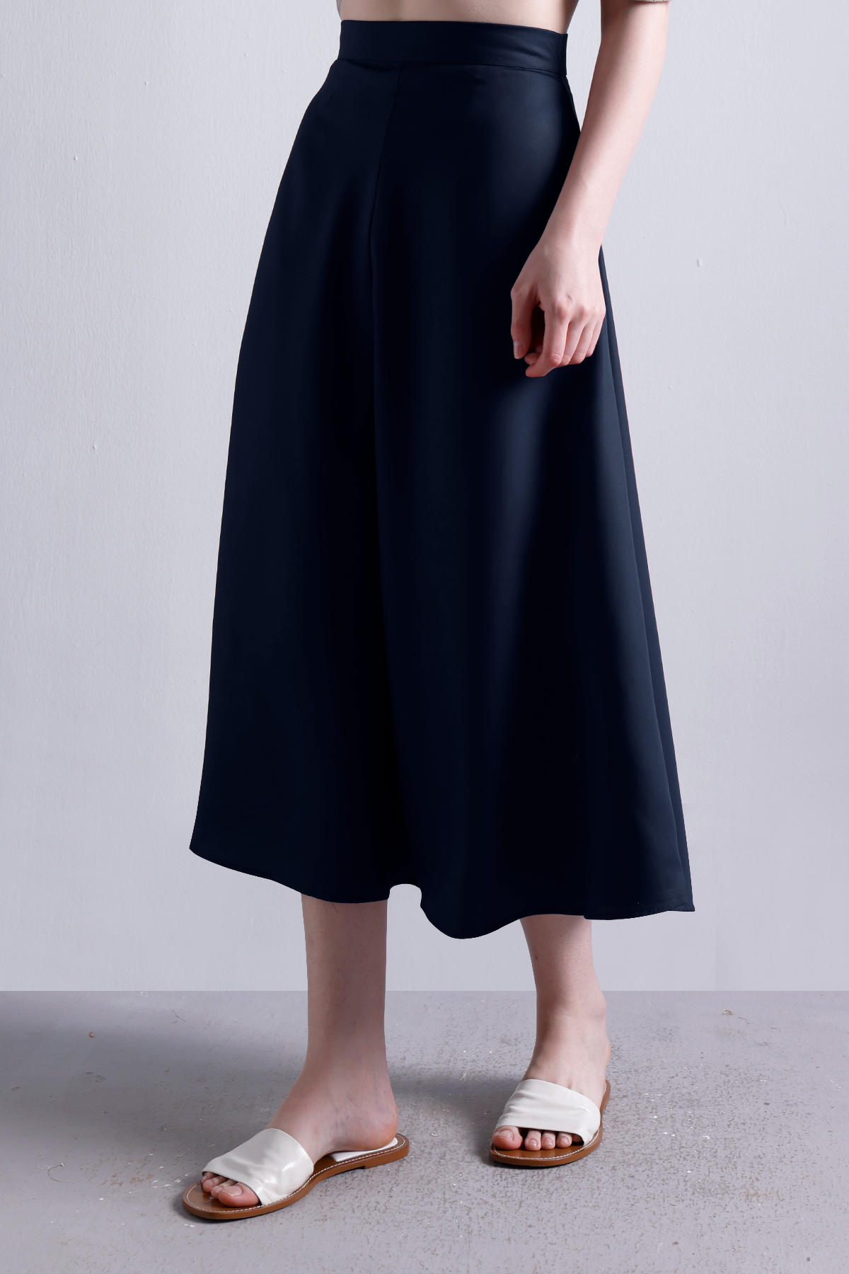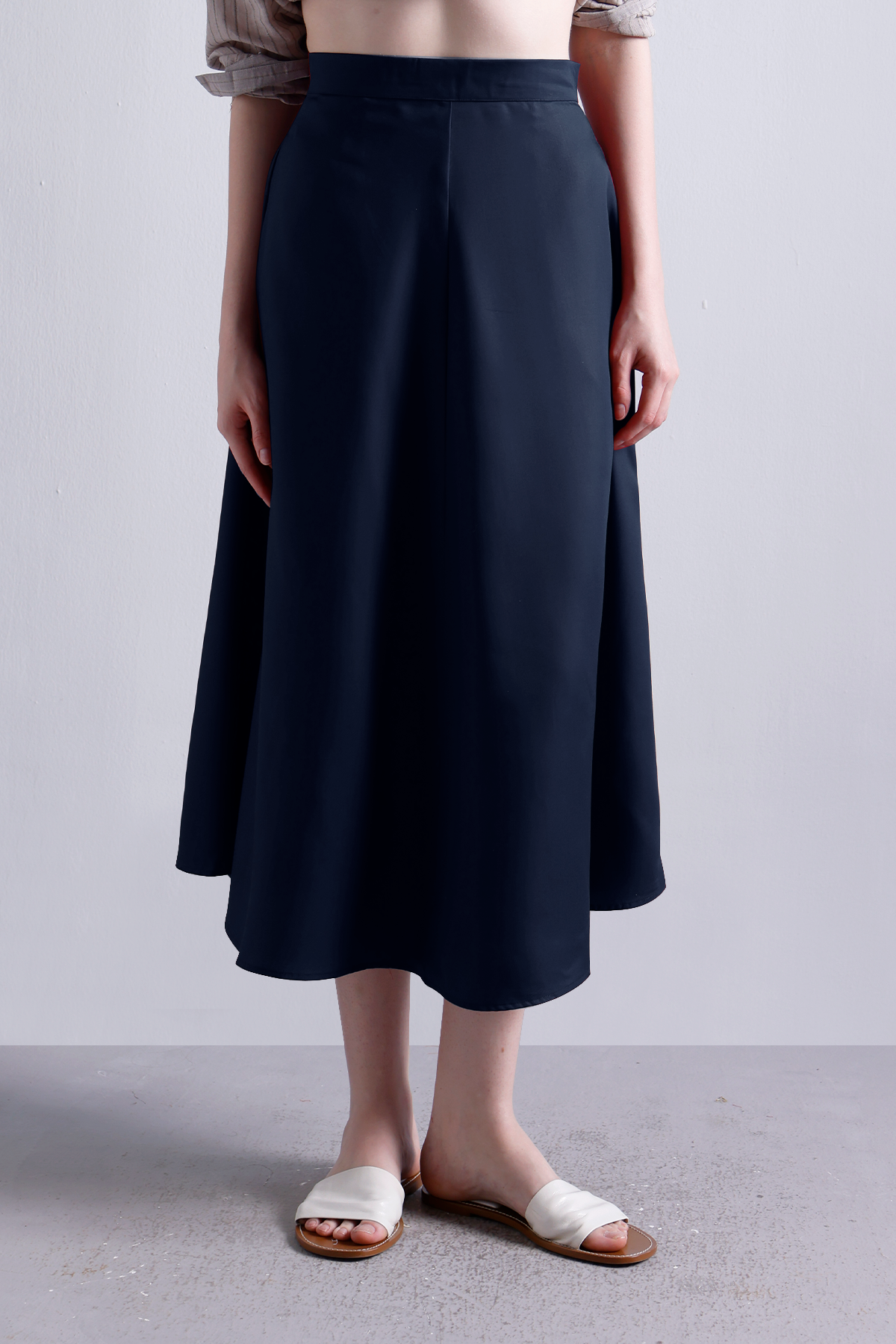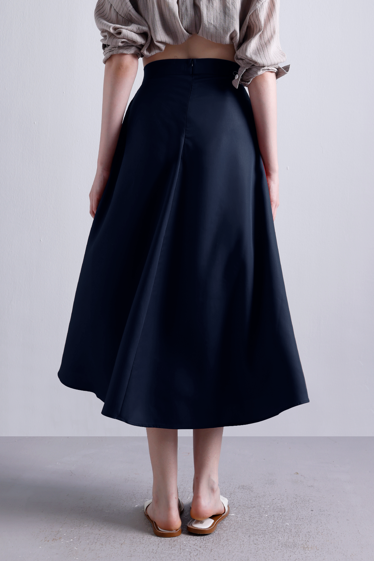A wardrobe essential that moves as effortlessly as you do. Crafted from sturdy-yet-breathable cotton twill, this Midnight navy flared midi skirt is all about structure with ease. The high-rise waist cinches gently, while the clean back zipper keeps things polished. Pair it with crisp shirts, soft knits, or flowy blouses—this one works hard year-round.