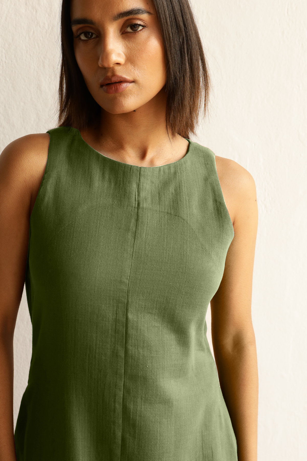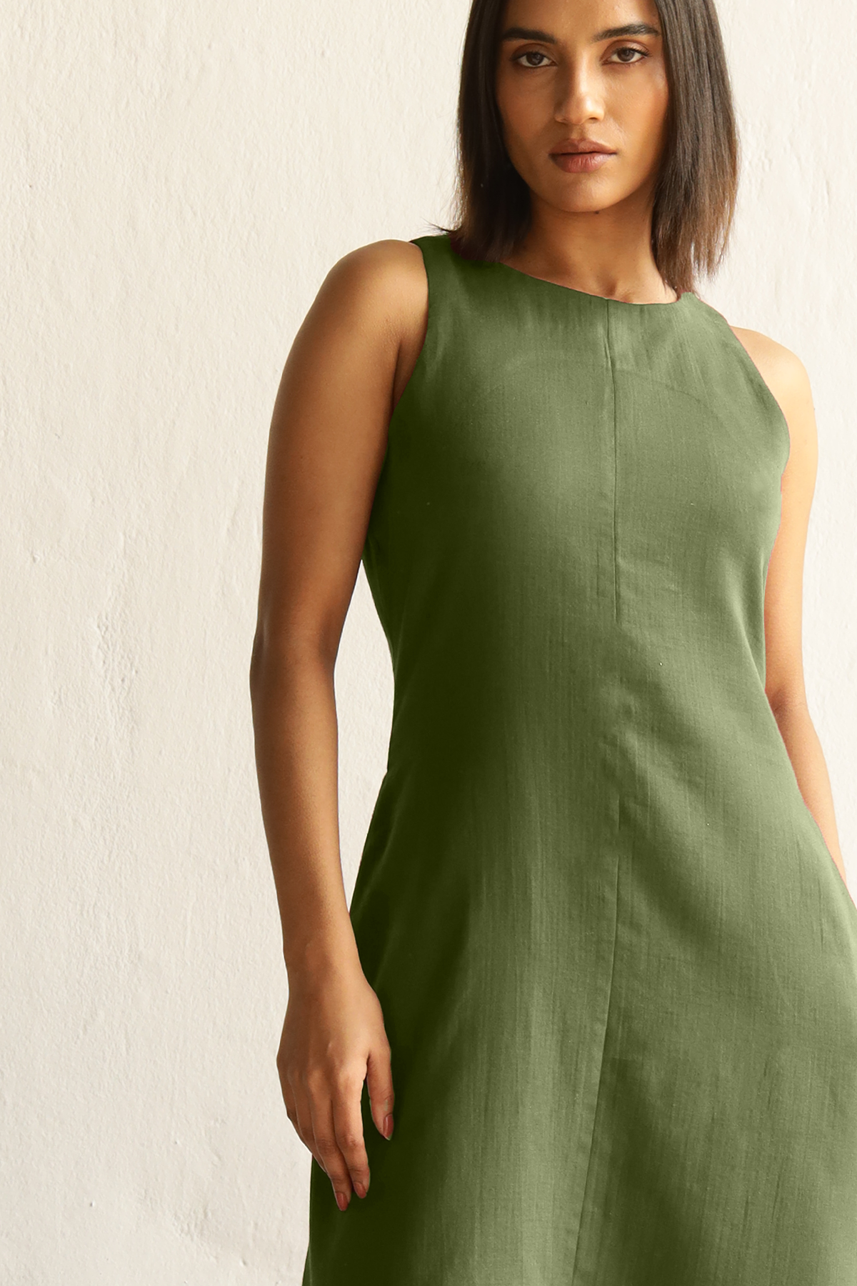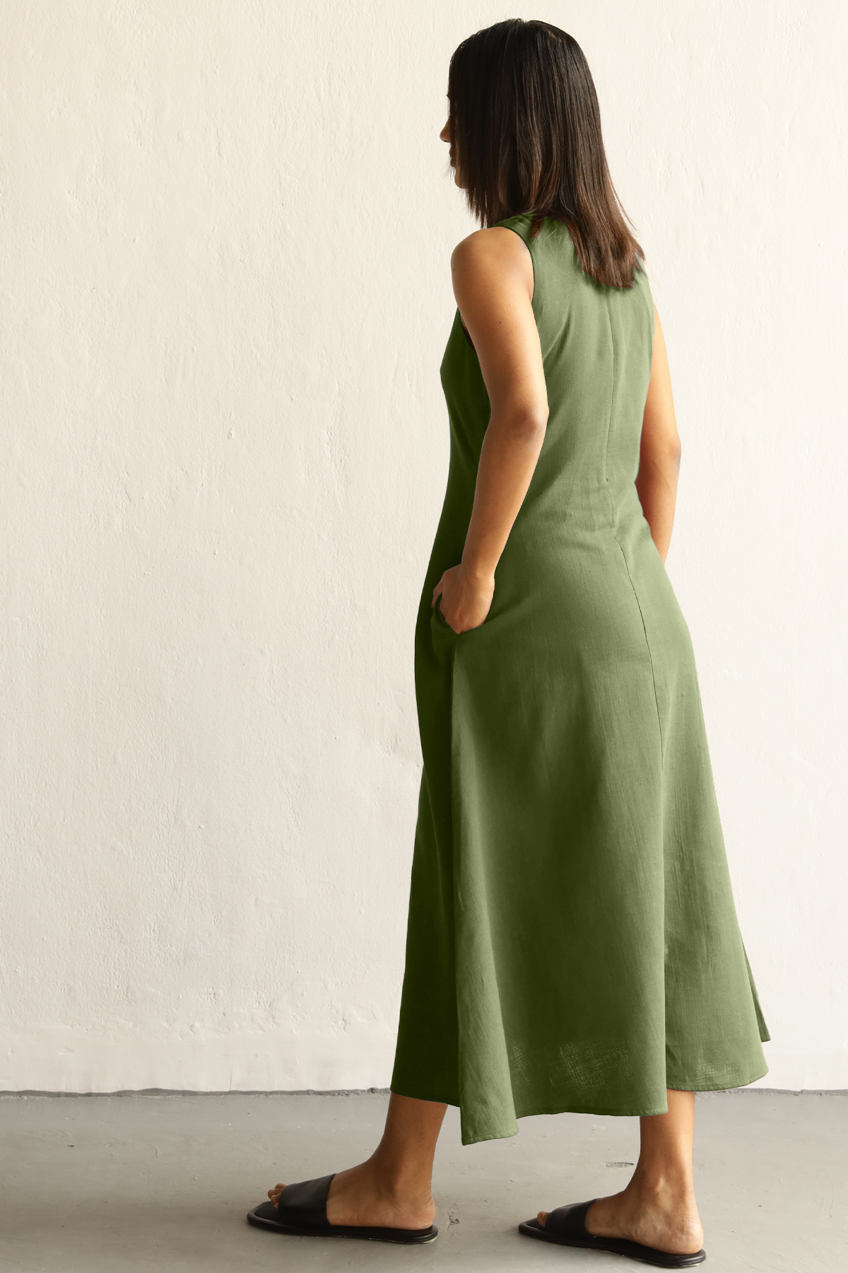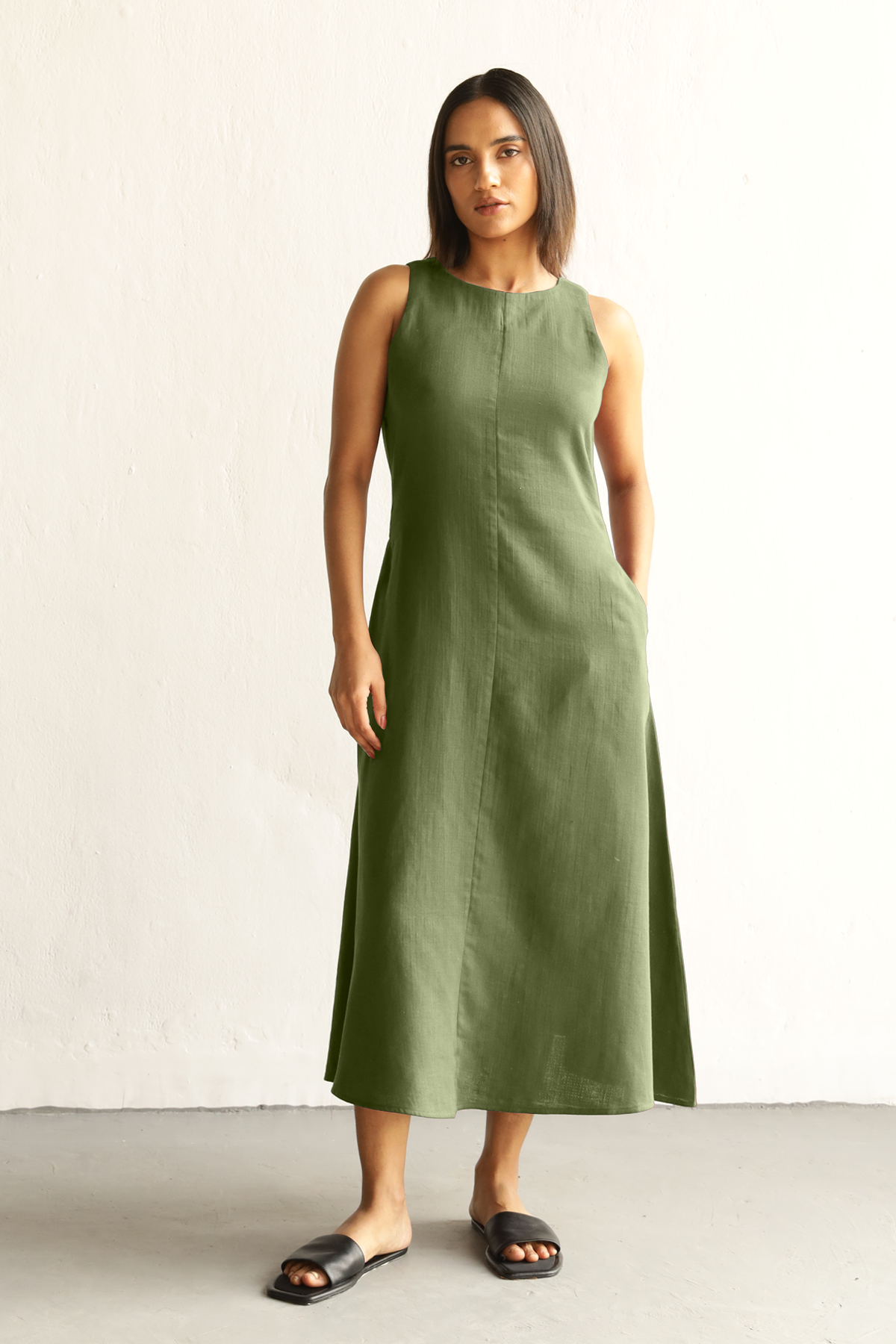 This basil sleeveless dress is the kind you throw on and instantly feel like you have your life together. It’s got a quiet confidence—clean cut, hidden pockets, and a colour that’s basically golden hour in fabric form. Wear it when you're not trying, but still want to win.
