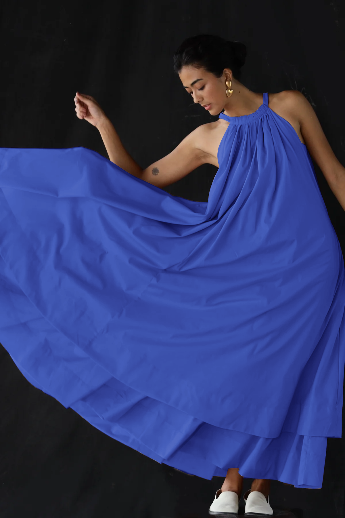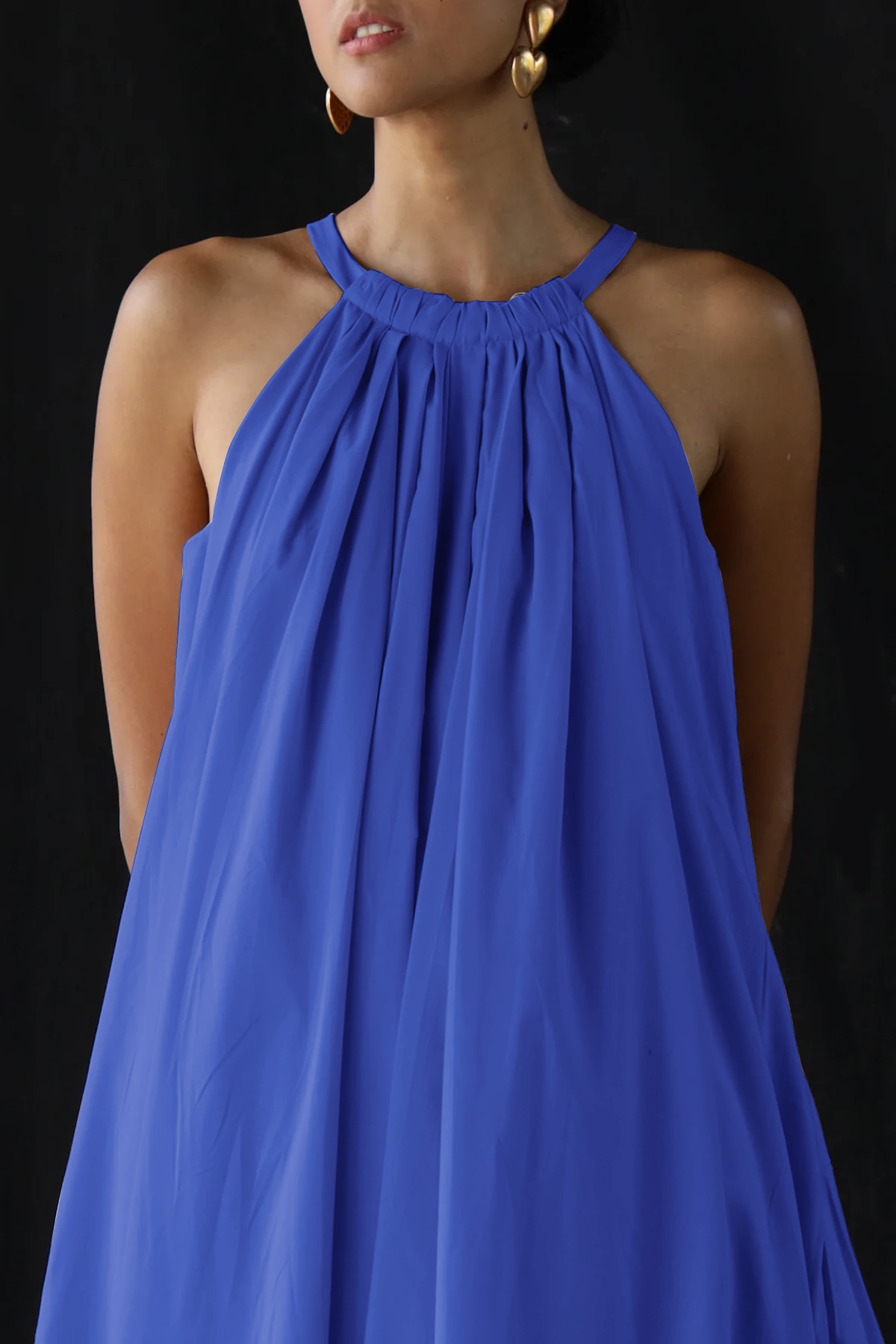 Breezy grandeur takes shape in this billowing sapphire maxi dress. Designed with a gathered halter neckline and an exquisitely layered hem, it moves like air with every step. A soft, voluminous silhouette brings ethereal elegance, while delicate back ties add a subtle flourish. Pure drama, effortlessly worn.
