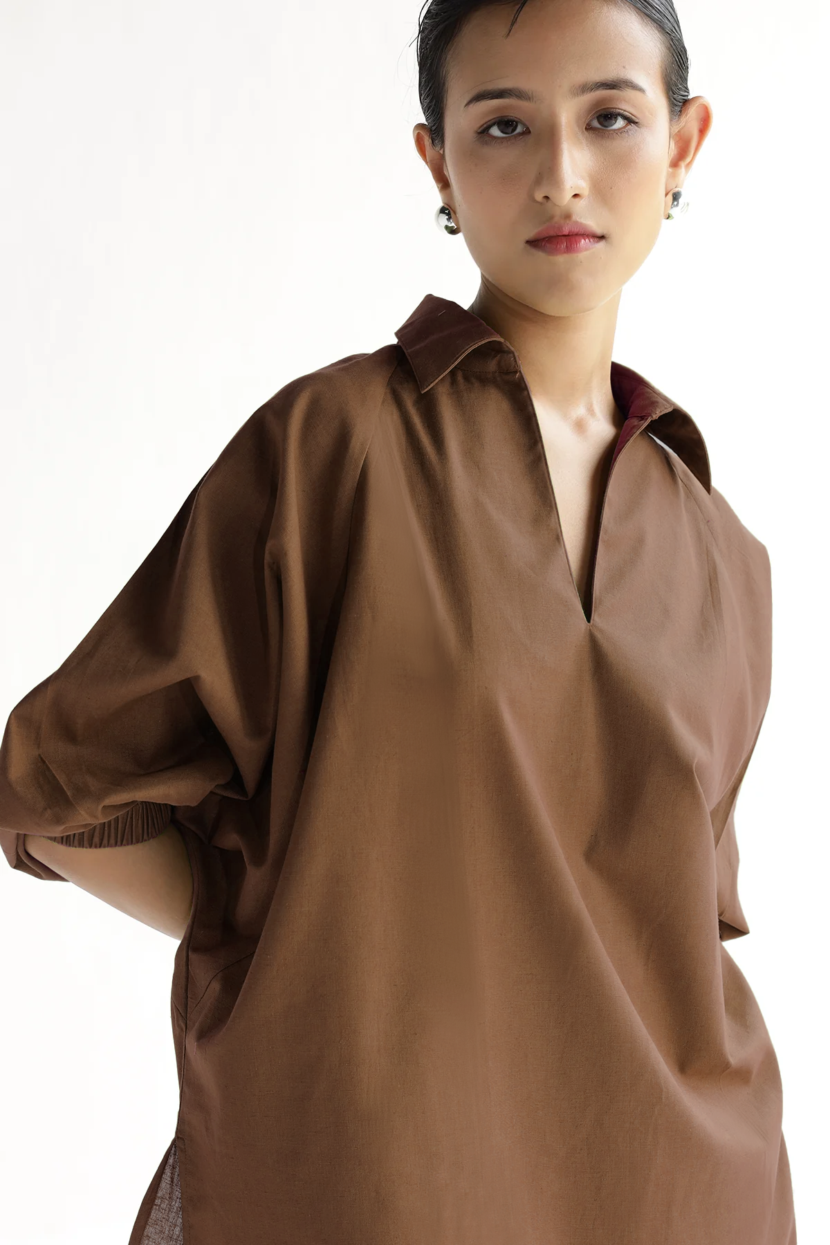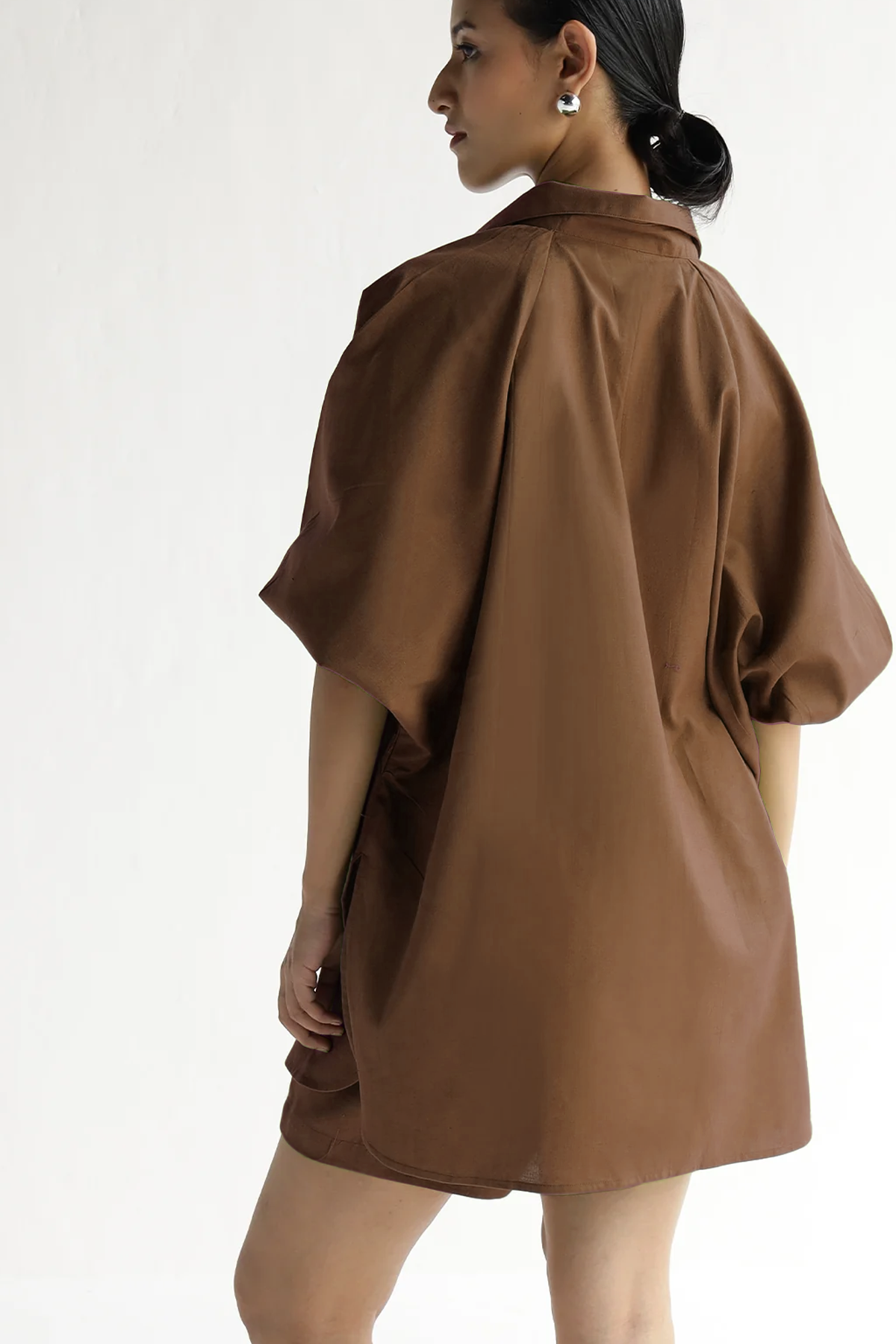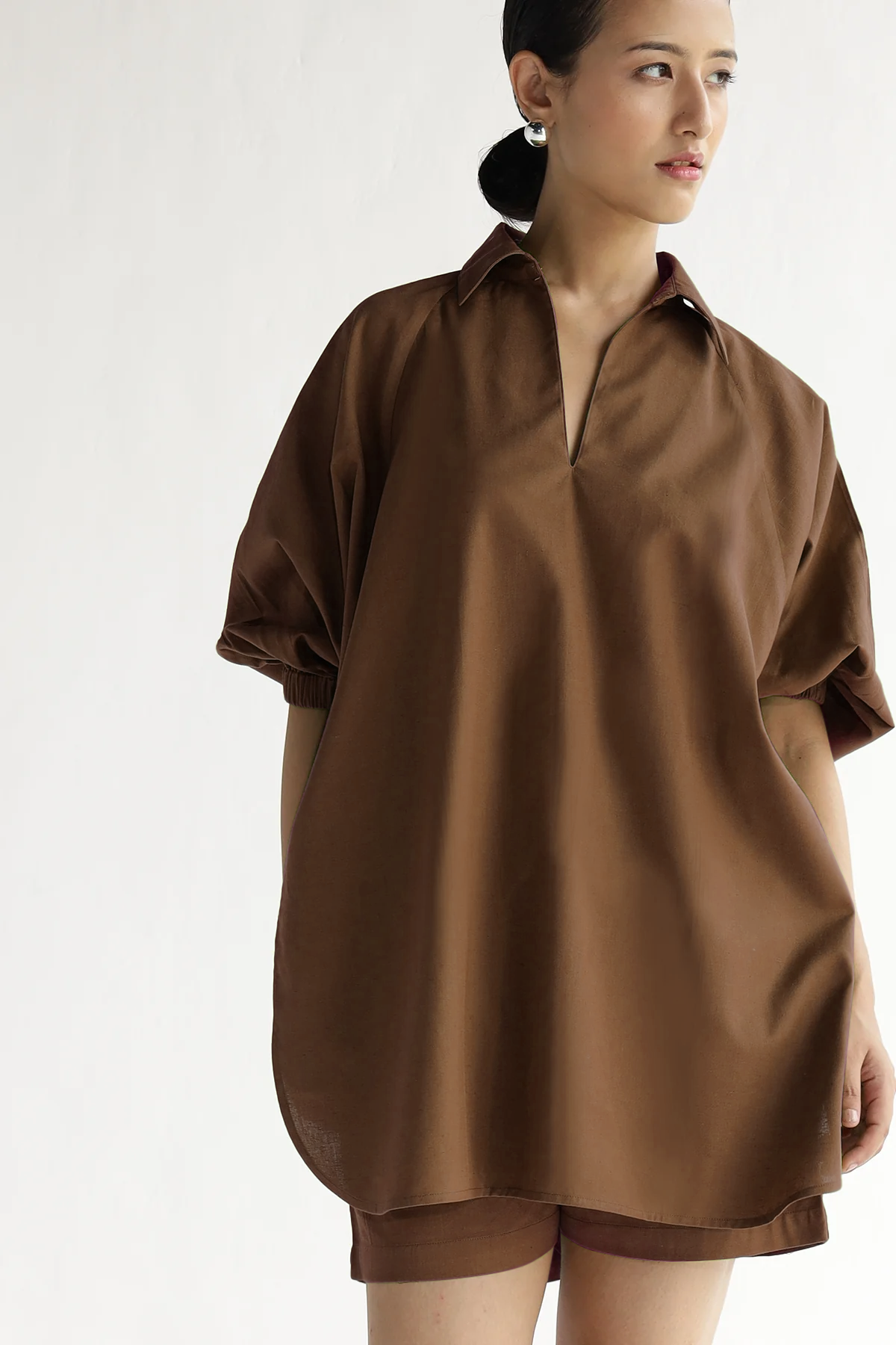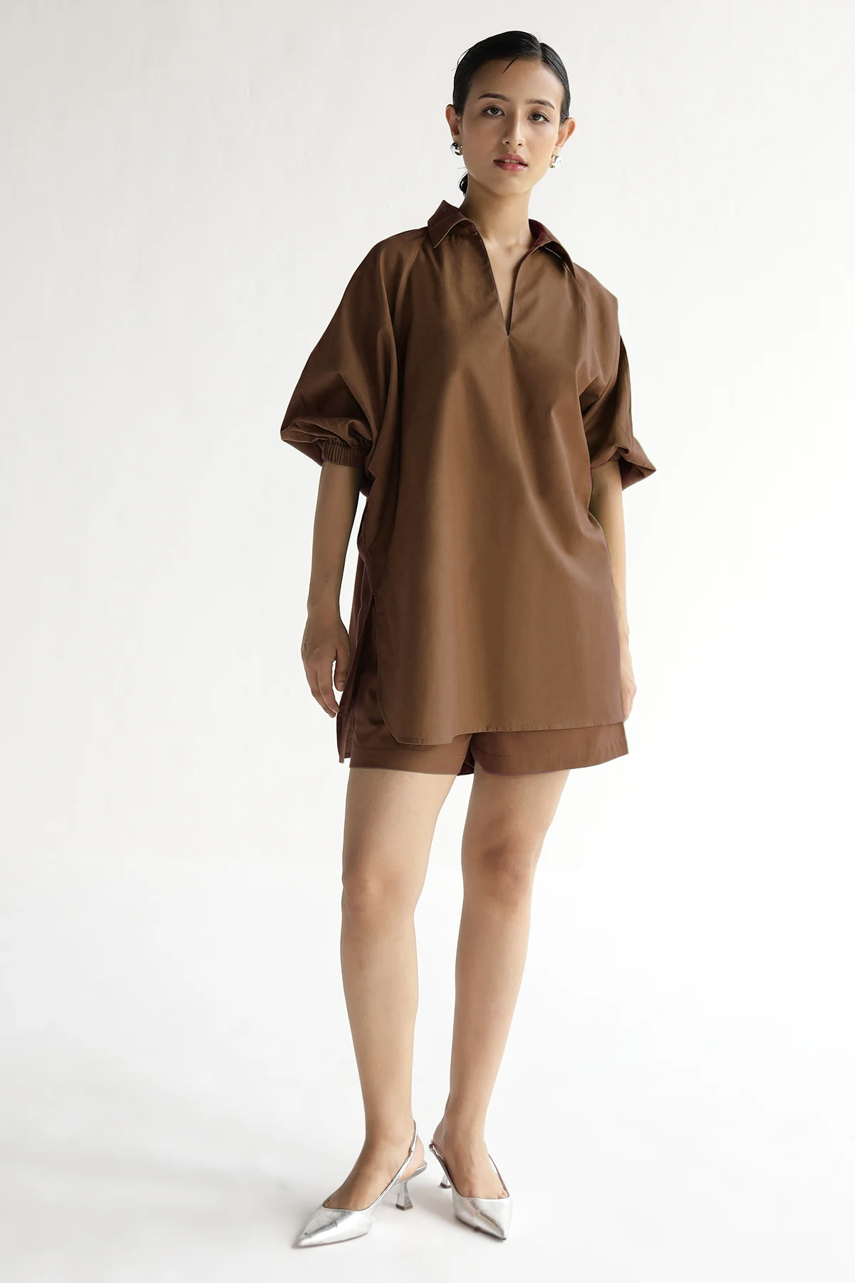 Power lunch or poolside—why not both? This relaxed collared top with puffed sleeves pairs with matching shorts for a look that’s crisp, cool, and ready for anything. Pockets included . Wear it oversized, wear it undone with a lot ease.