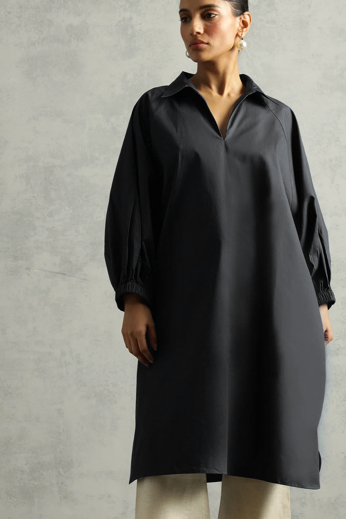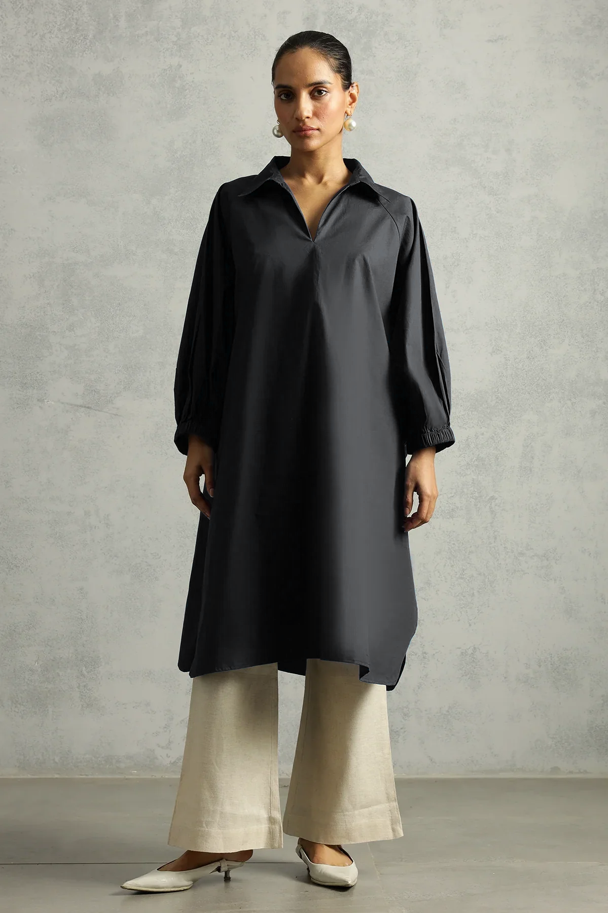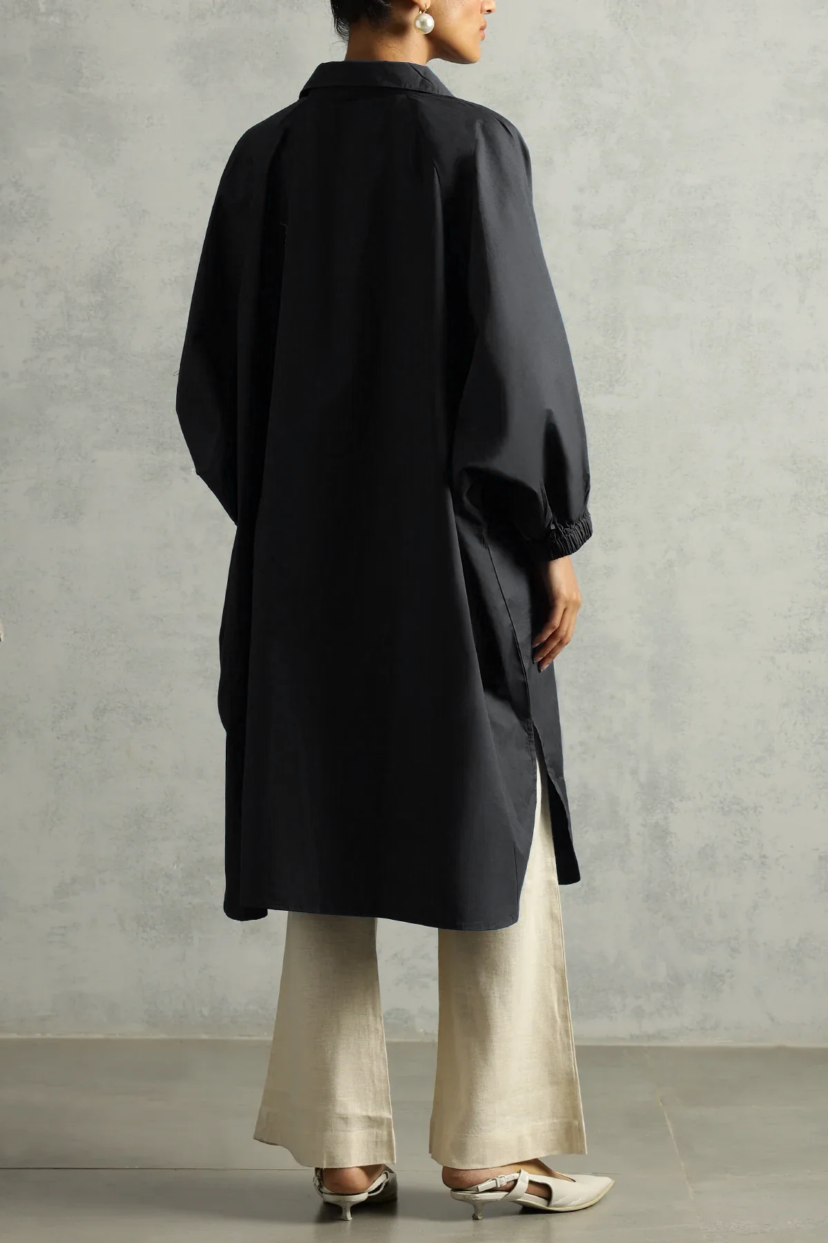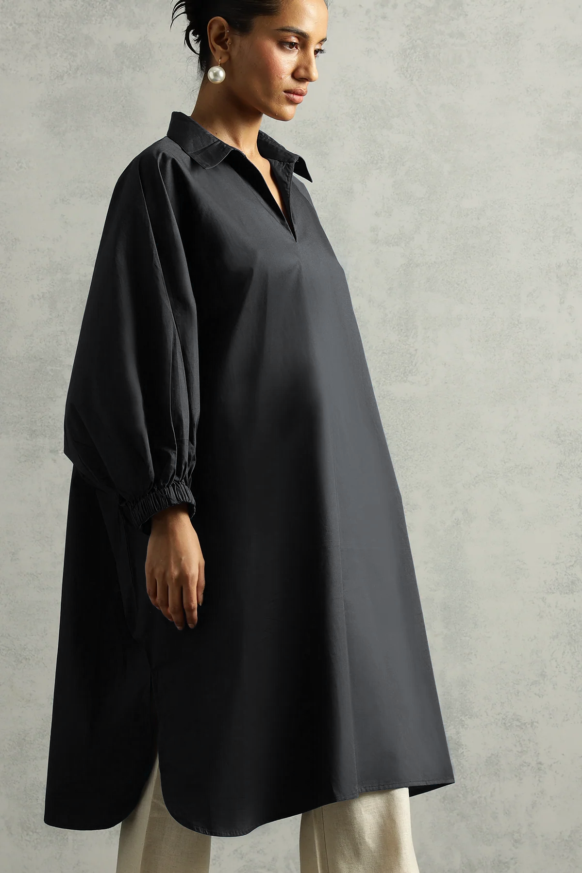 Wears like a breeze, feels like a plan. This shirt dress drapes with quiet drama and does all the work so you don’t have to. Crisp collar, balloon sleeves, and a generous silhouette—tailored for days when you want comfort to look like intention.