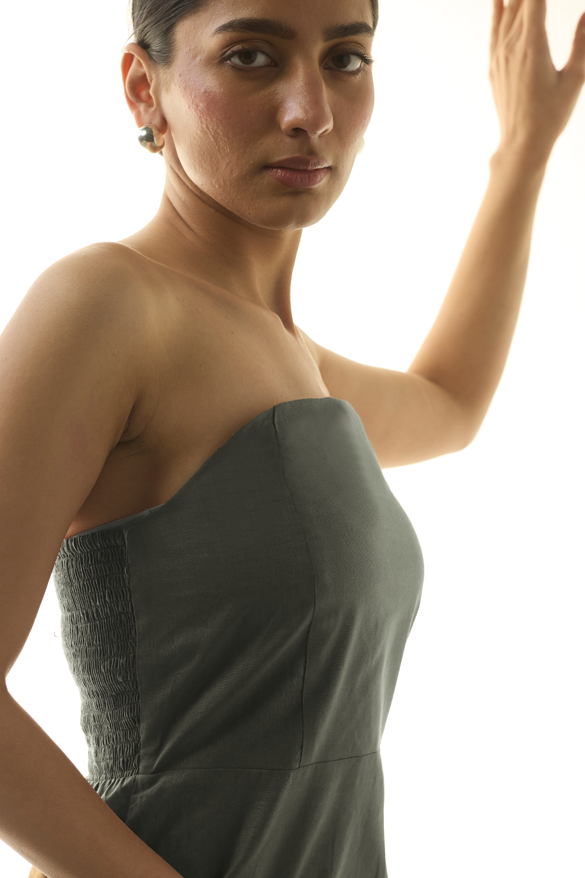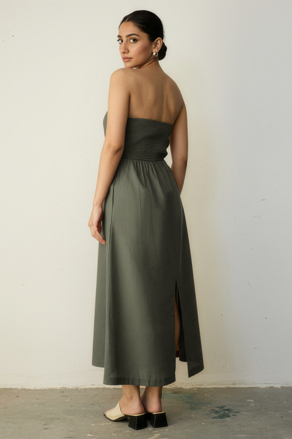 This is your “quiet luxury” strapless dress. A rich olive midi silhouette with a sleek bodice, soft drape, and a comfortable smocked back for the perfect fit. Structured yet breathable, polished yet easy. A versatile minimal dress for dinners, events, and last-minute plans that still deserve drama.