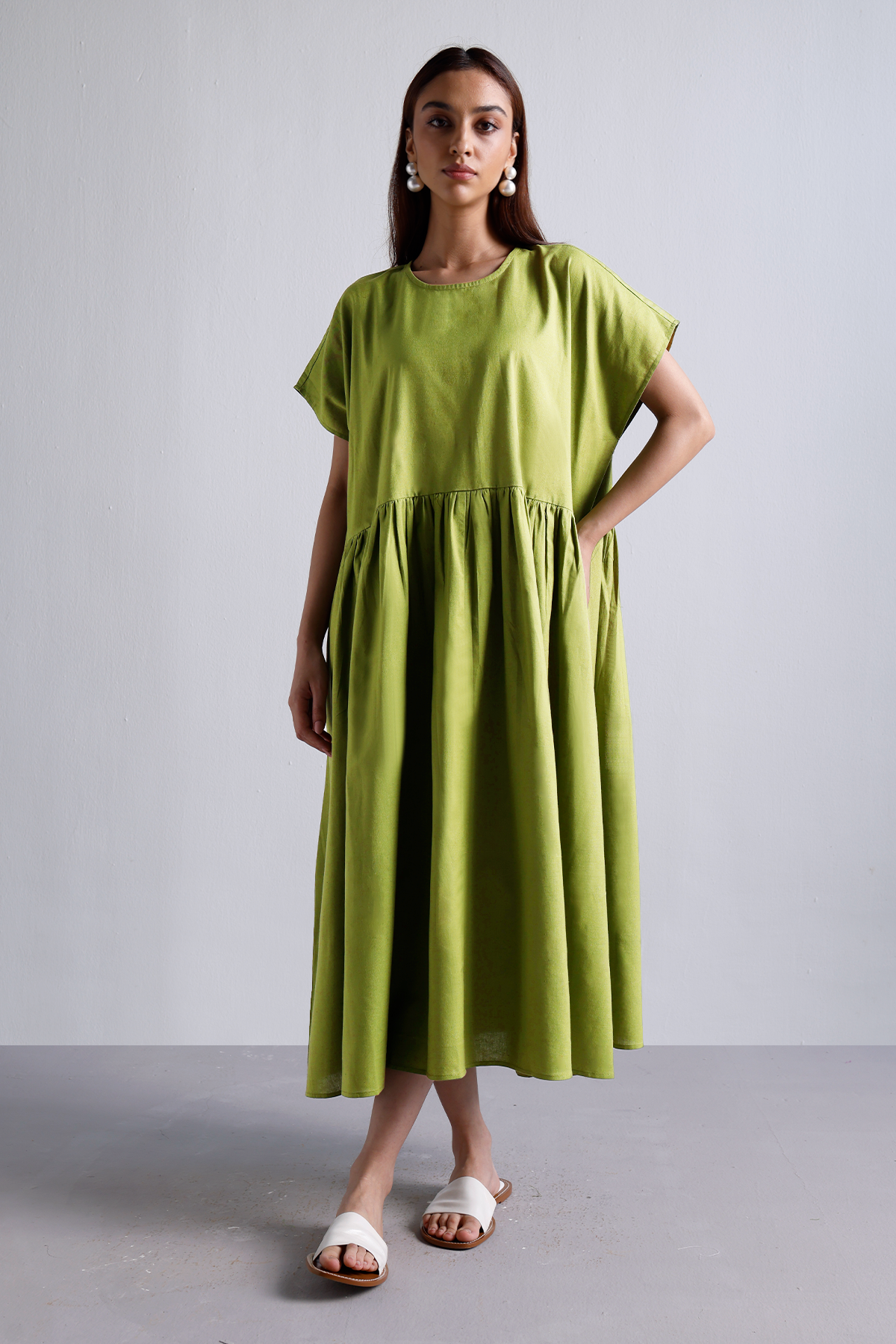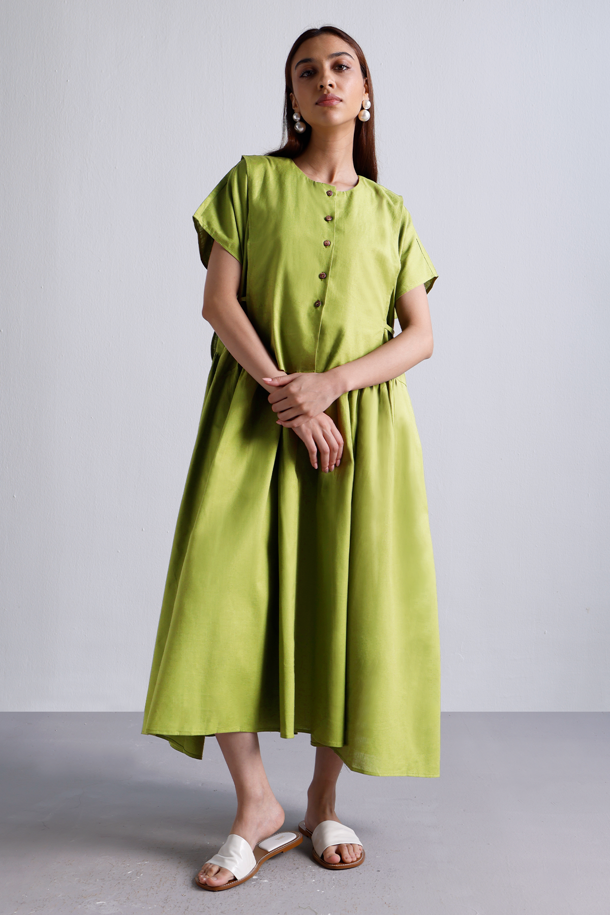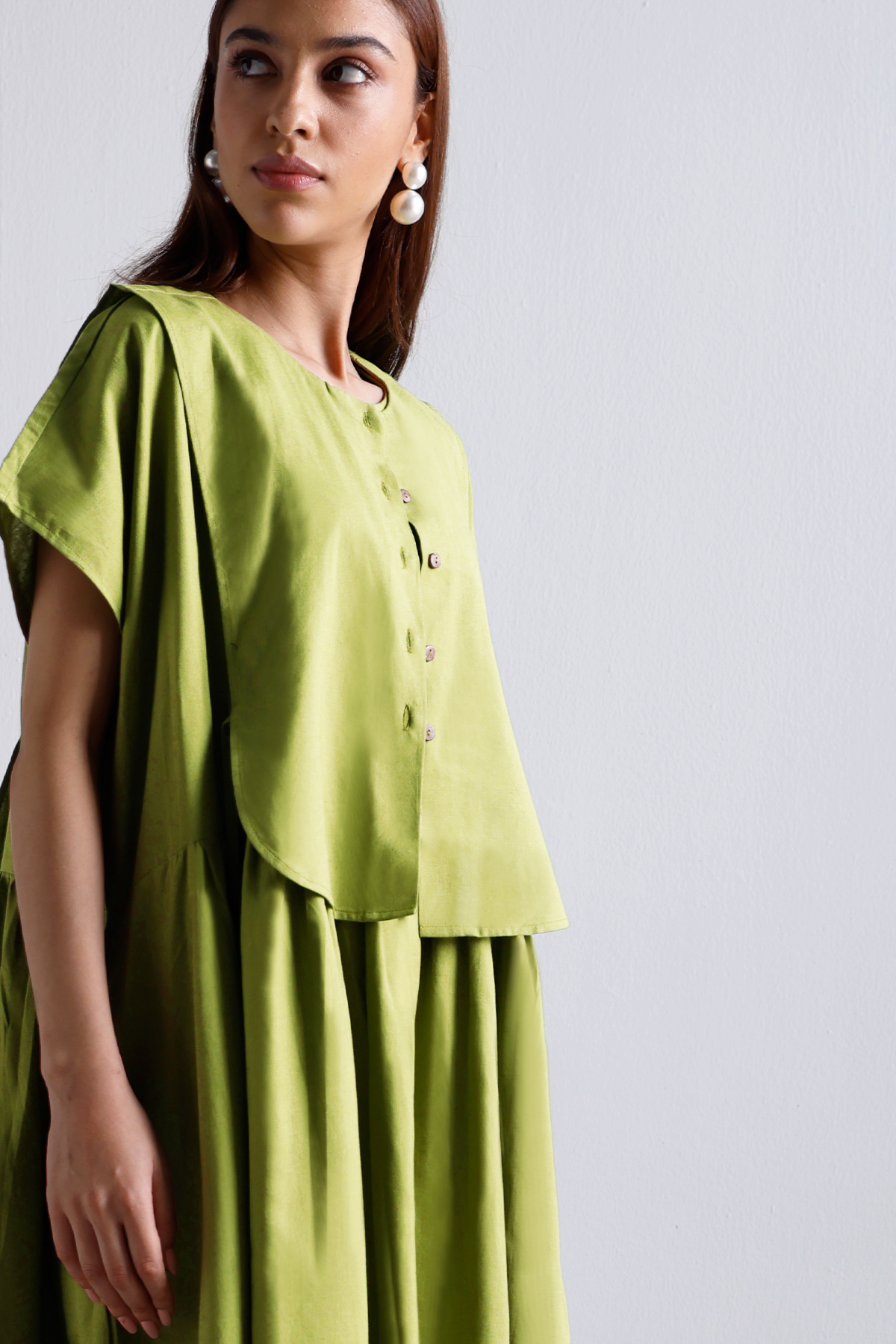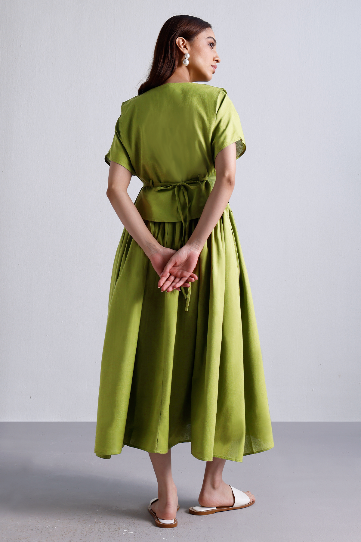 Built-in polish, zero styling effort. This Island Green midi dress features a mock-layer overlay, soft gathers, and a tie-back detail that flatters from all angles. It's giving, graceful grounded, and totally in charge. Bonus? It goes with your favorite flats and your favorite excuses to cancel plans.