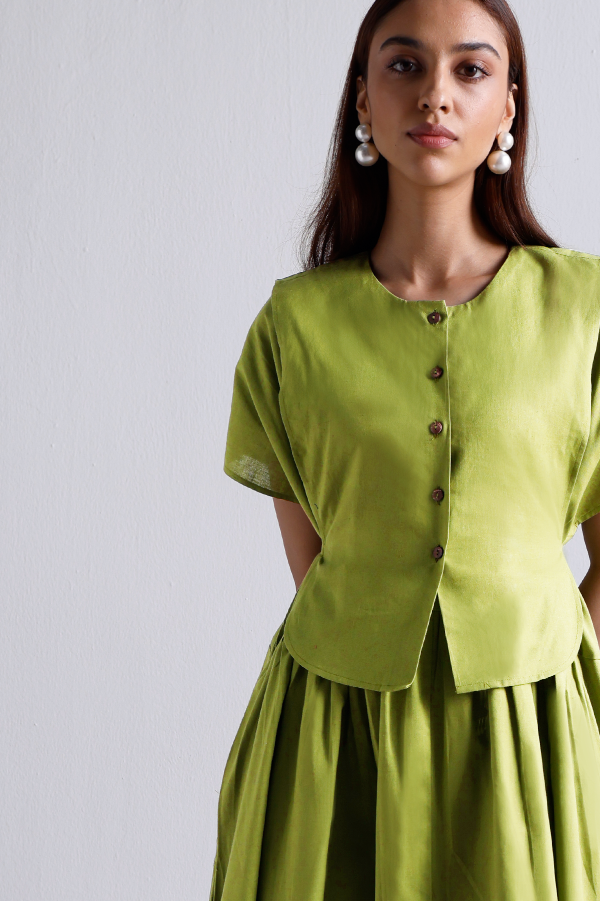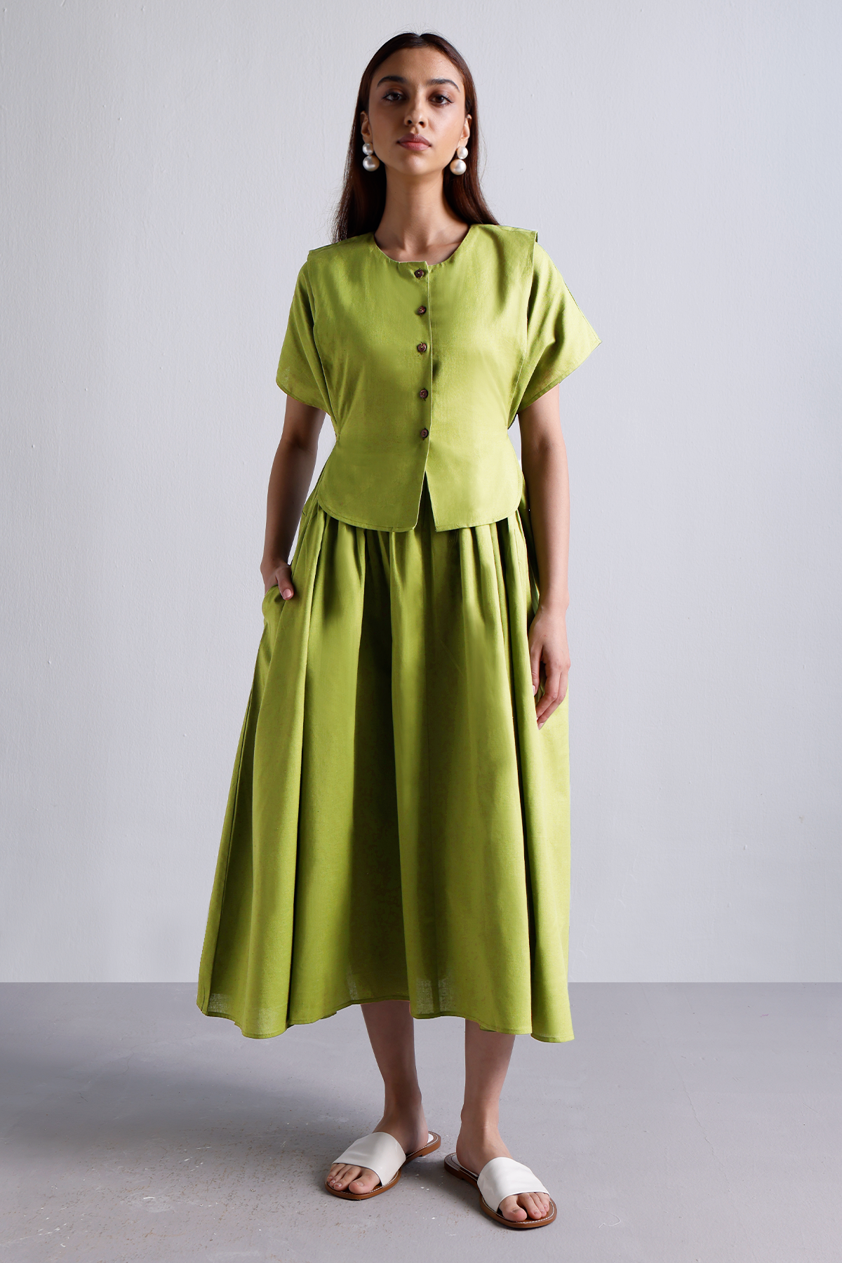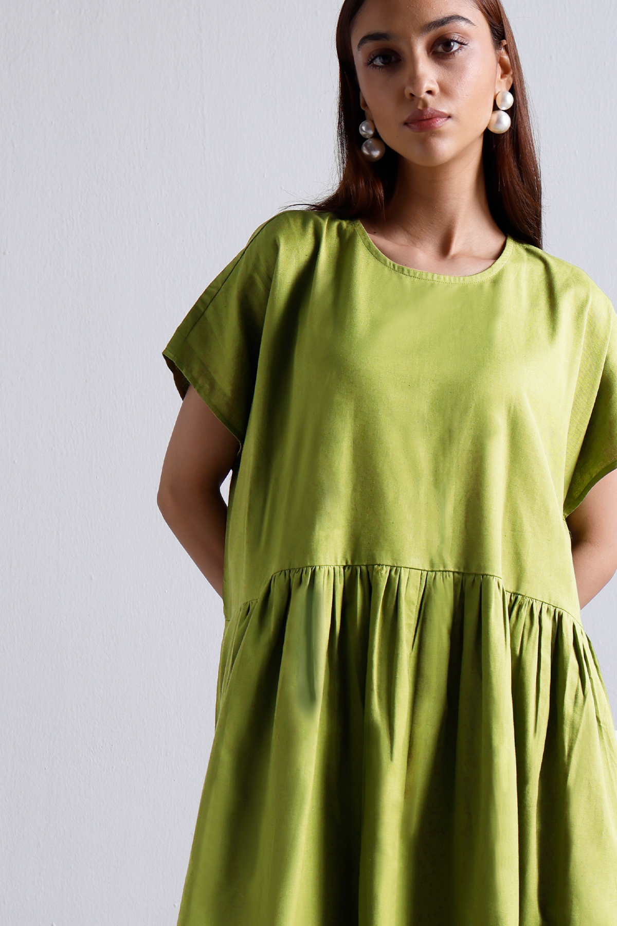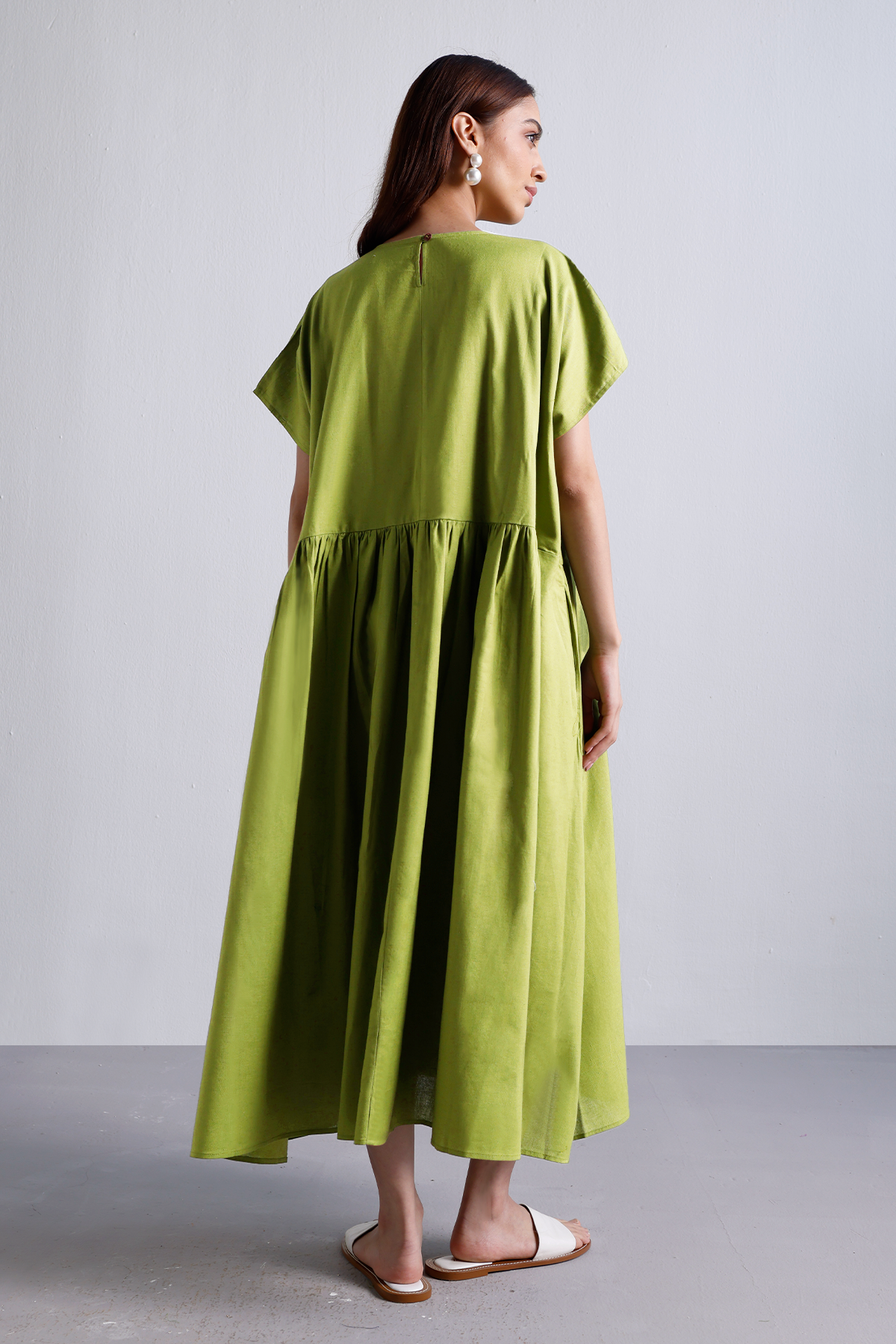 Built-in polish, zero styling effort. This Island Green midi dress features a mock-layer overlay, soft gathers, and a tie-back detail that flatters from all angles. It's giving, graceful grounded, and totally in charge. Bonus? It goes with your favorite flats and your favorite excuses to cancel plans.