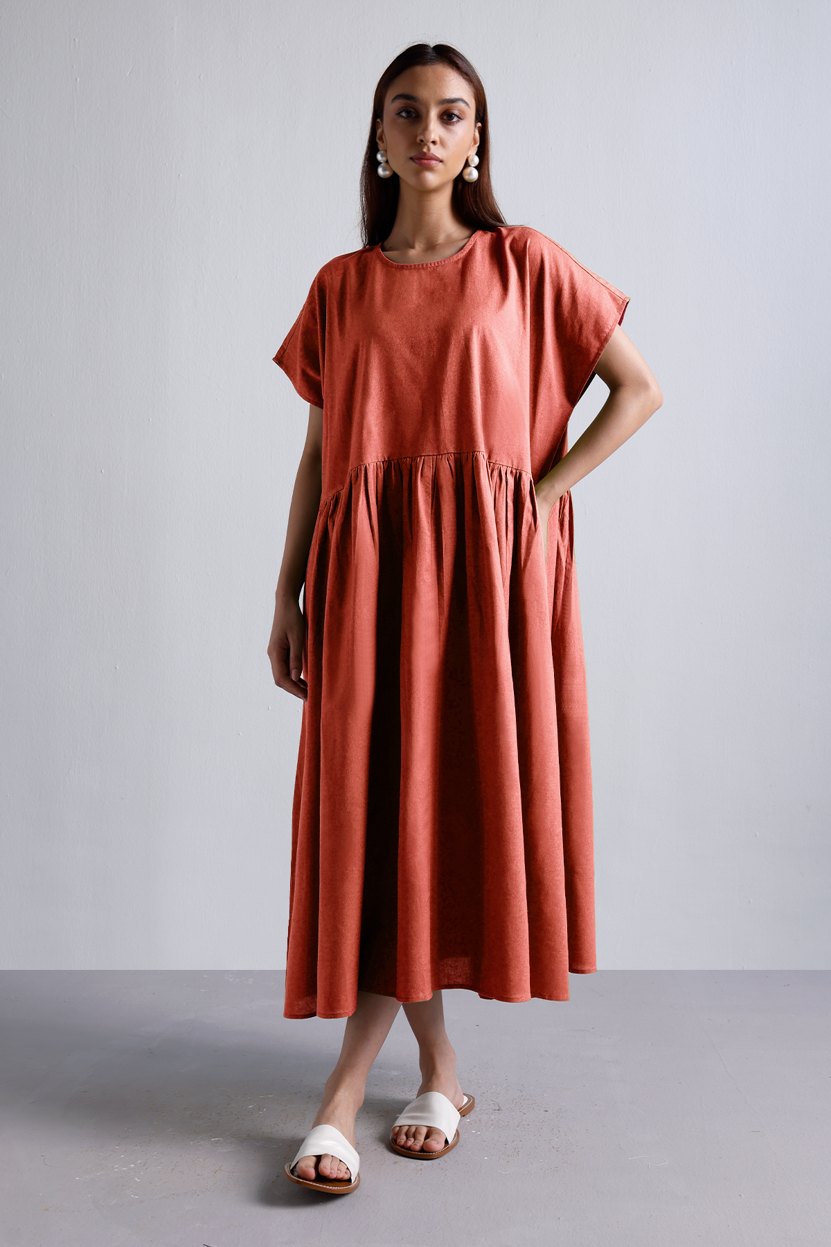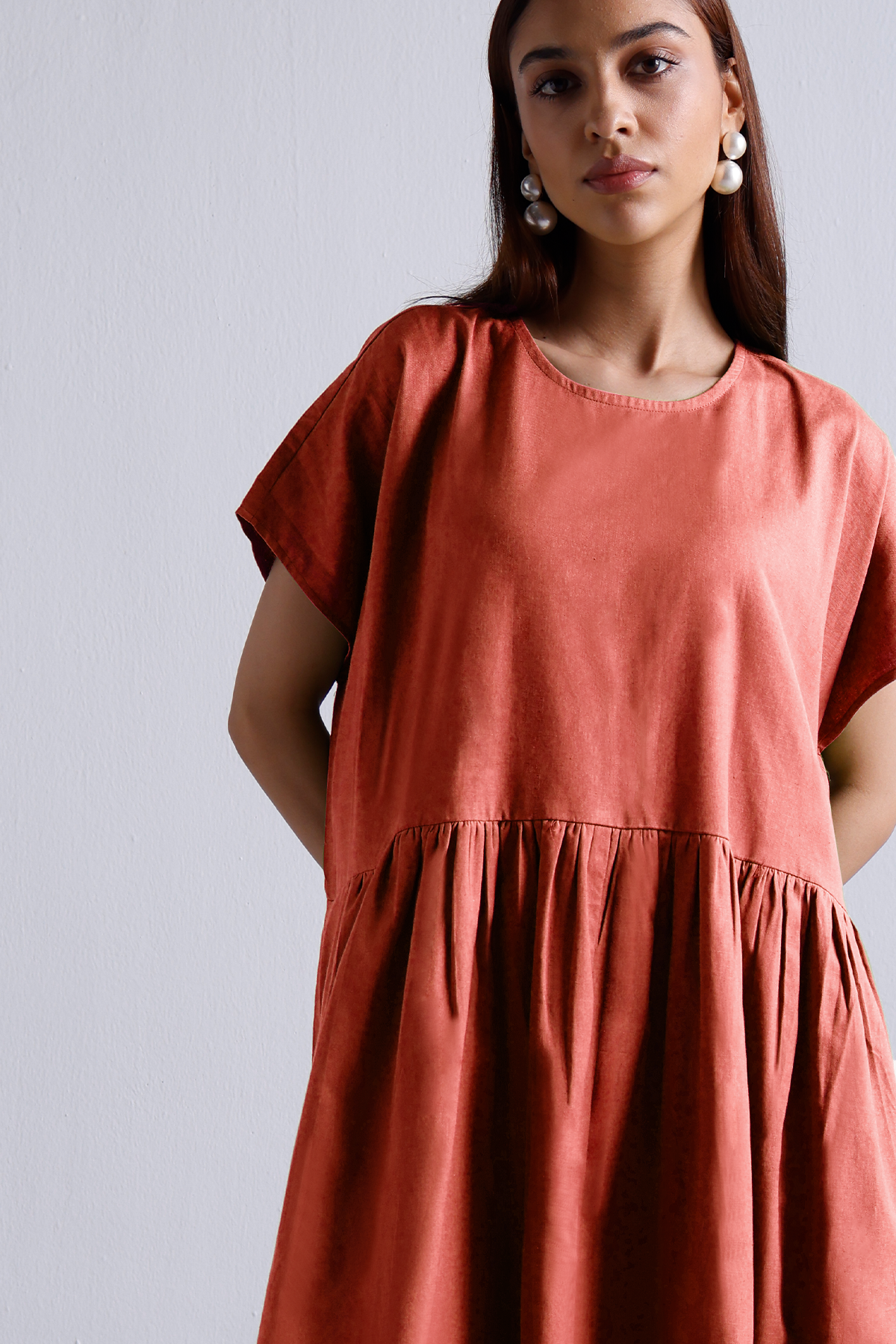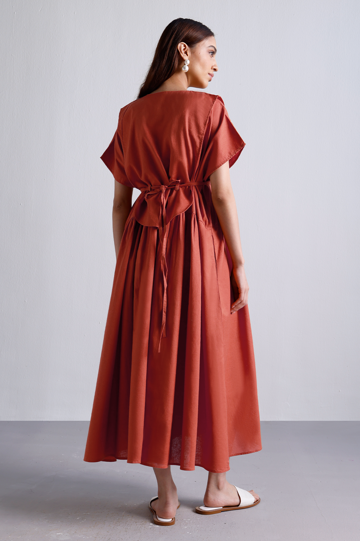 Built-in polish, zero styling effort. This Rust midi dress features a mock-layer overlay, soft gathers, and a tie-back detail that flatters from all angles. It's giving: graceful, grounded, and totally in charge. Bonus? It goes with your favorite flats and your favorite excuses to cancel plans.