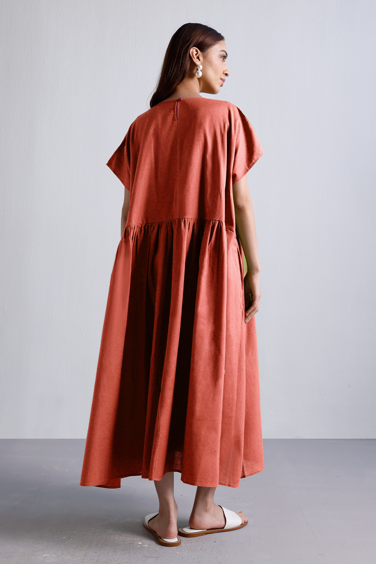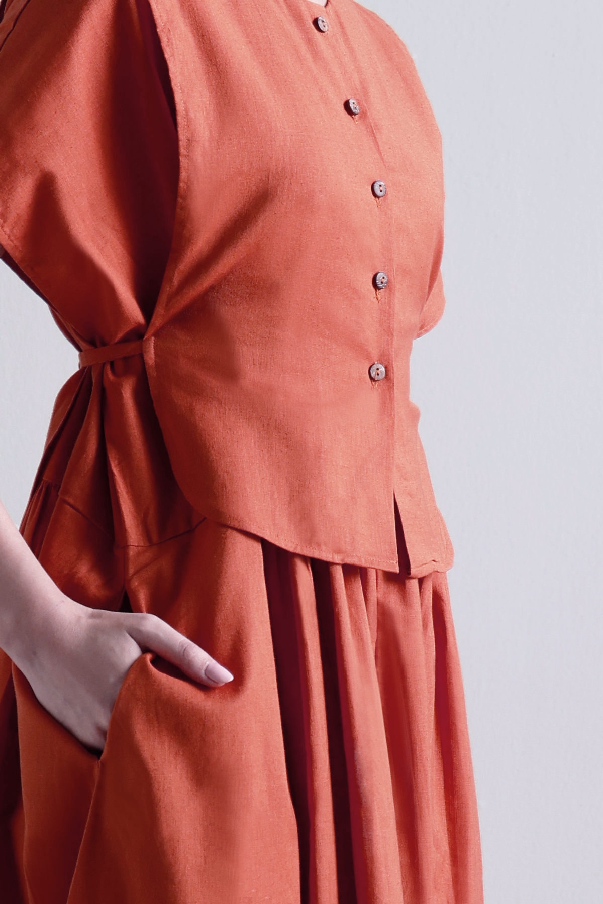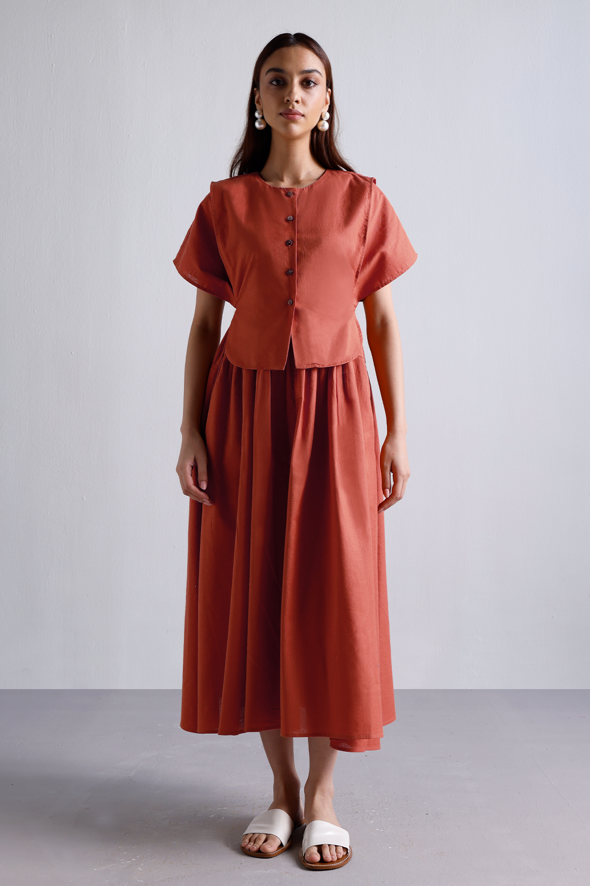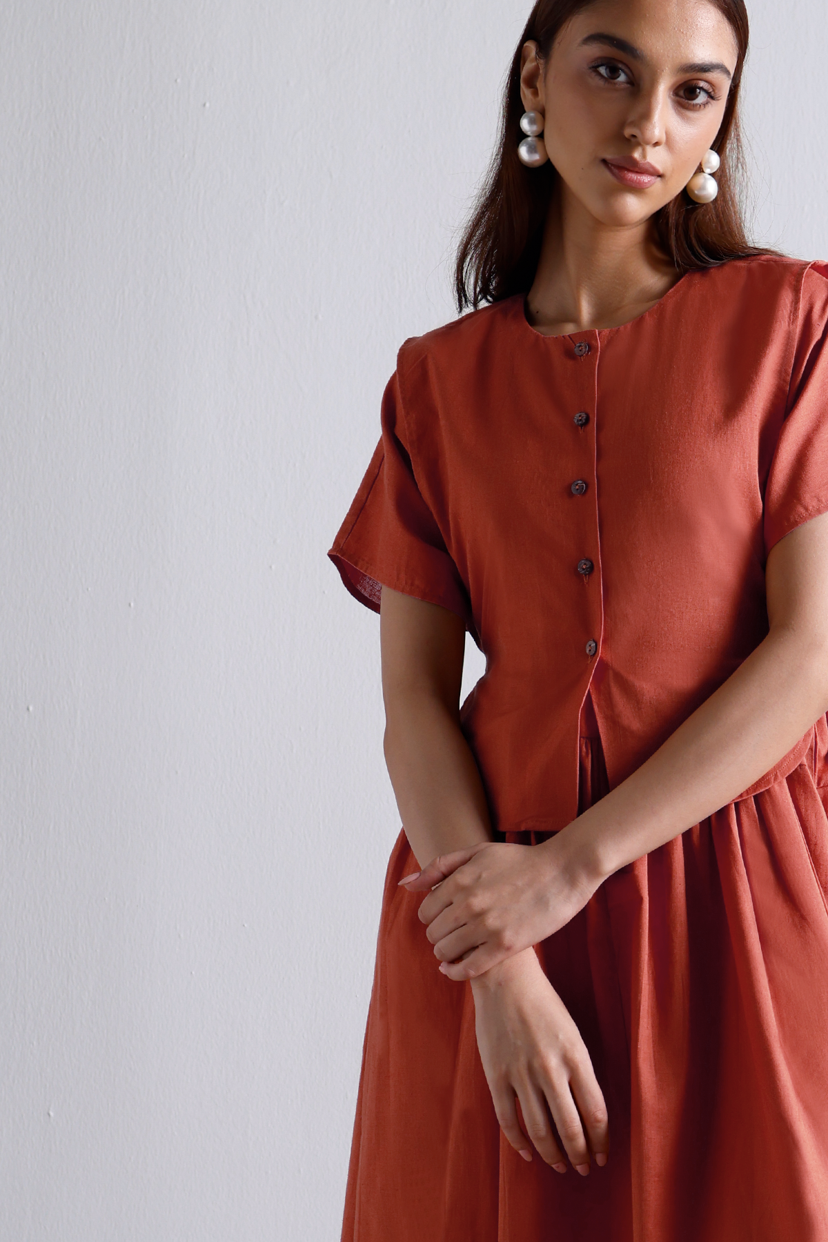 Built-in polish, zero styling effort. This Rust midi dress features a mock-layer overlay, soft gathers, and a tie-back detail that flatters from all angles. It's giving: graceful, grounded, and totally in charge. Bonus? It goes with your favorite flats and your favorite excuses to cancel plans.