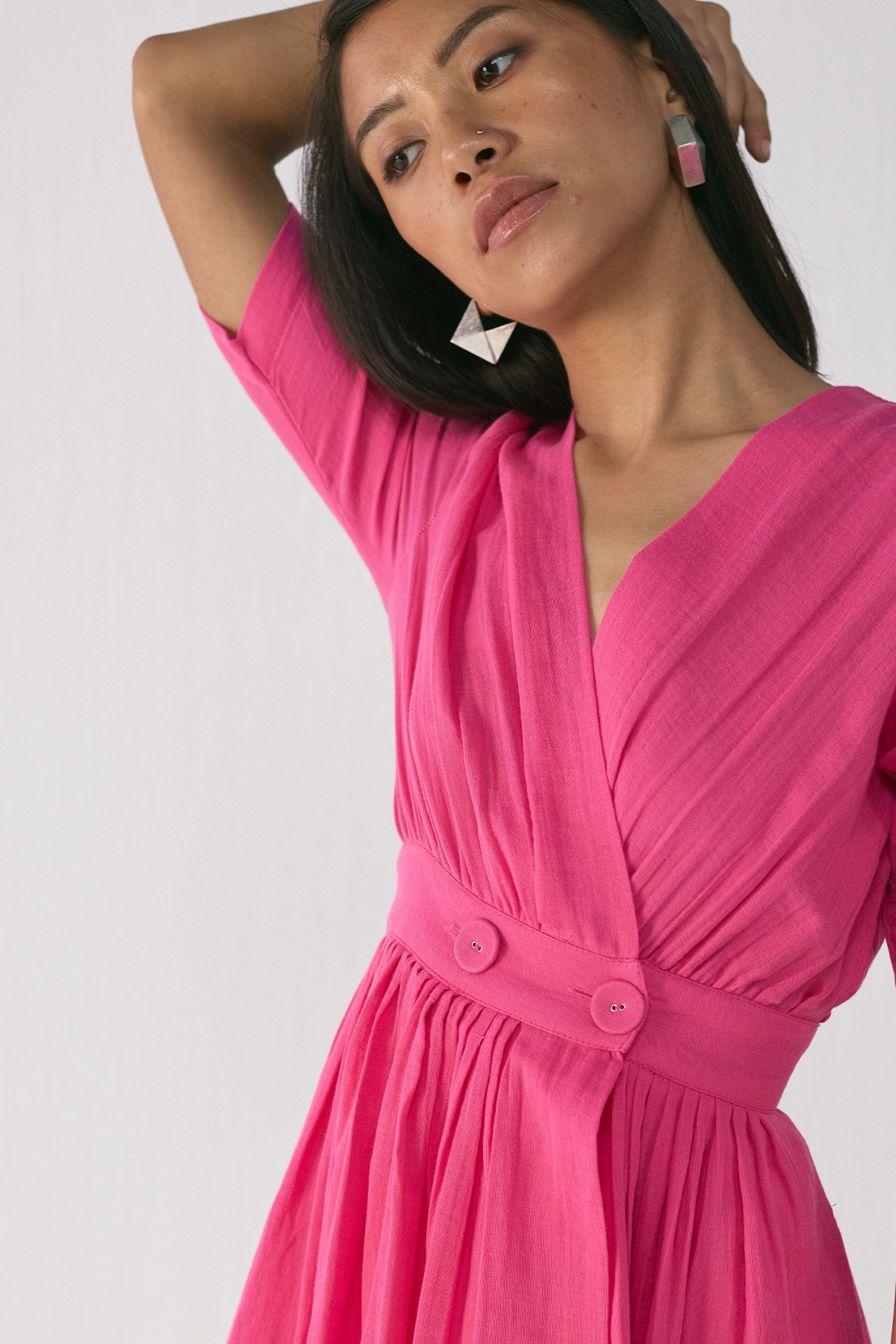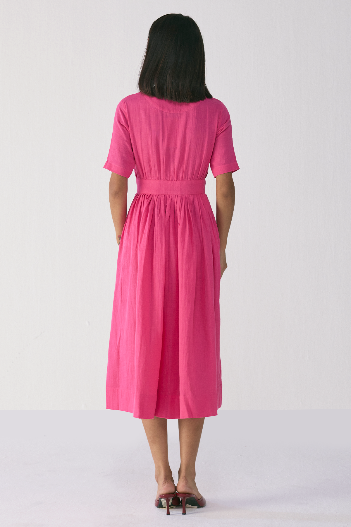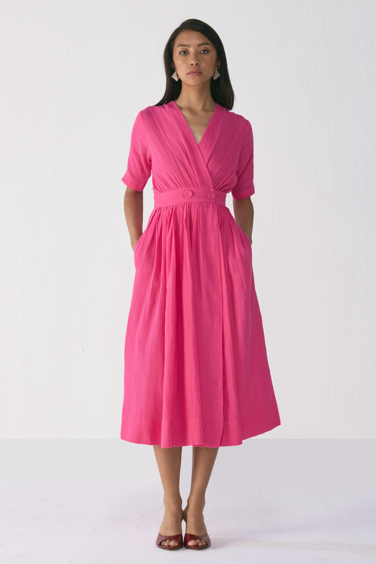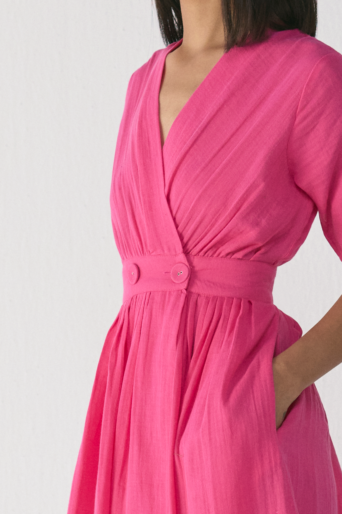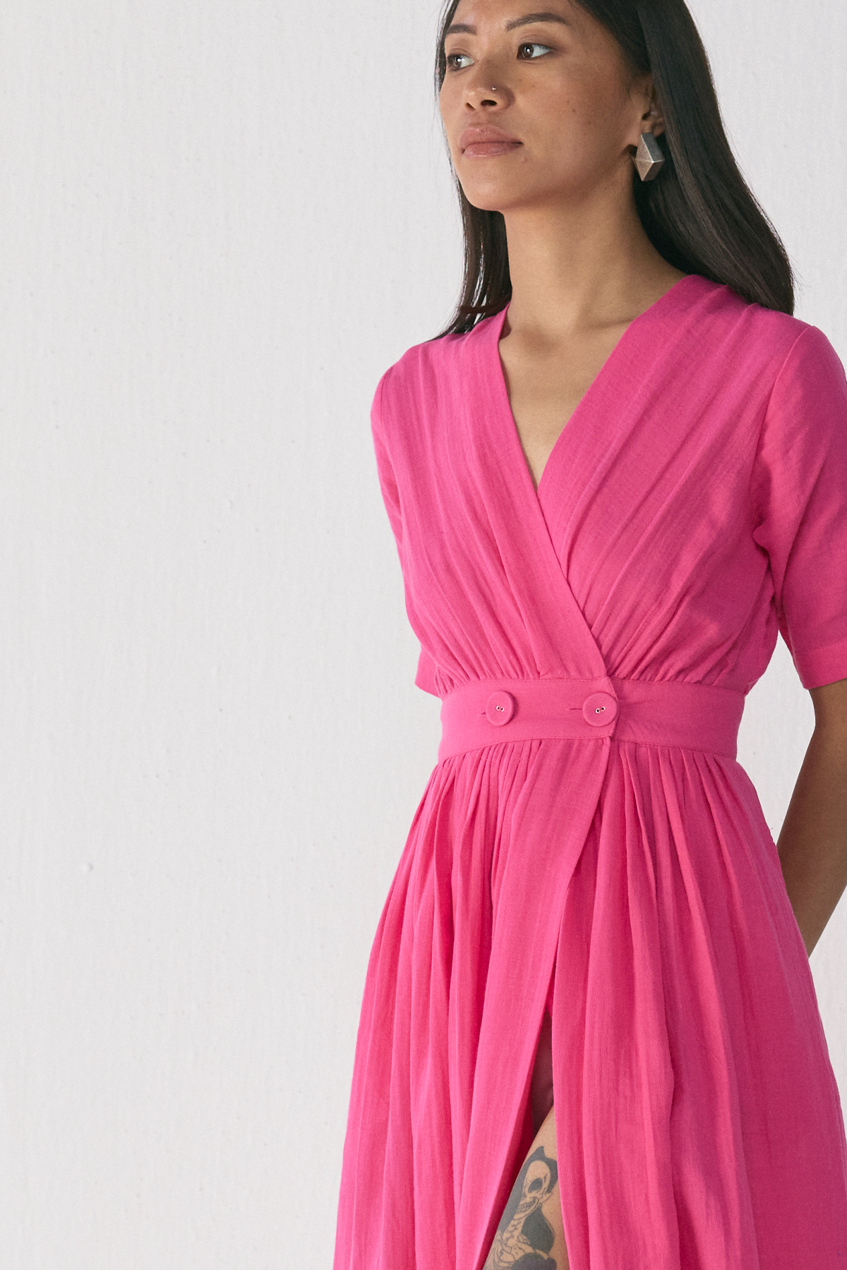 Soft, swishy, and unapologetically feminine. This fuscia gauze midi flows like a daydream, with pleats that flatter and a waist that knows what it’s doing. Lightweight but luxe, this one’s made for those “just one more twirl” moments. Also: pockets.