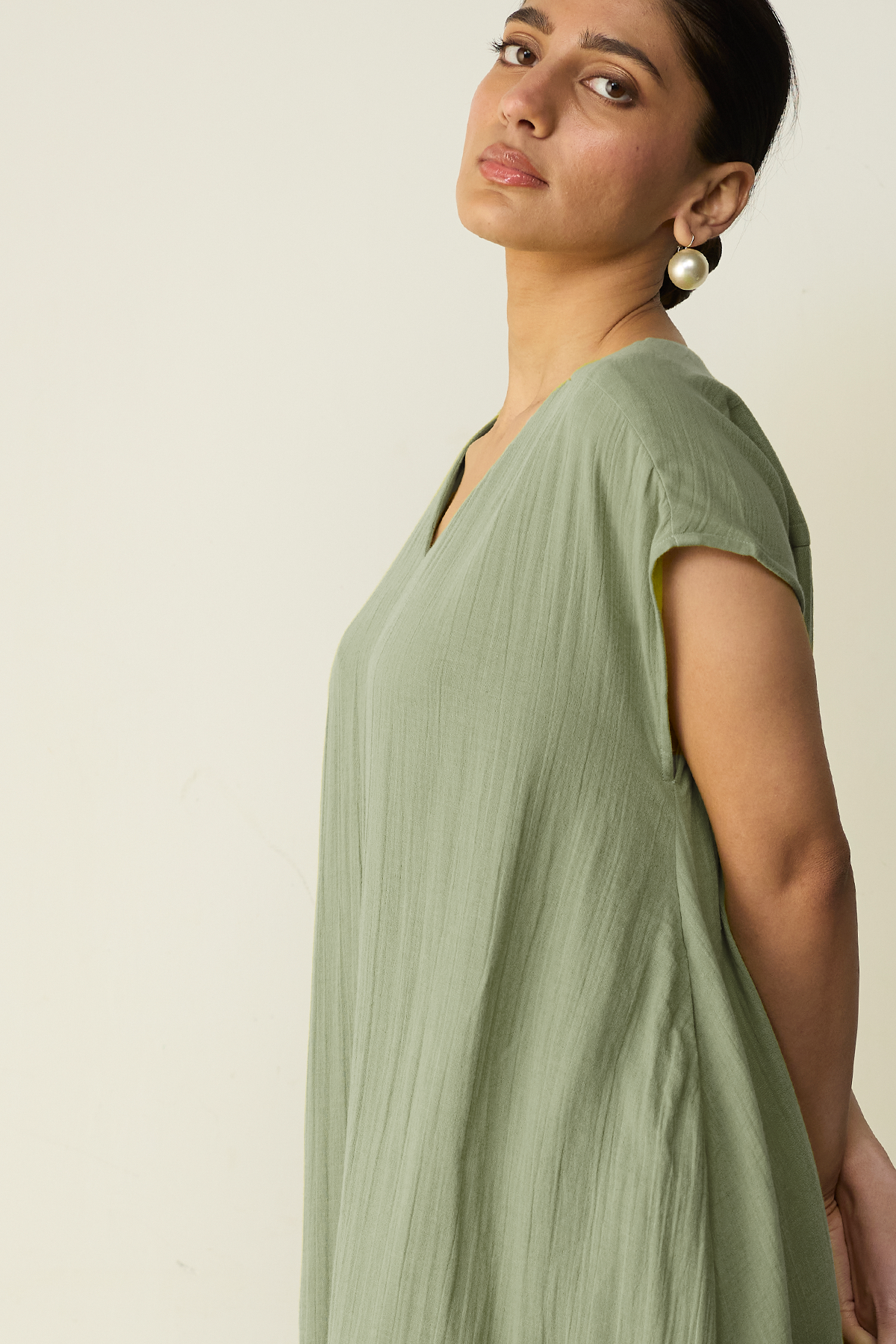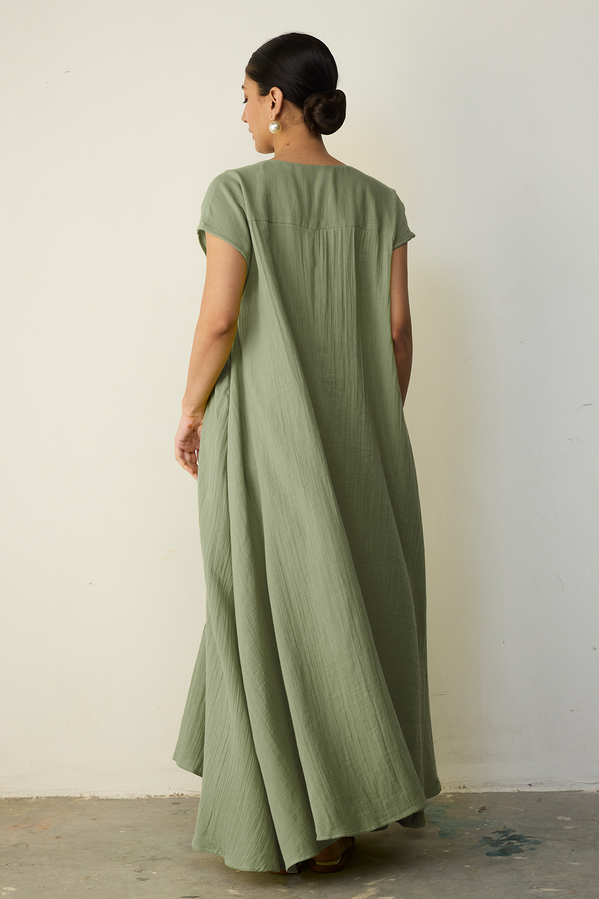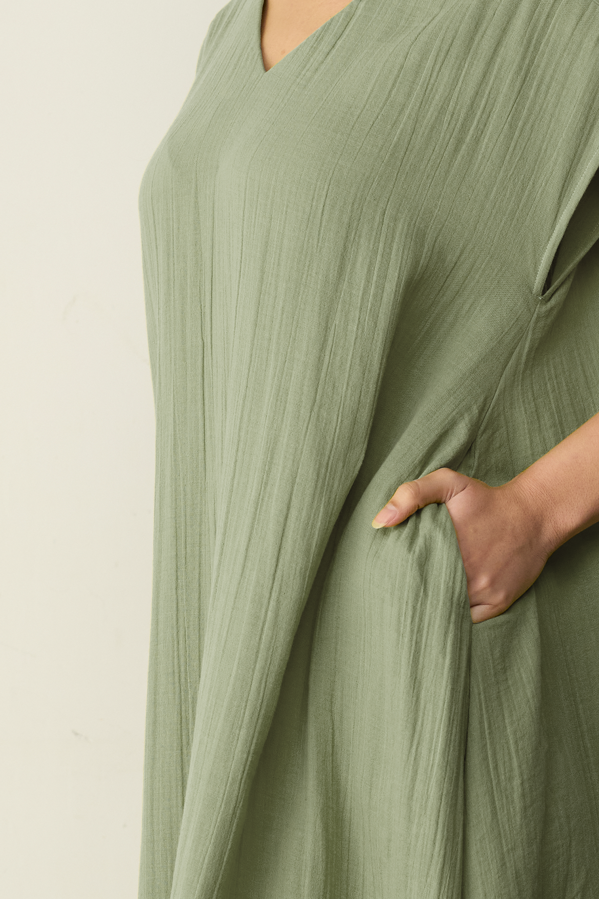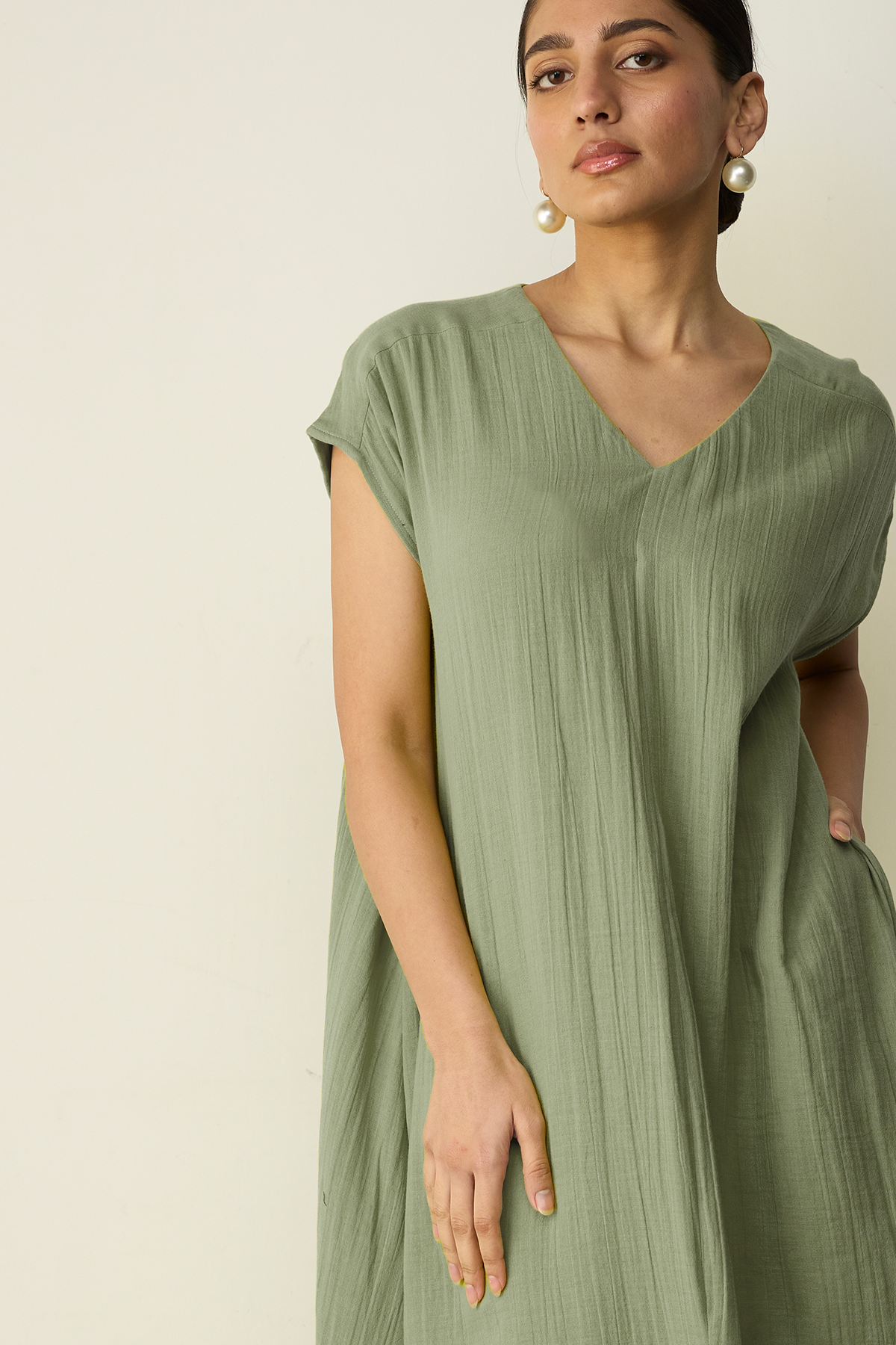 Soft drama, zero effort. This sage green V-neck maxi dress is cut in a relaxed A-line silhouette that drapes beautifully without clinging. Lightweight, breathable fabric keeps you comfortable from workdays to weekends. Finished with functional side pockets (because obviously). An easy, elegant everyday dress for women who want comfort, polish, and movement in one piece.