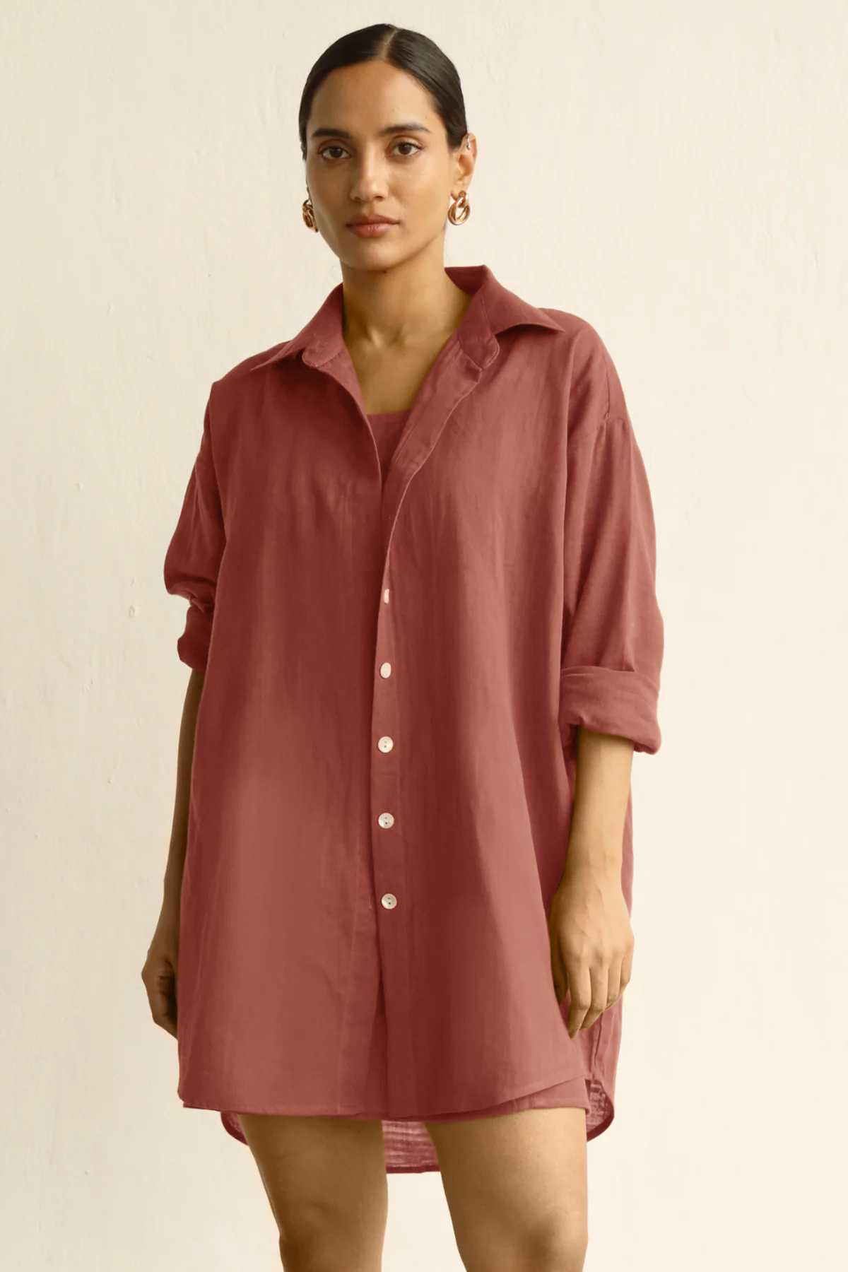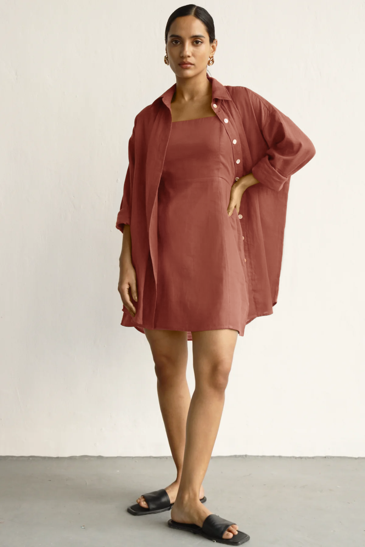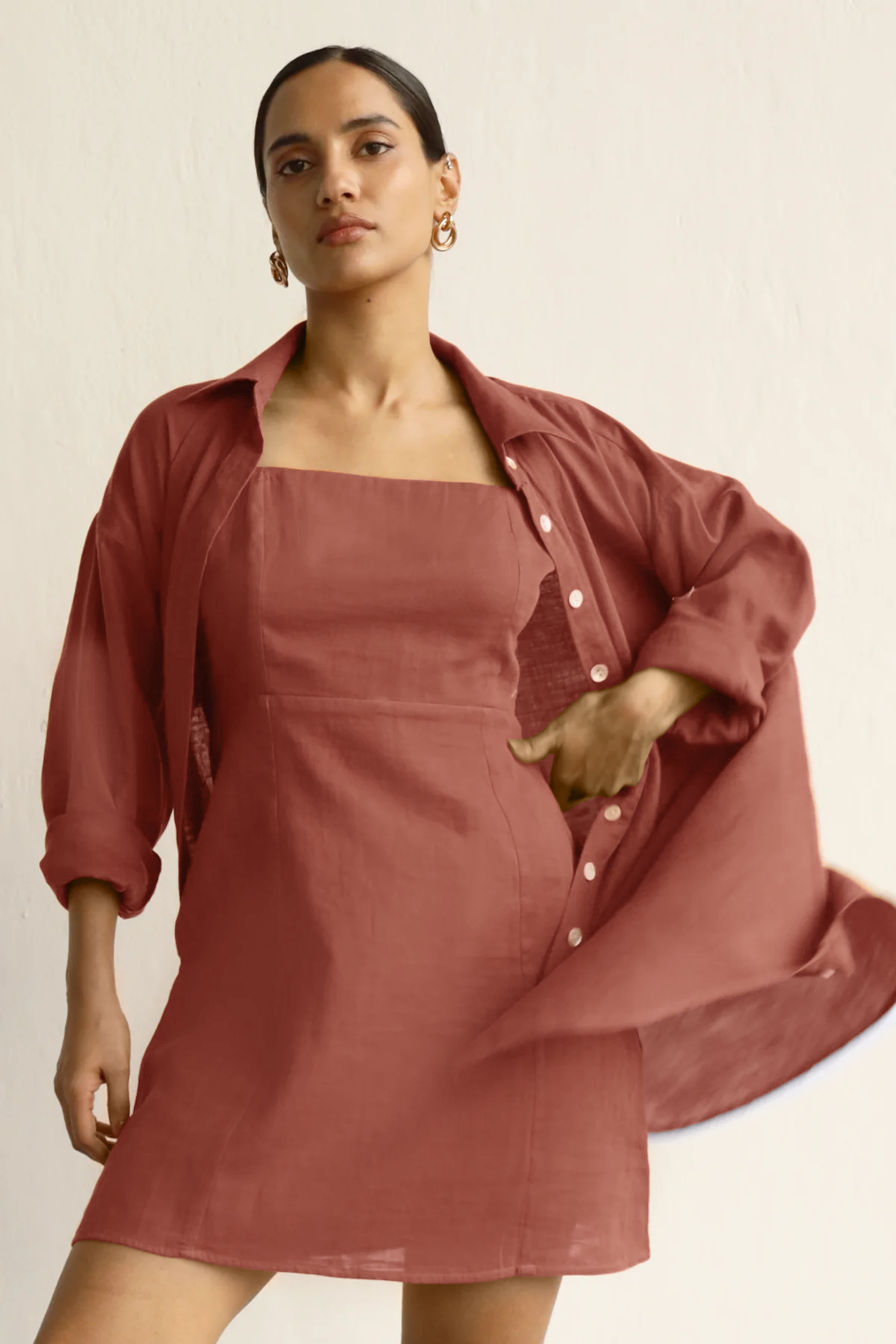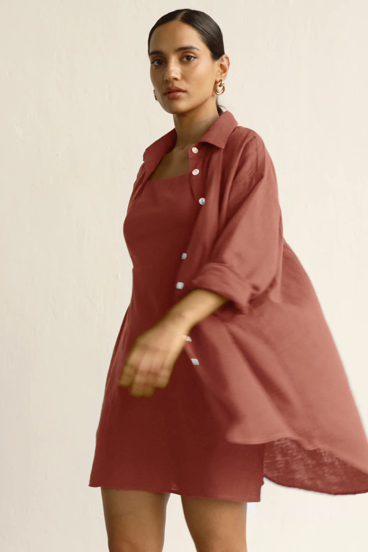 Minimal effort, maximum impact. A square-neck denim dress that hugs just right, layered with a floaty, oversized shirt for that nonchalant charm. Wear them together or break them up—your wardrobe, your rules. This co-ord is easy on the skin and strong on the style game.