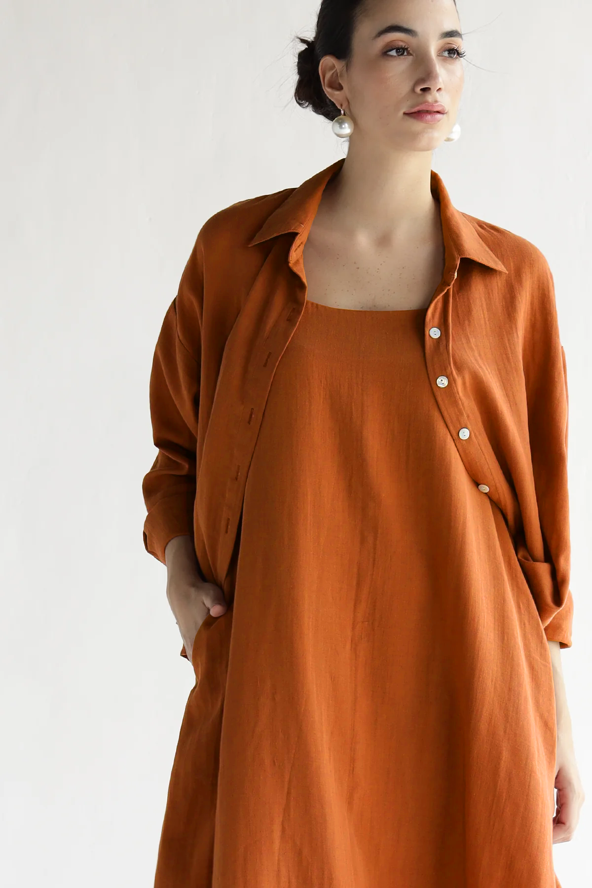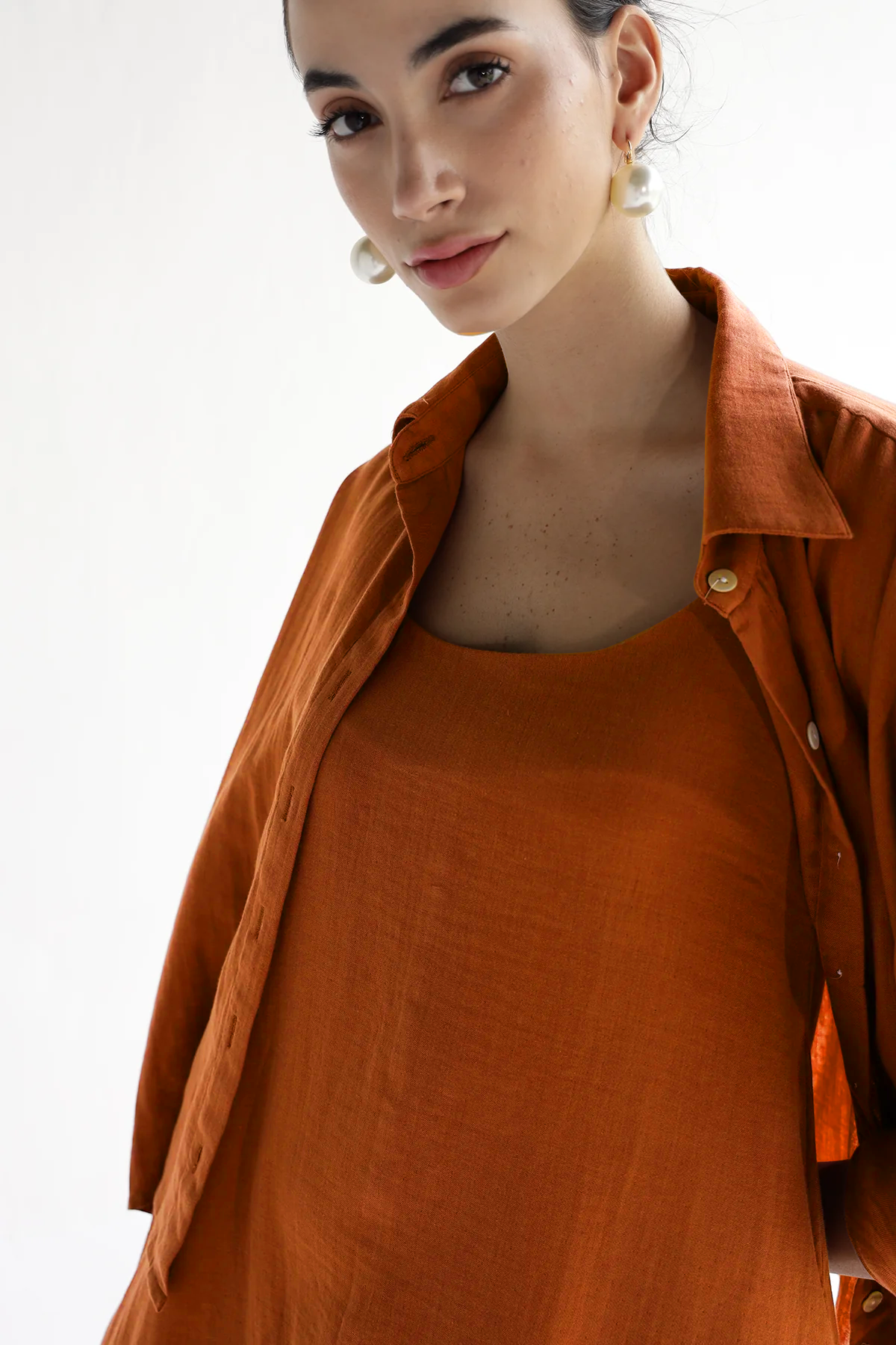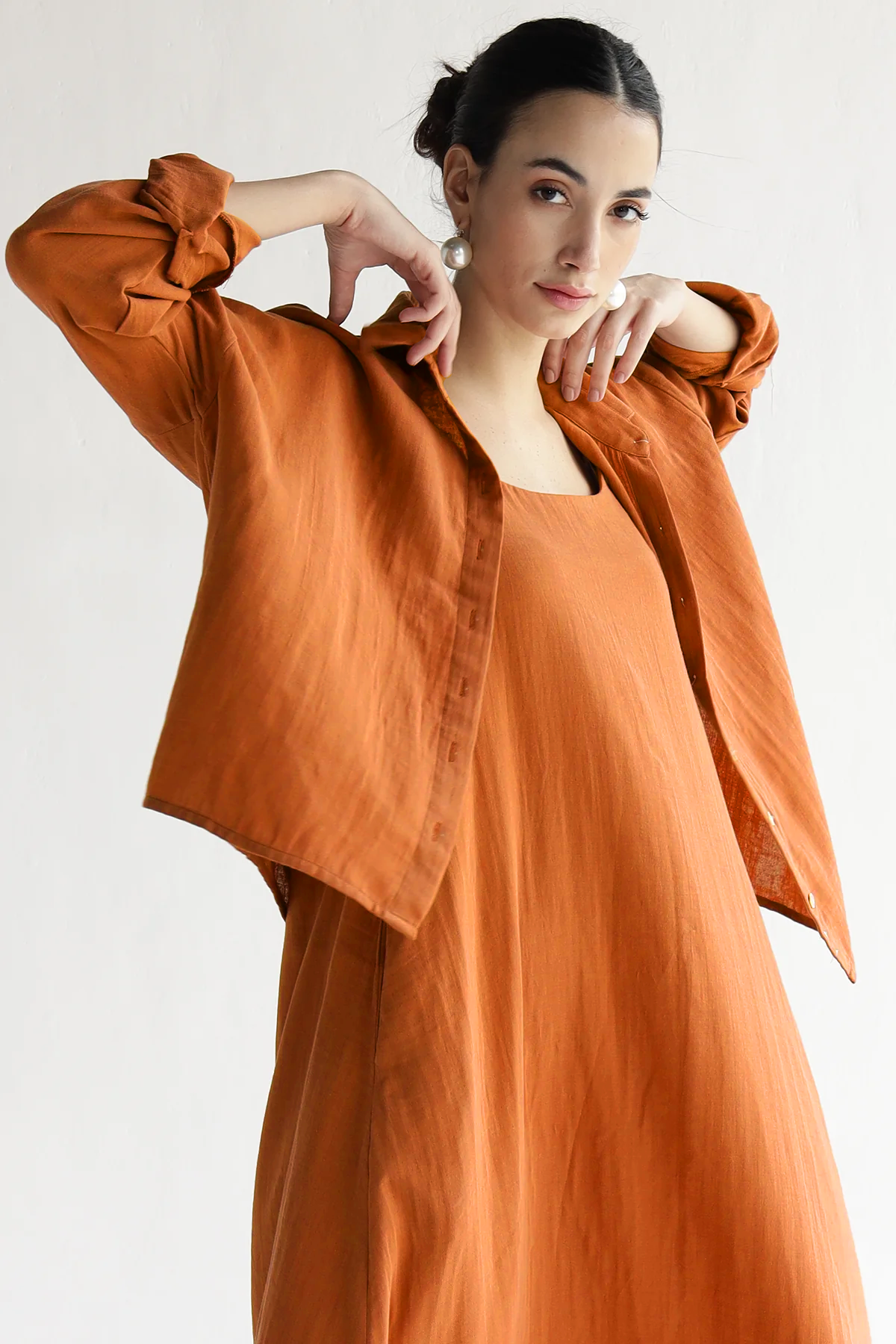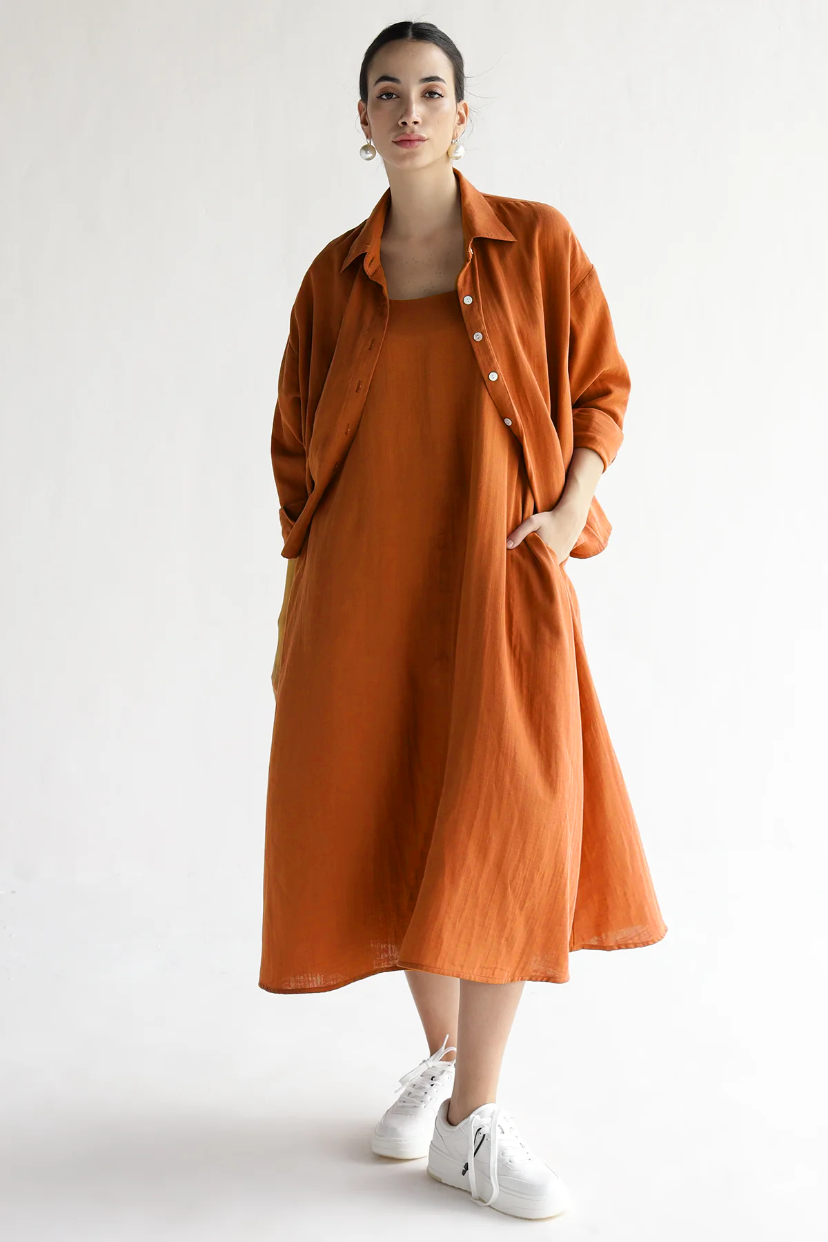 A slip dress co-ord set that moonlights as your getaway plan. Flowy, flattering, and crafted in 100% Cotton, it pairs with anything—especially the matching shirt. Breezy enough for errands, polished enough for dinner. Basically, your summer solution in one set.