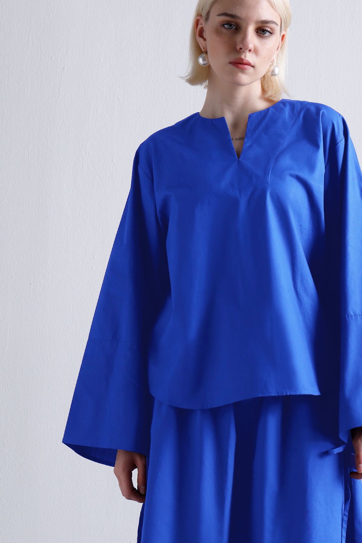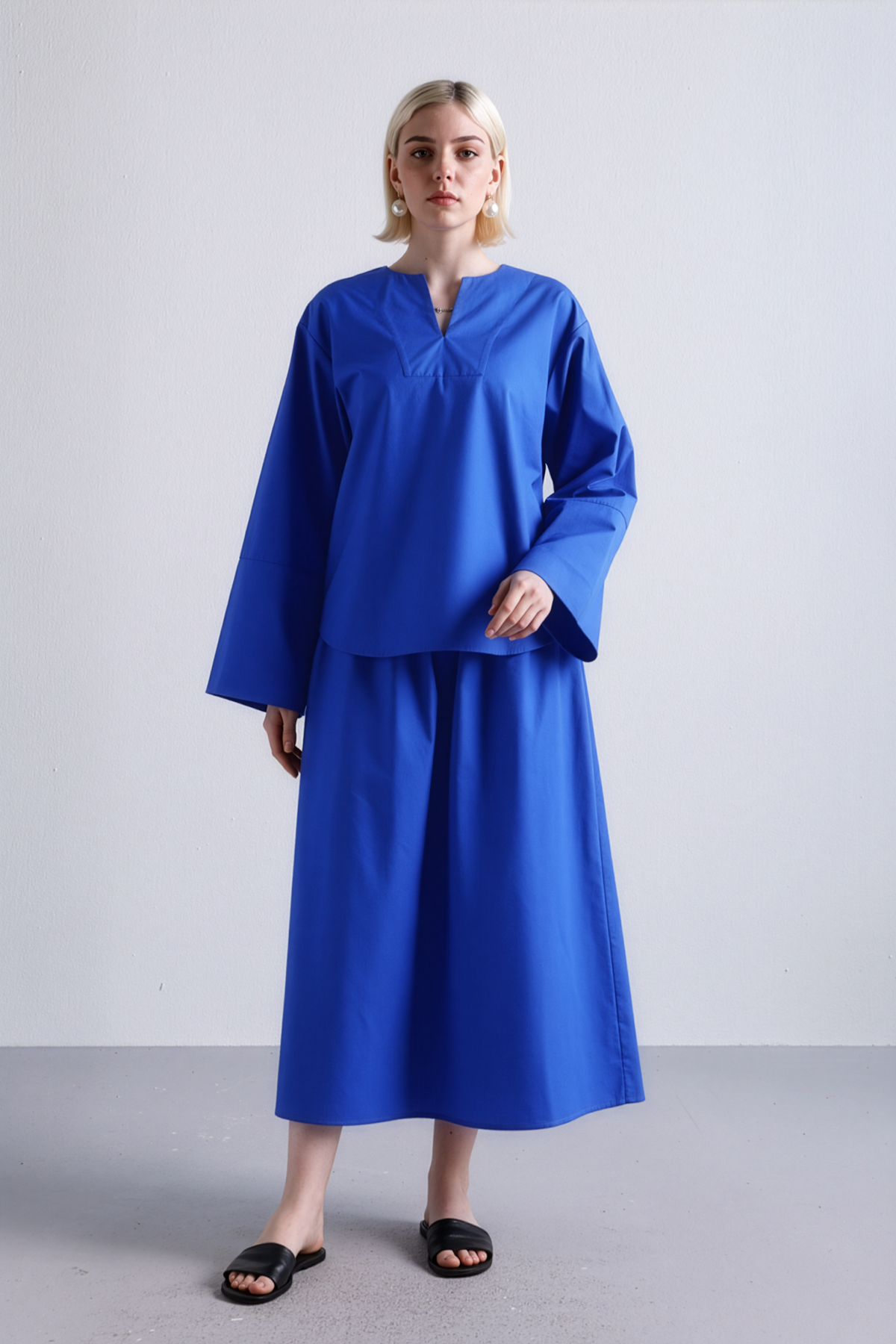Zero effort, full effect. This oversized V-neck top and drawstring skirt set in indigo gives major main character energy—without trying too hard. The wide sleeves? Built-in drama. The relaxed fit? Made for that don’t-rush-me mood. Pair it with slides, pearls, or your best RBF. You're the moment.