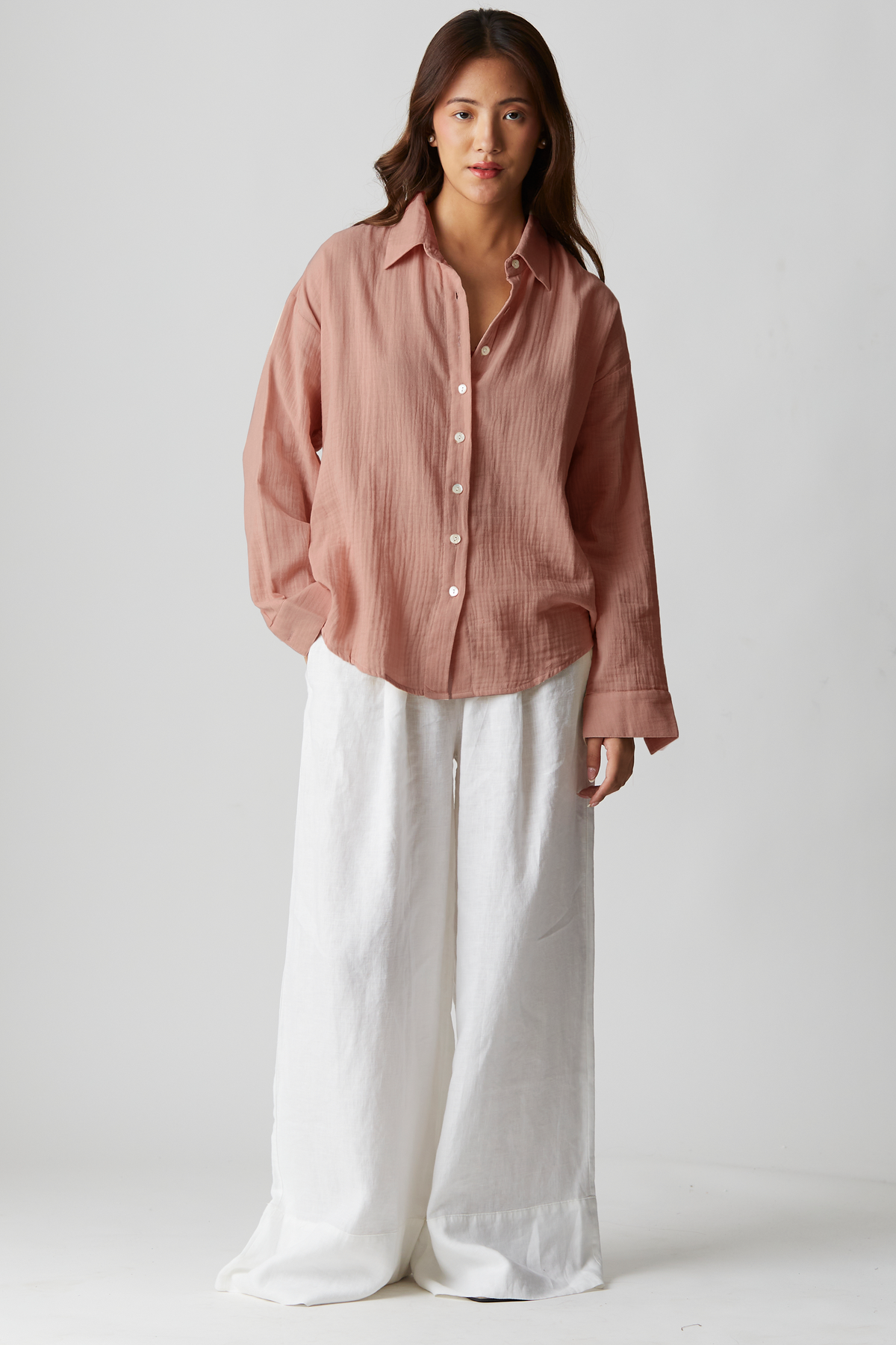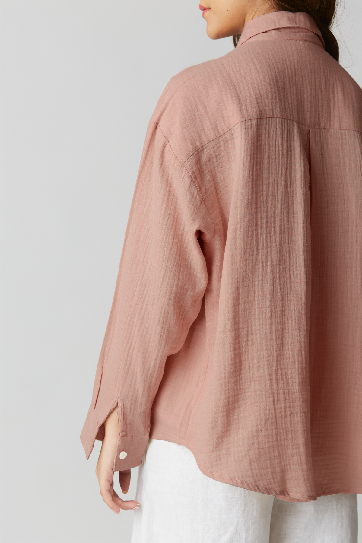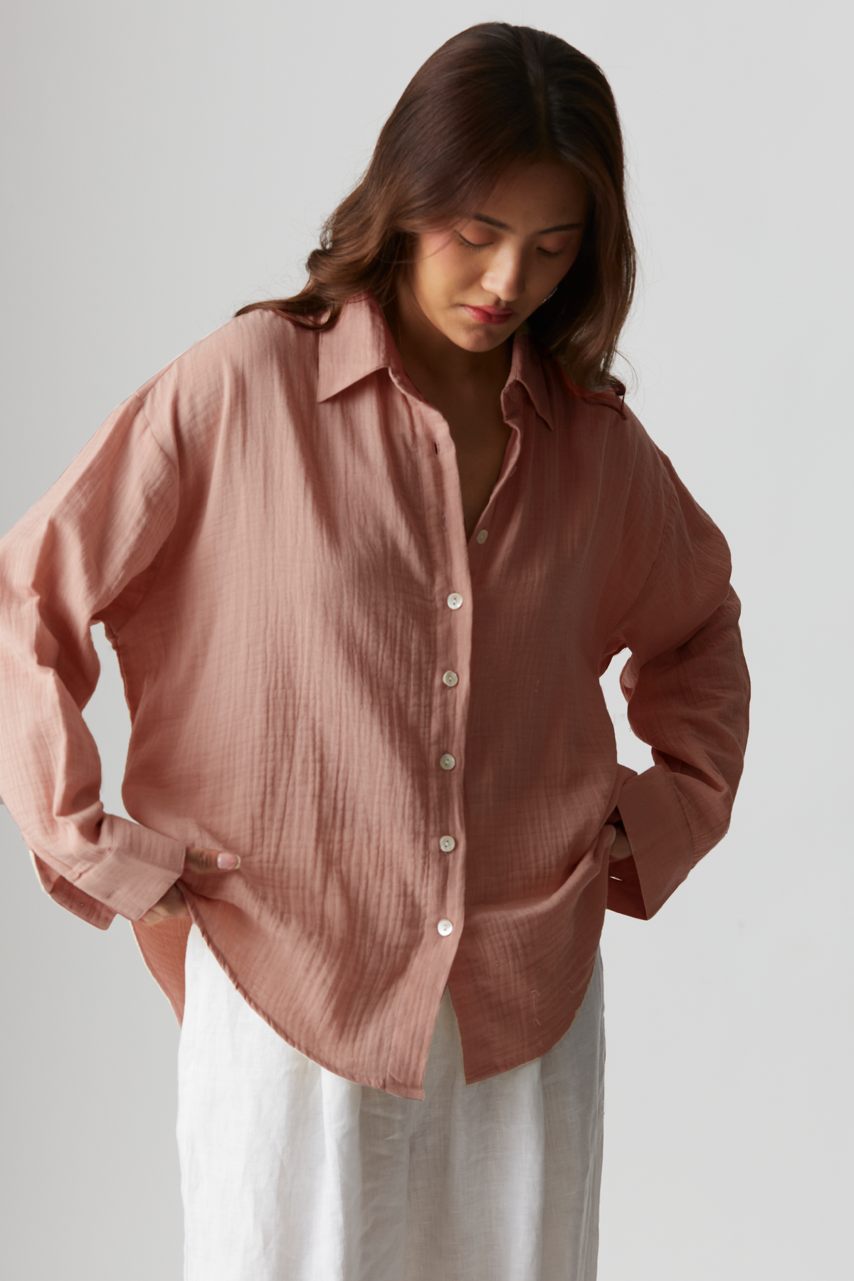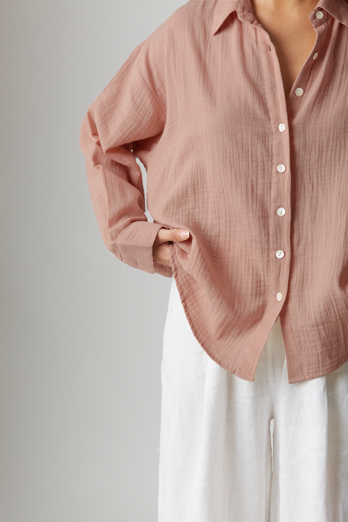 Soft, oversized, and a little flirty. This rose dust shirt is made from lightweight double cotton gauze that’s breathable enough for the heat and cozy enough for late-night plans. Button it up or leave it loose over wide-leg whites—it’s your wear-everywhere, nap-anywhere essential.