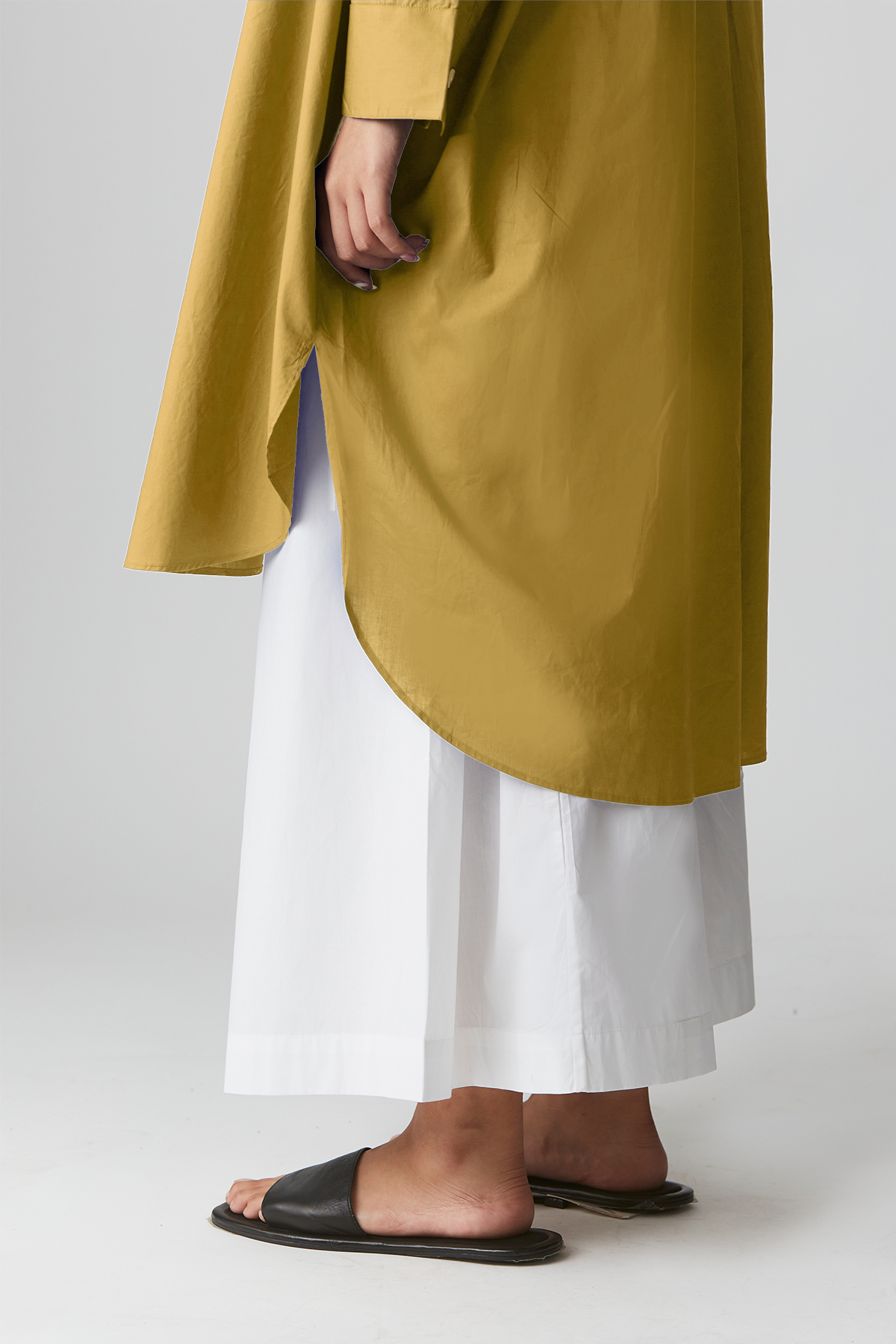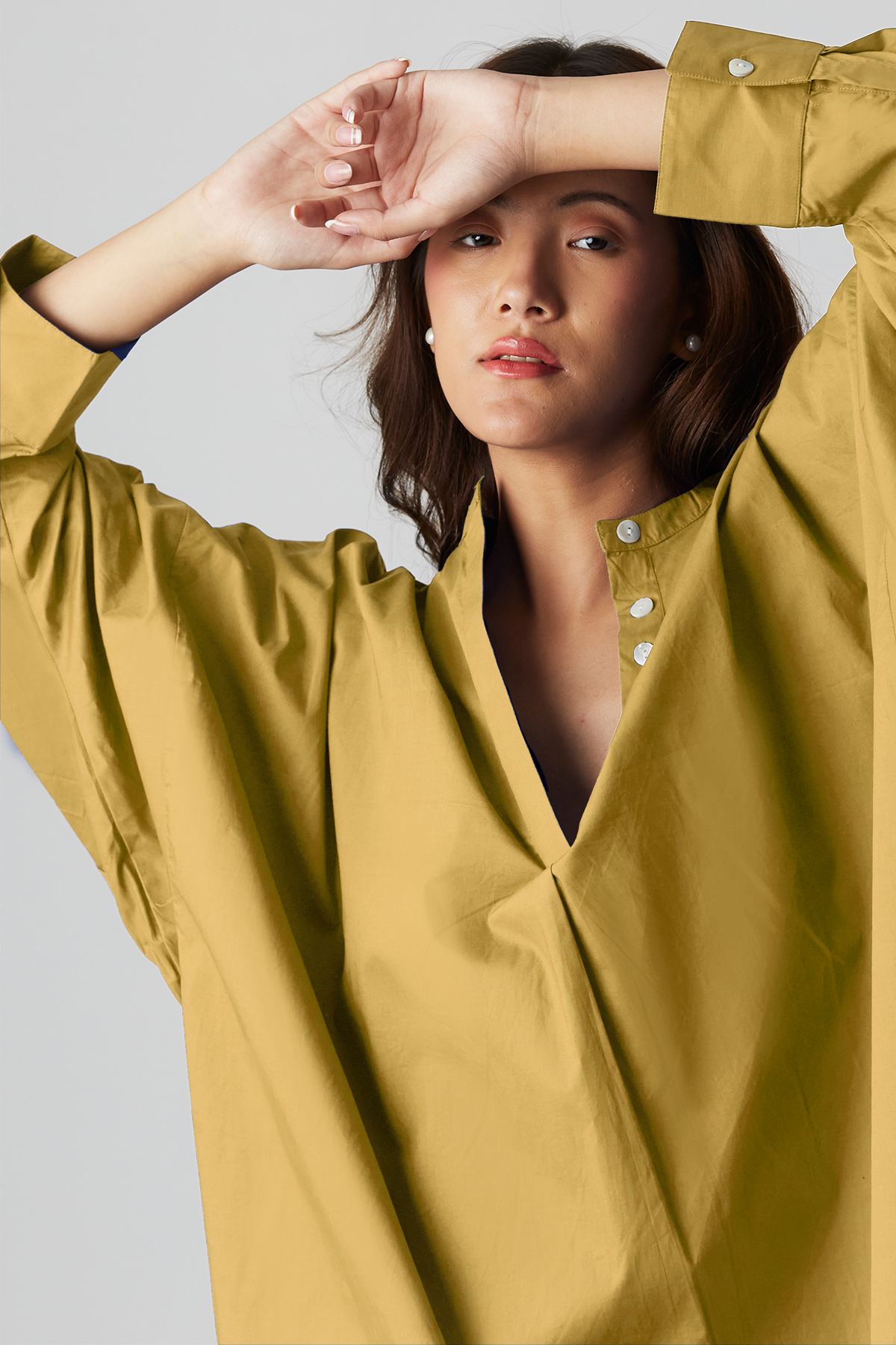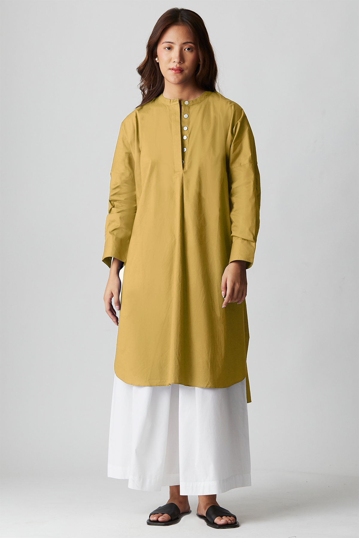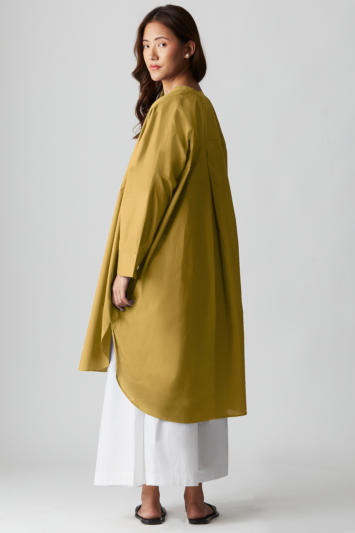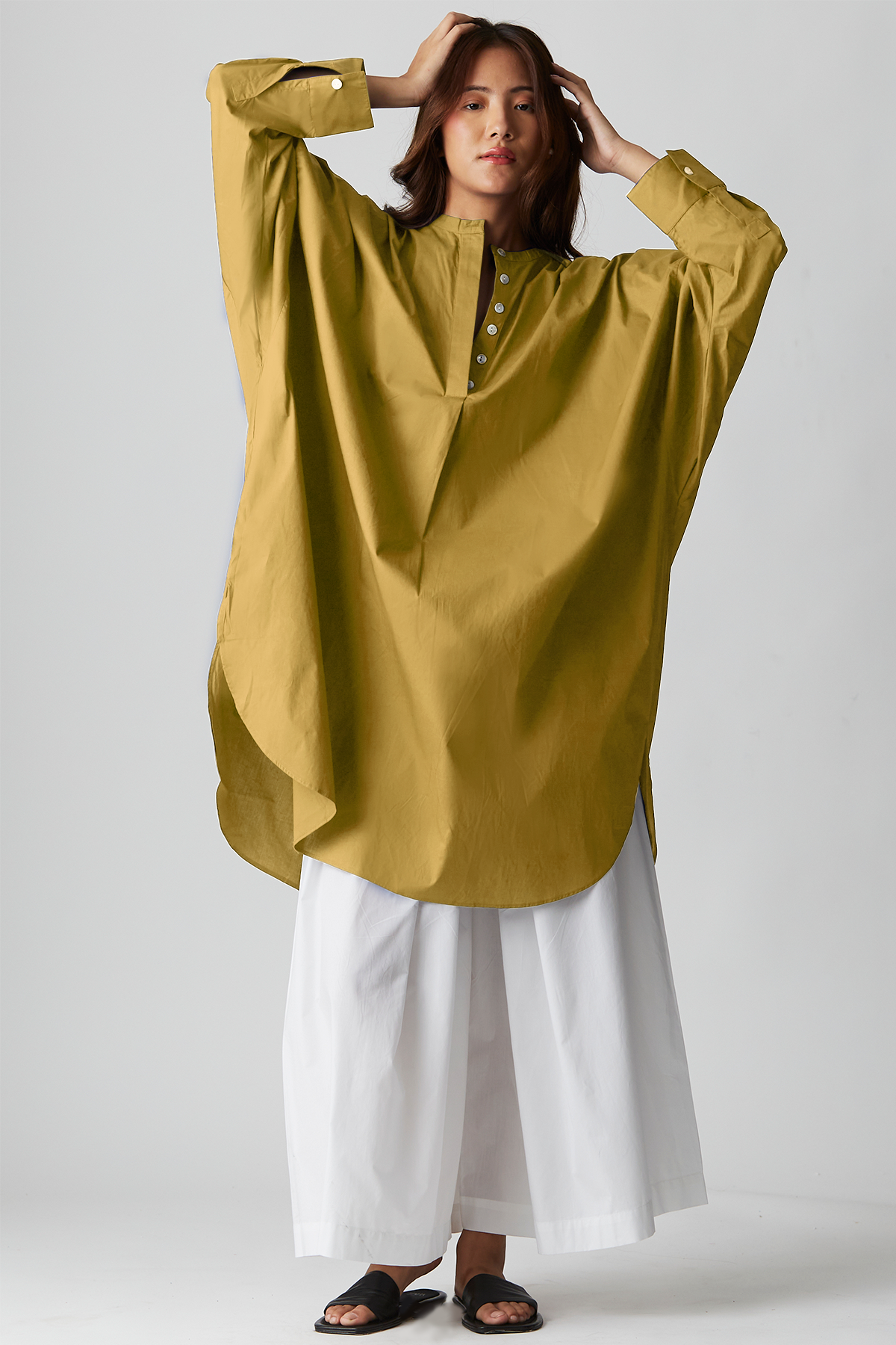 Ochre Mist longline tunic with a mandarin collar and button placket. Features relaxed drop shoulders, wide sleeves, and a high-low hem for an easy, flowy silhouette. Lightweight and minimal—perfect for layering or pairing with wide-leg trousers.