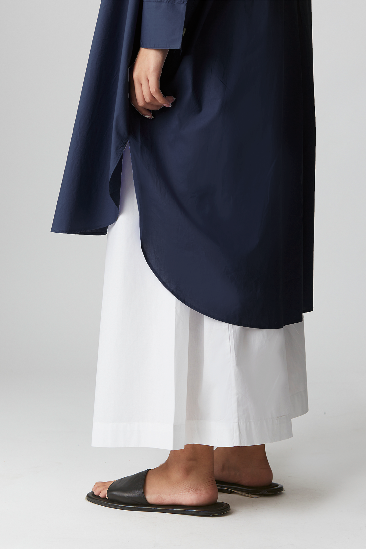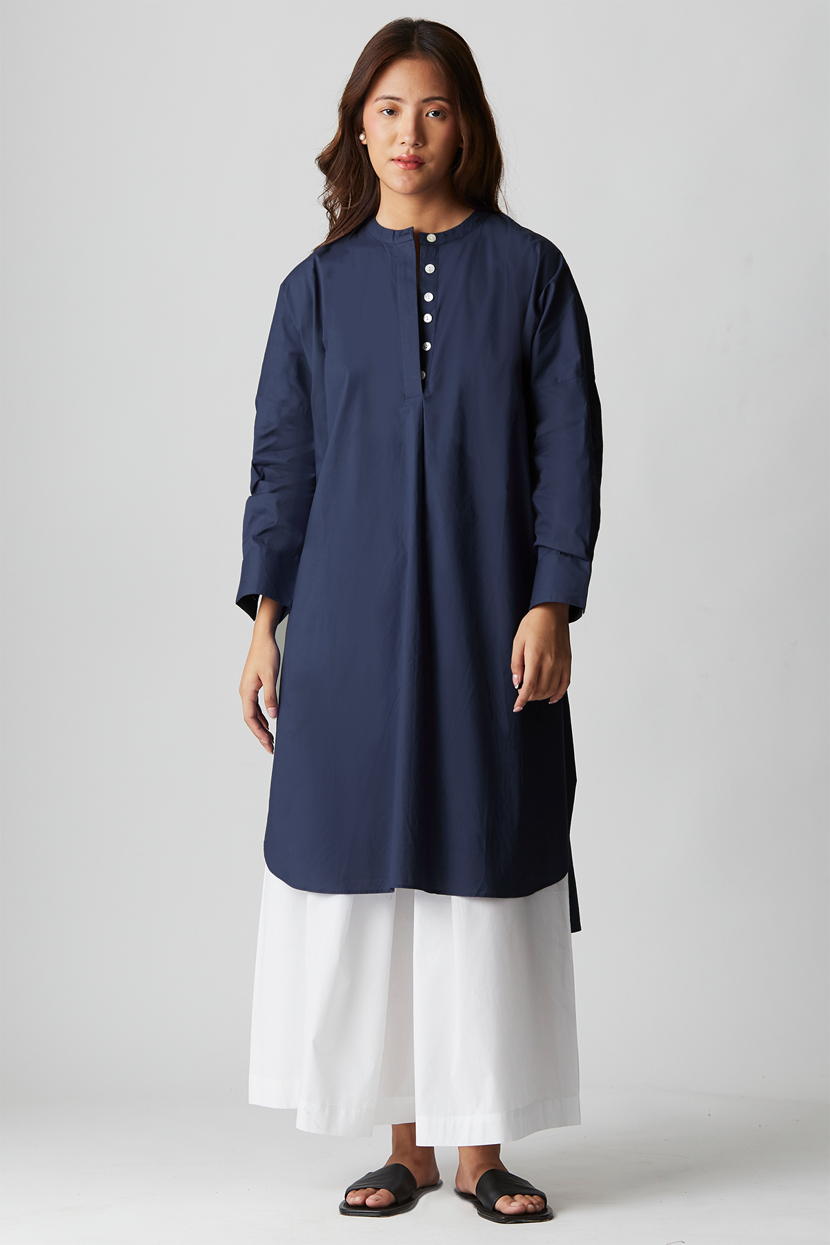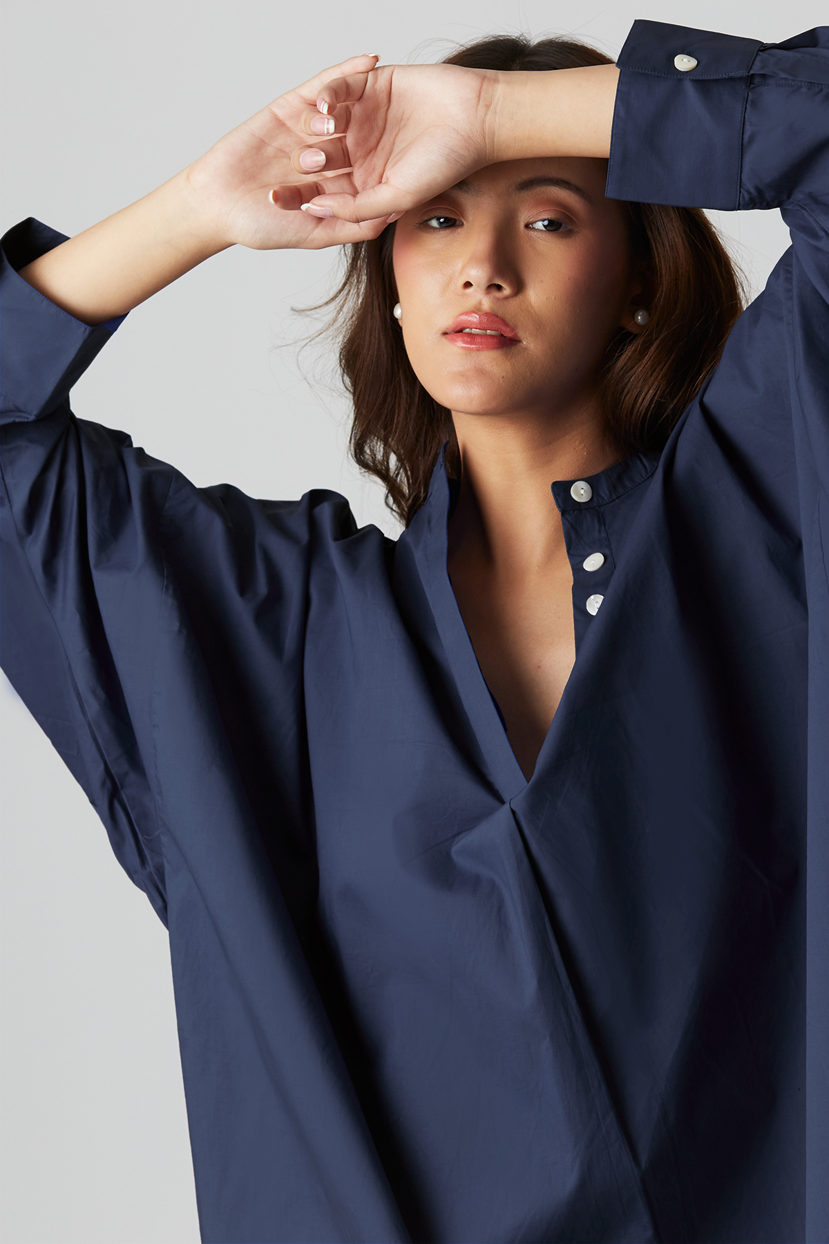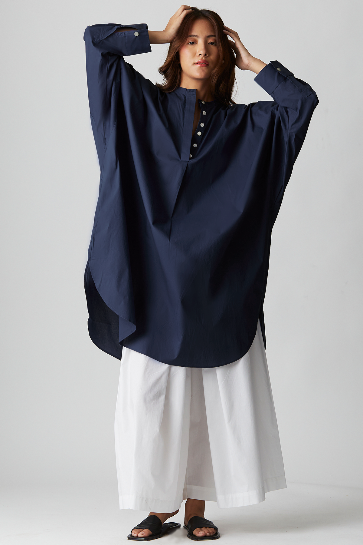 Prussian blue longline tunic with a mandarin collar and button placket. Features relaxed drop shoulders, wide sleeves, and a high-low hem for an easy, flowy silhouette. Lightweight and minimal—perfect for layering or pairing with wide-leg trousers.