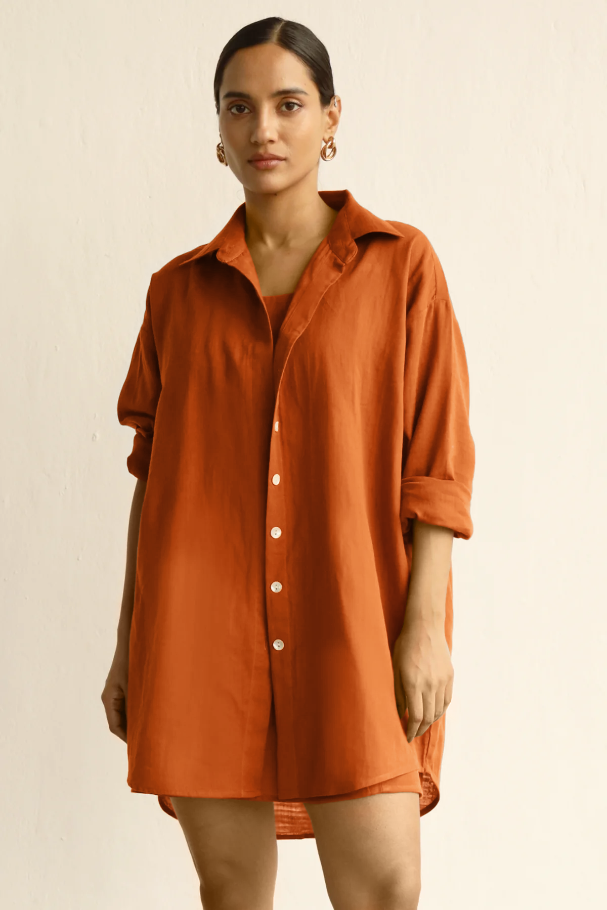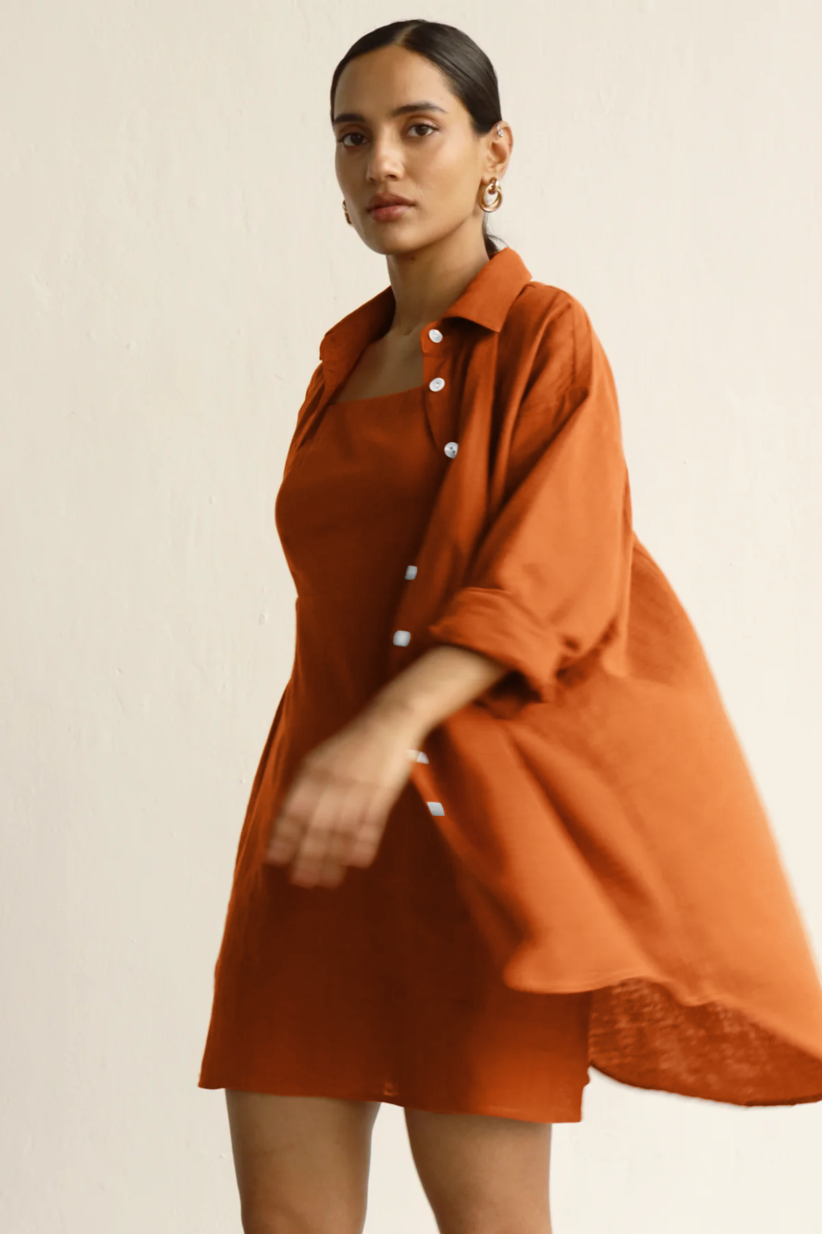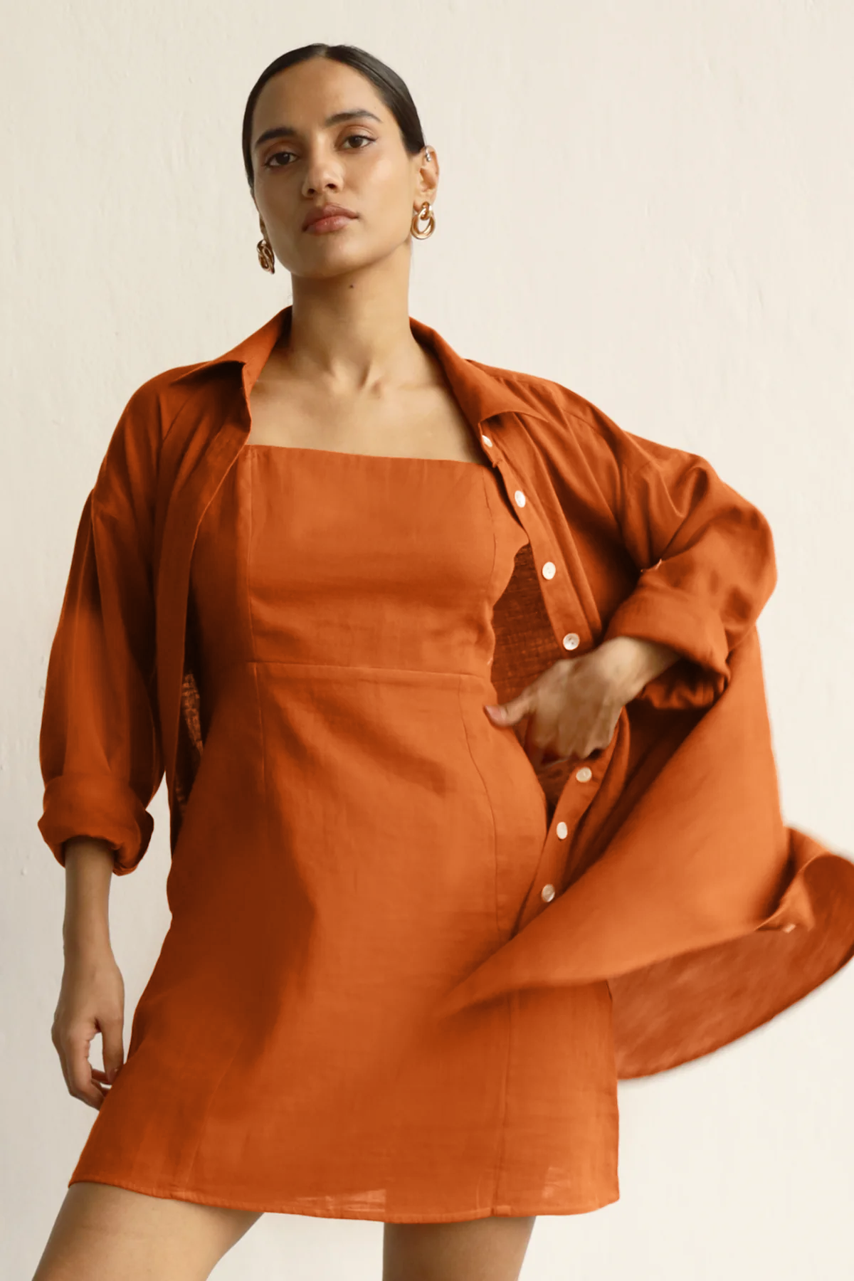 Minimal effort, maximum impact. A square-neck linen dress that hugs just right, layered with a floaty, oversized shirt for that nonchalant charm. Wear them together or break them up—your wardrobe, your rules. This co-ord is easy on the skin and strong on the style game.