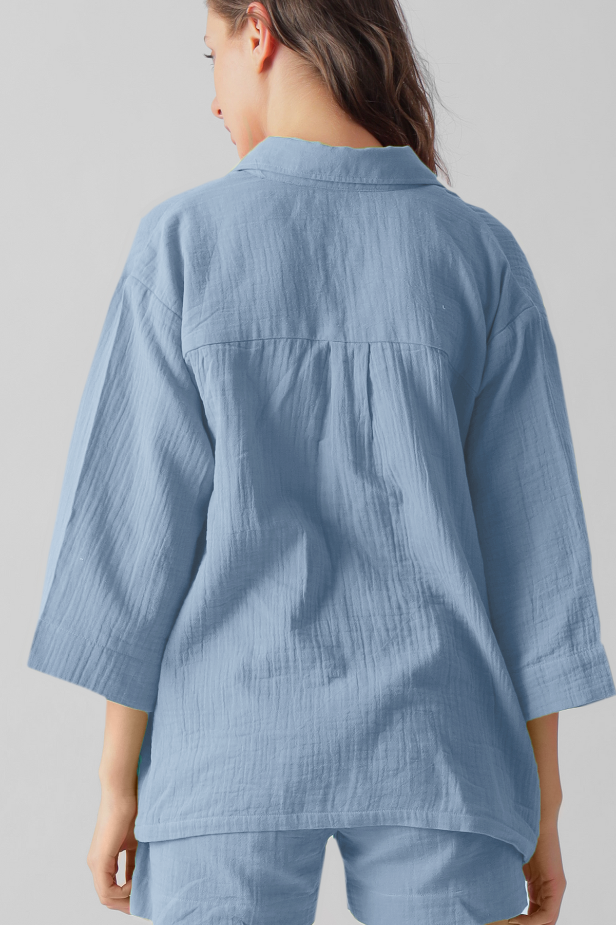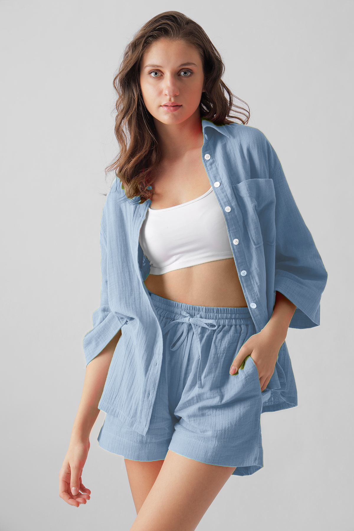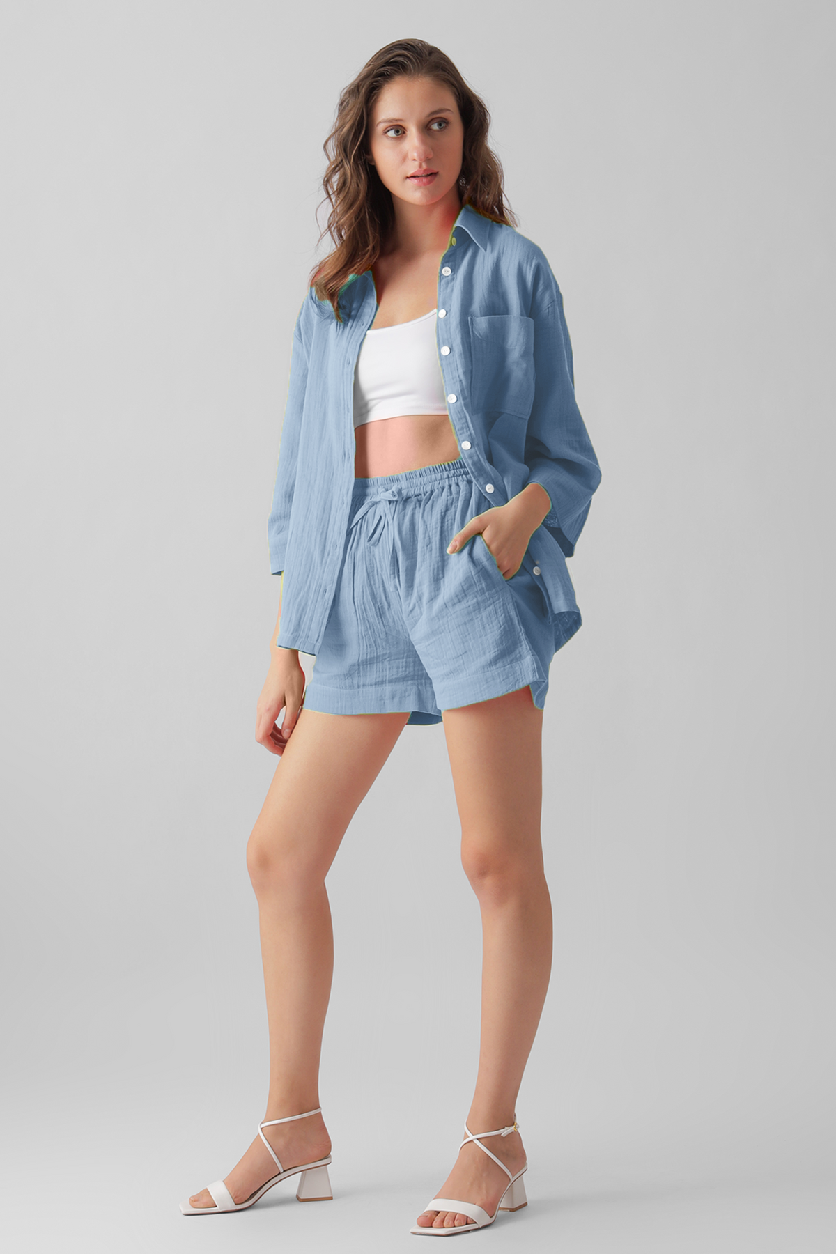 Because subtle was never your thing. This lume blue co-ord is crisp, cool, and ready for anything. Button-down shirt, comfy shorts, and a color that says, “Look at me (in a good way).” Perfect for busy days or just feeling fabulous.