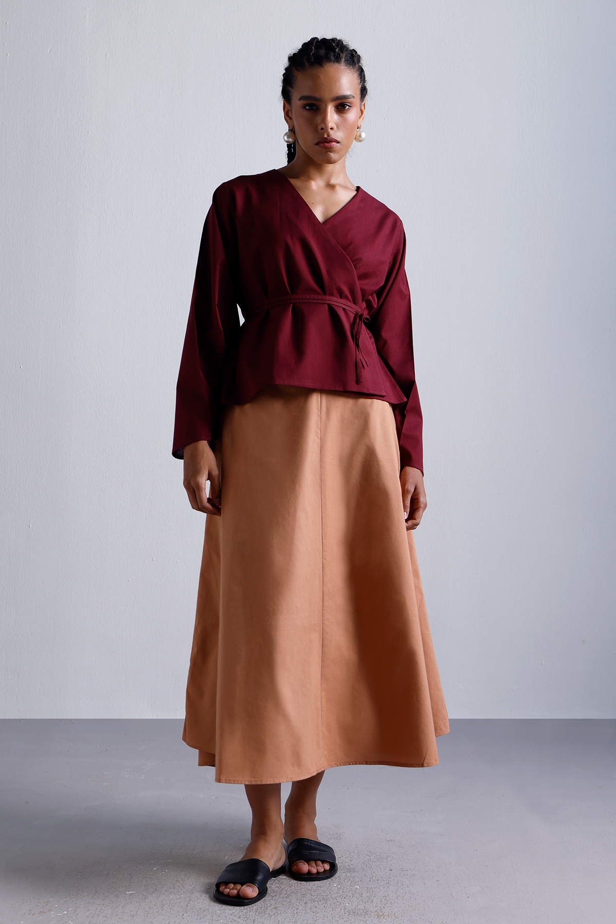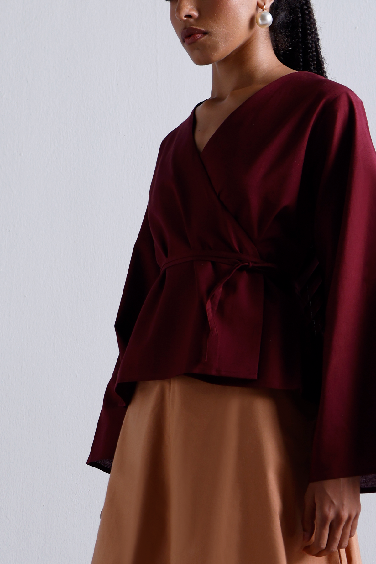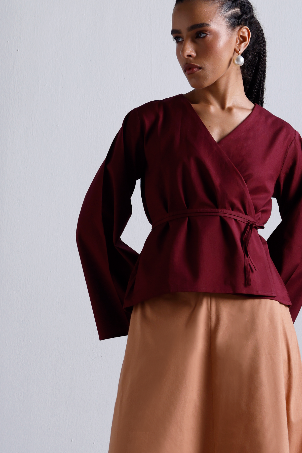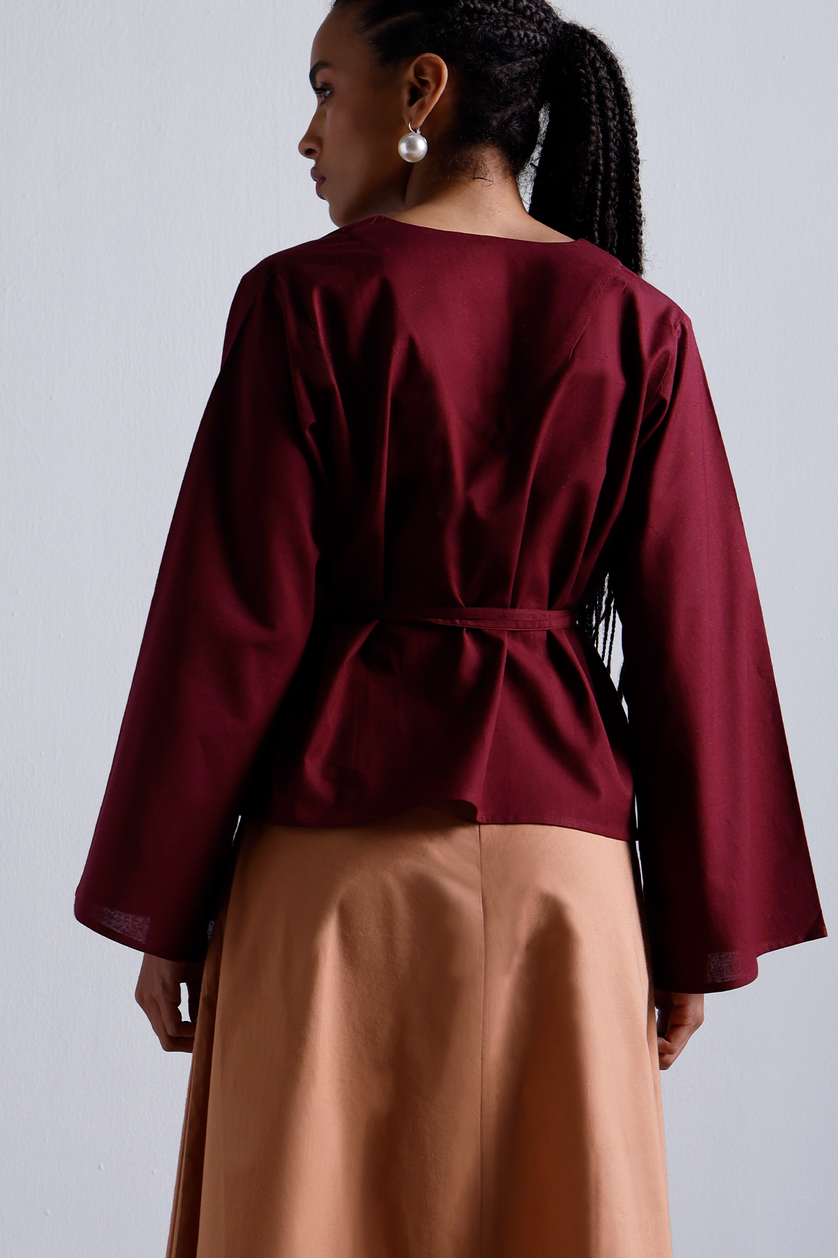 Wrap it up, but make it chic. This merlot top cinches at the waist with a tie so subtle it whispers "effortless." Flowy bell sleeves keep it breezy, and the tailored silhouette makes it work with everything—from palazzos to power meetings.
