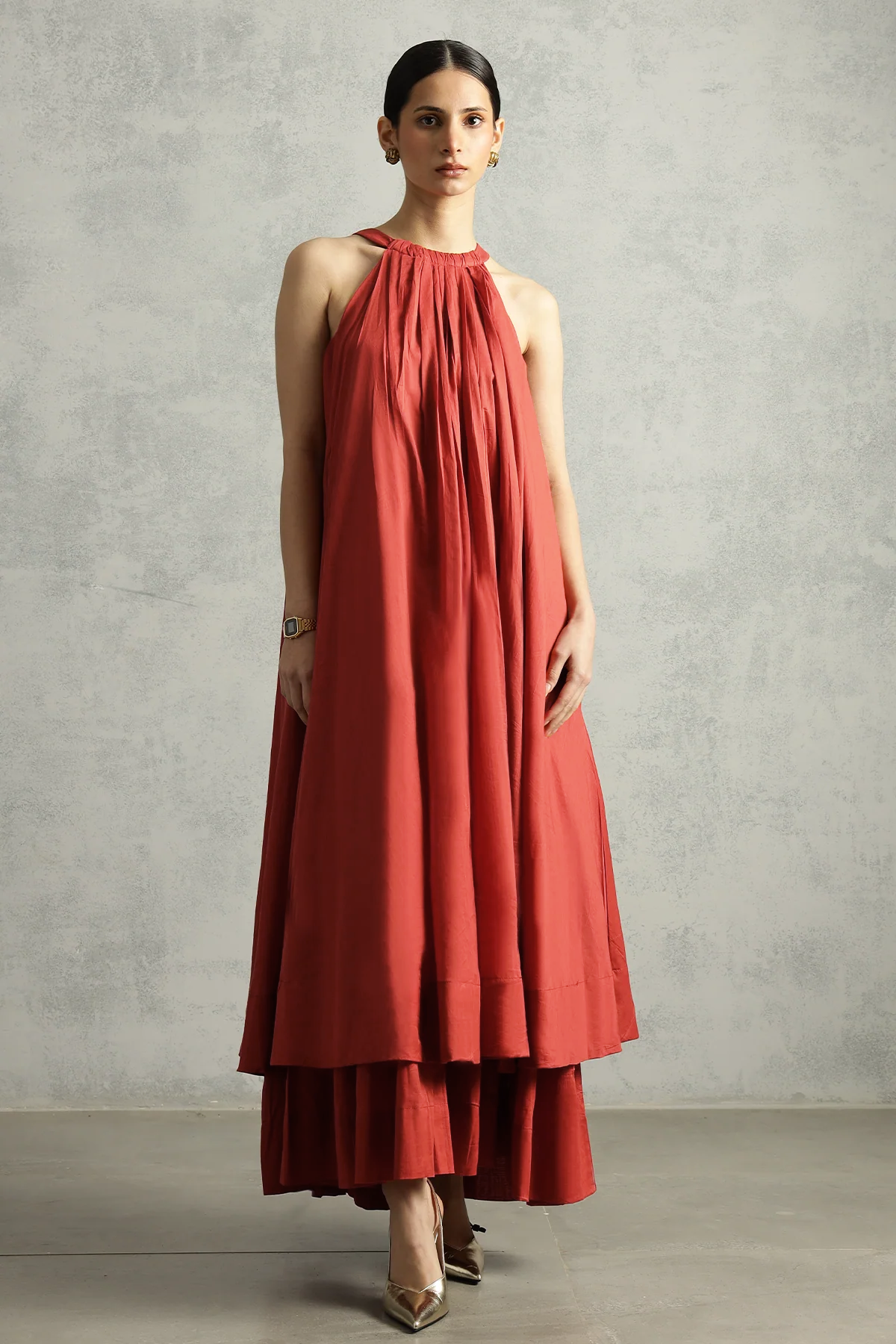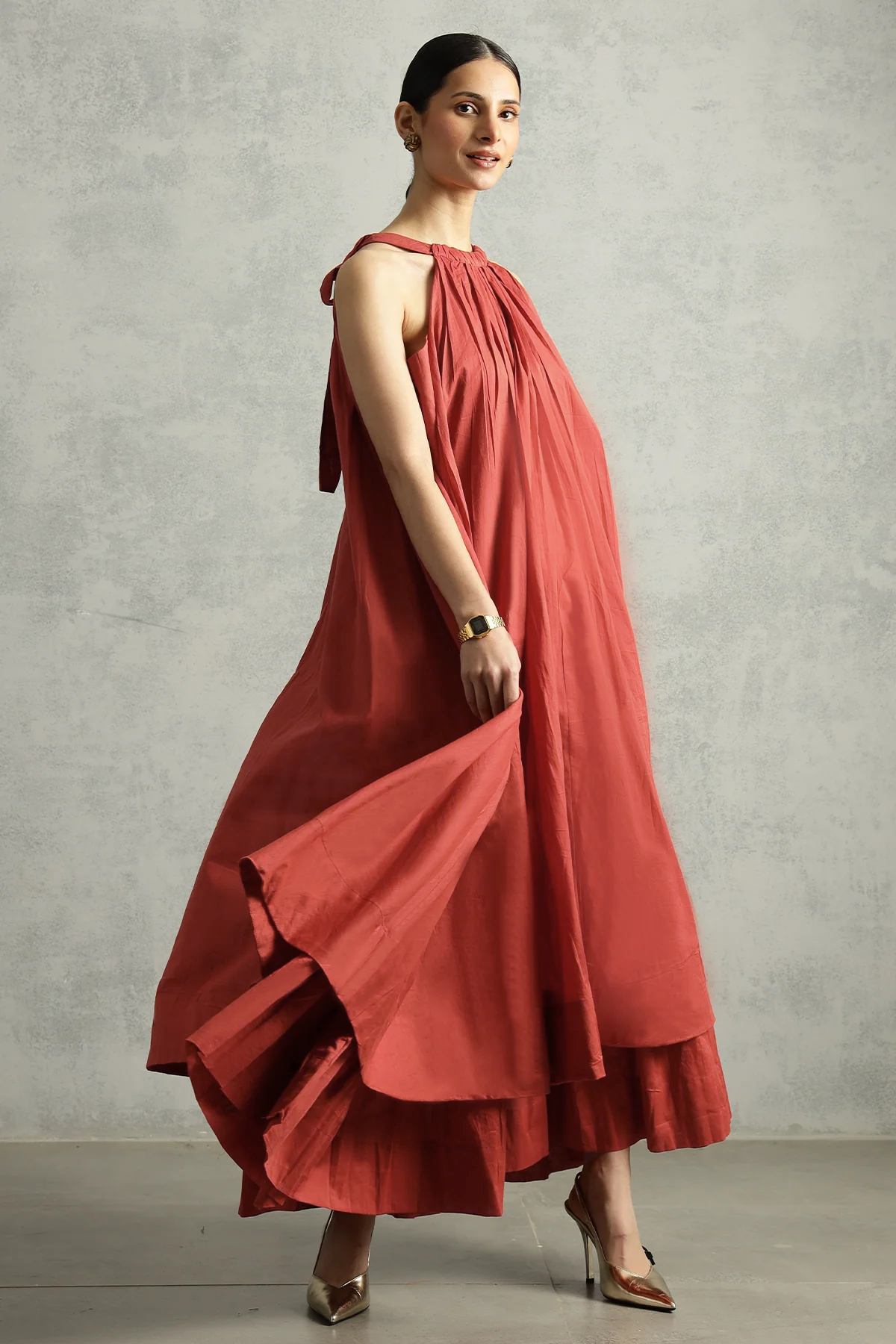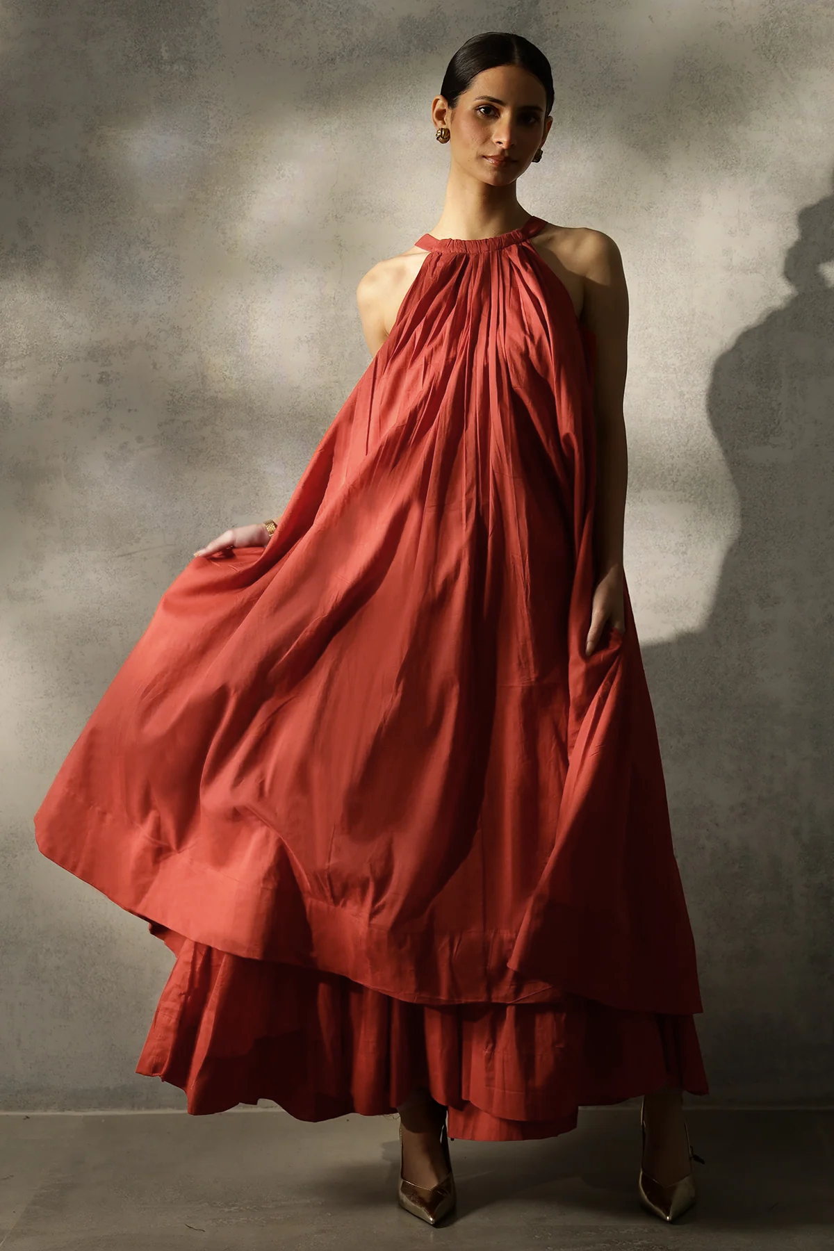 Breezy grandeur takes shape in this billowing sienna maxi dress. Designed with a gathered halter neckline and an exquisitely layered hem, it moves like air with every step. A soft, voluminous silhouette brings ethereal elegance, while delicate back ties add a subtle flourish. Pure drama, effortlessly worn.