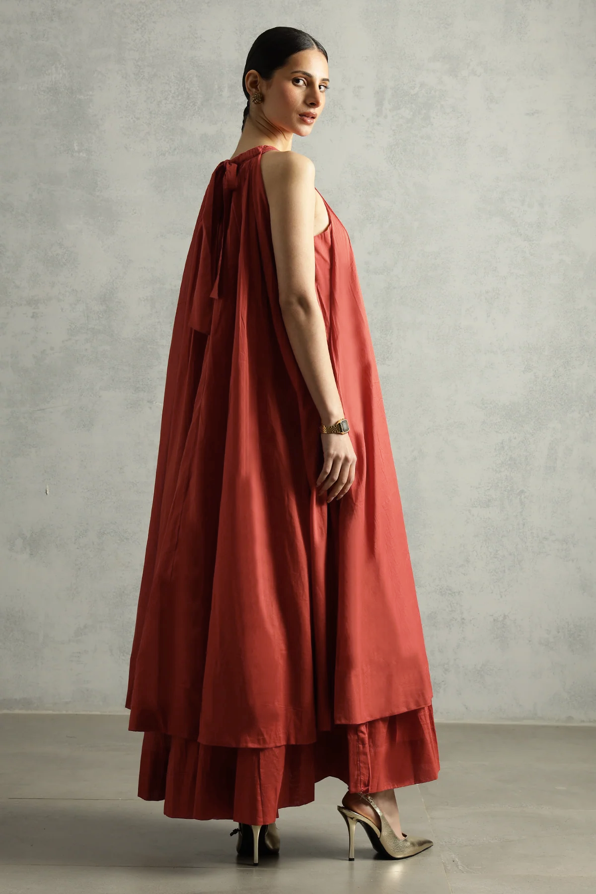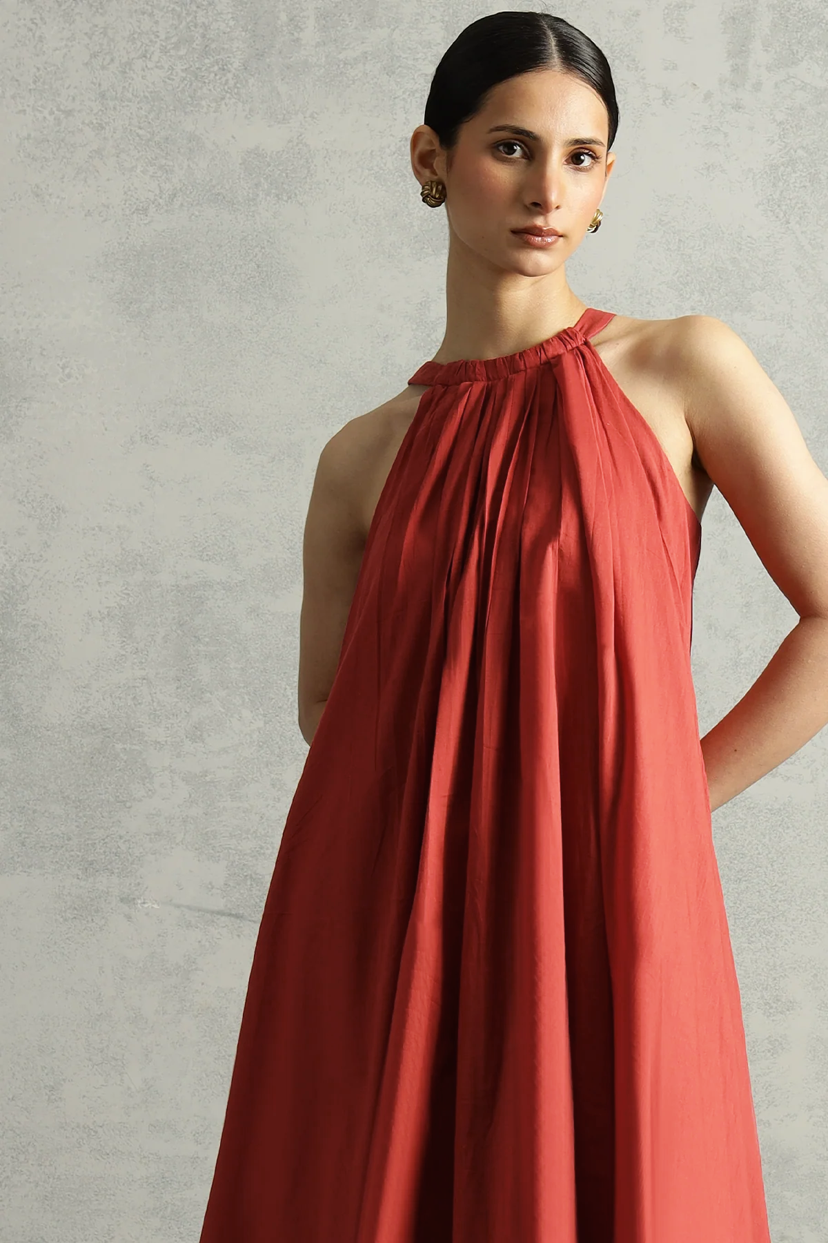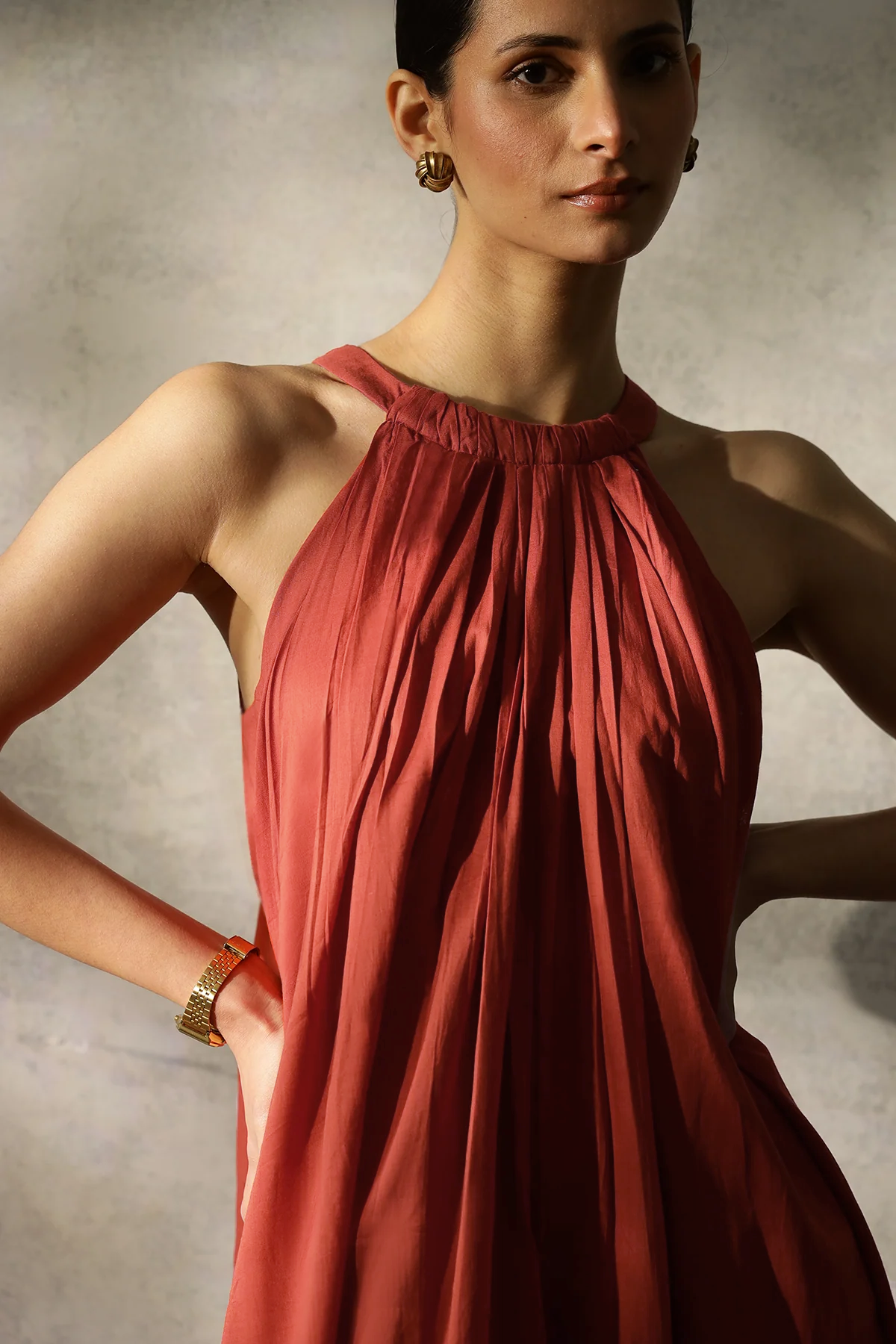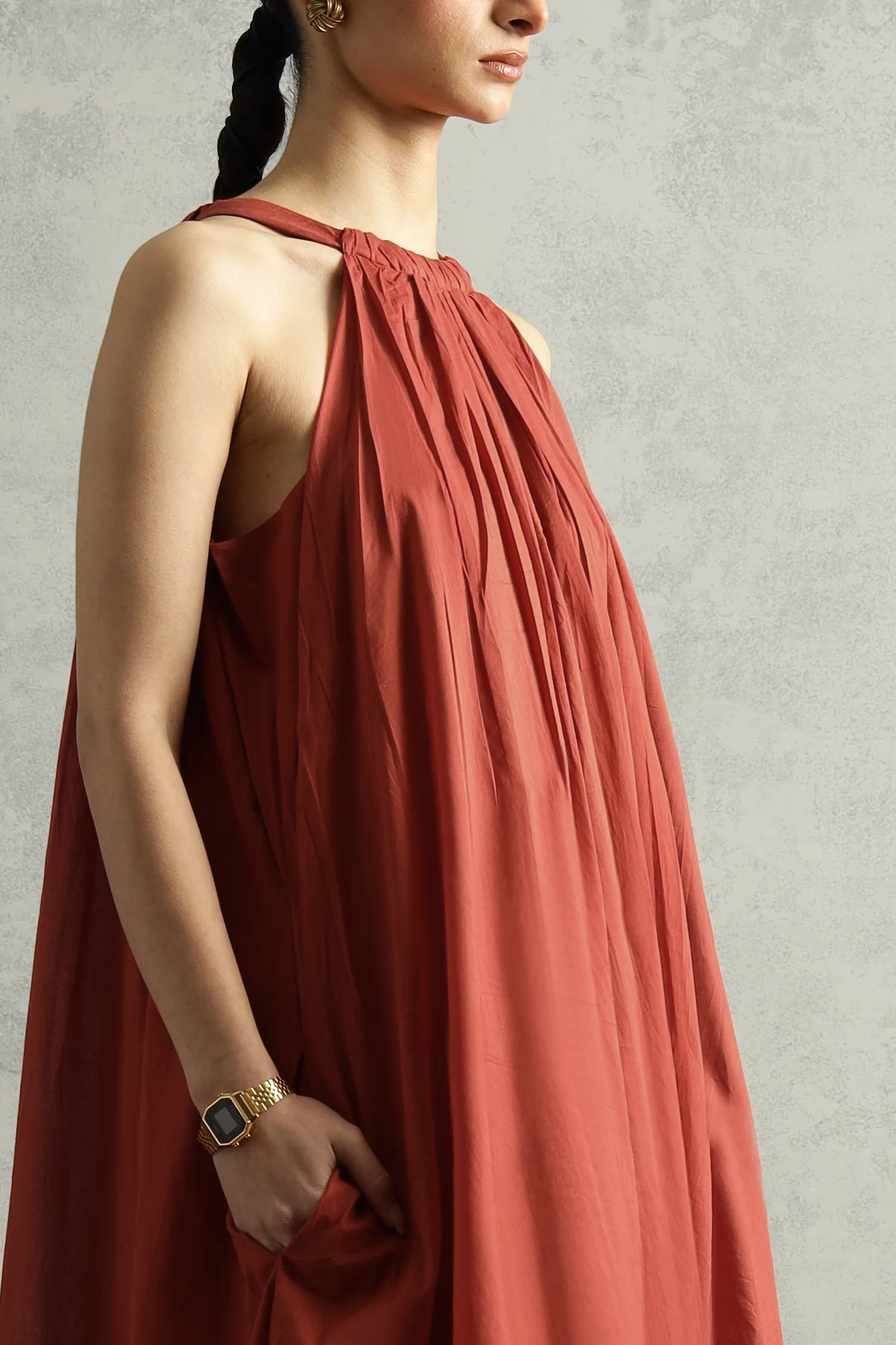 Breezy grandeur takes shape in this billowing sienna maxi dress. Designed with a gathered halter neckline and an exquisitely layered hem, it moves like air with every step. A soft, voluminous silhouette brings ethereal elegance, while delicate back ties add a subtle flourish. Pure drama, effortlessly worn.
