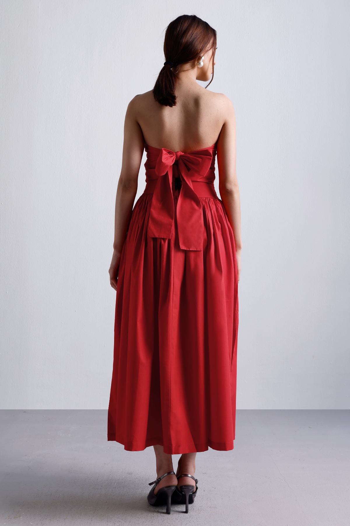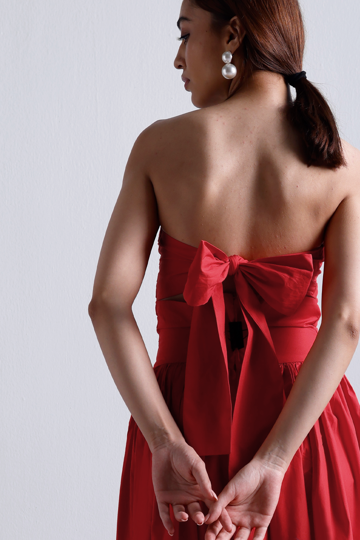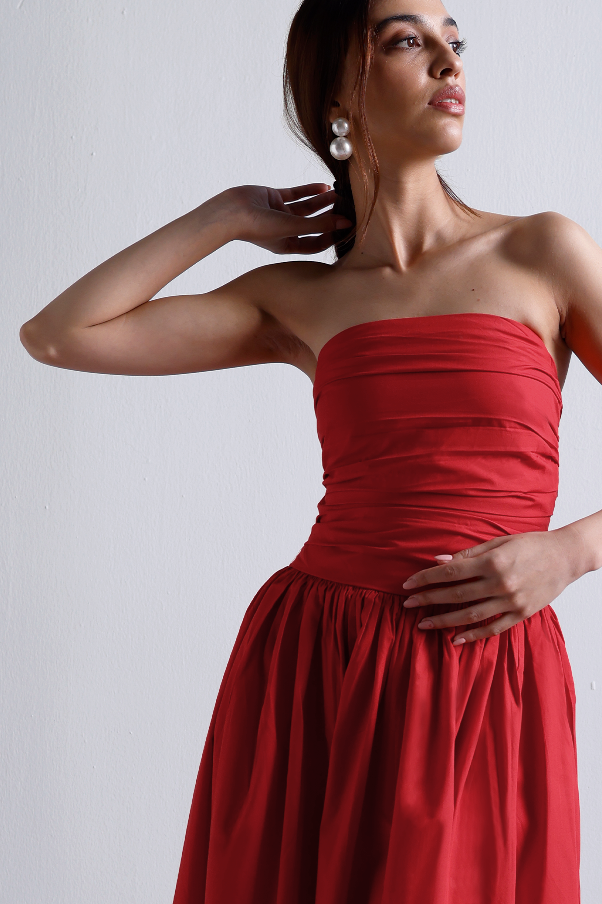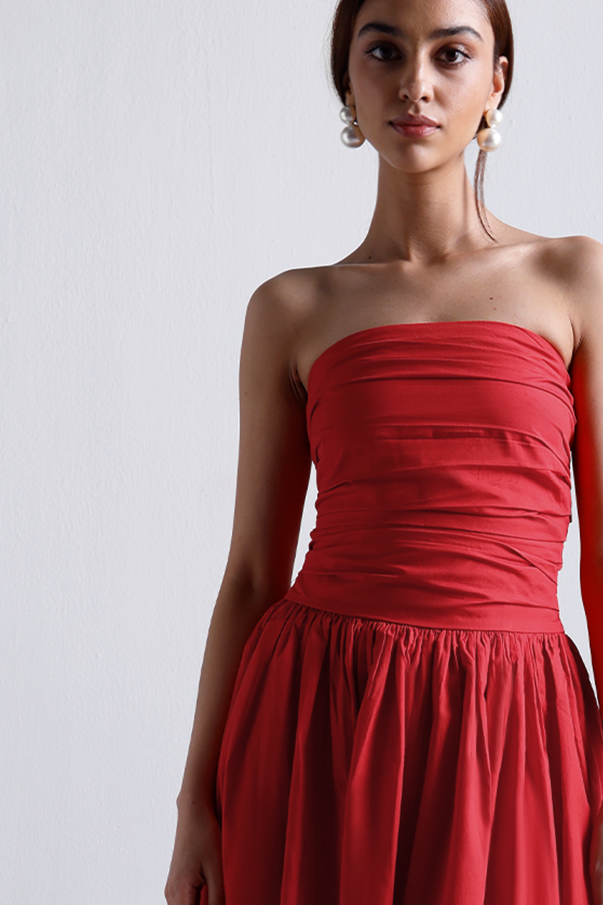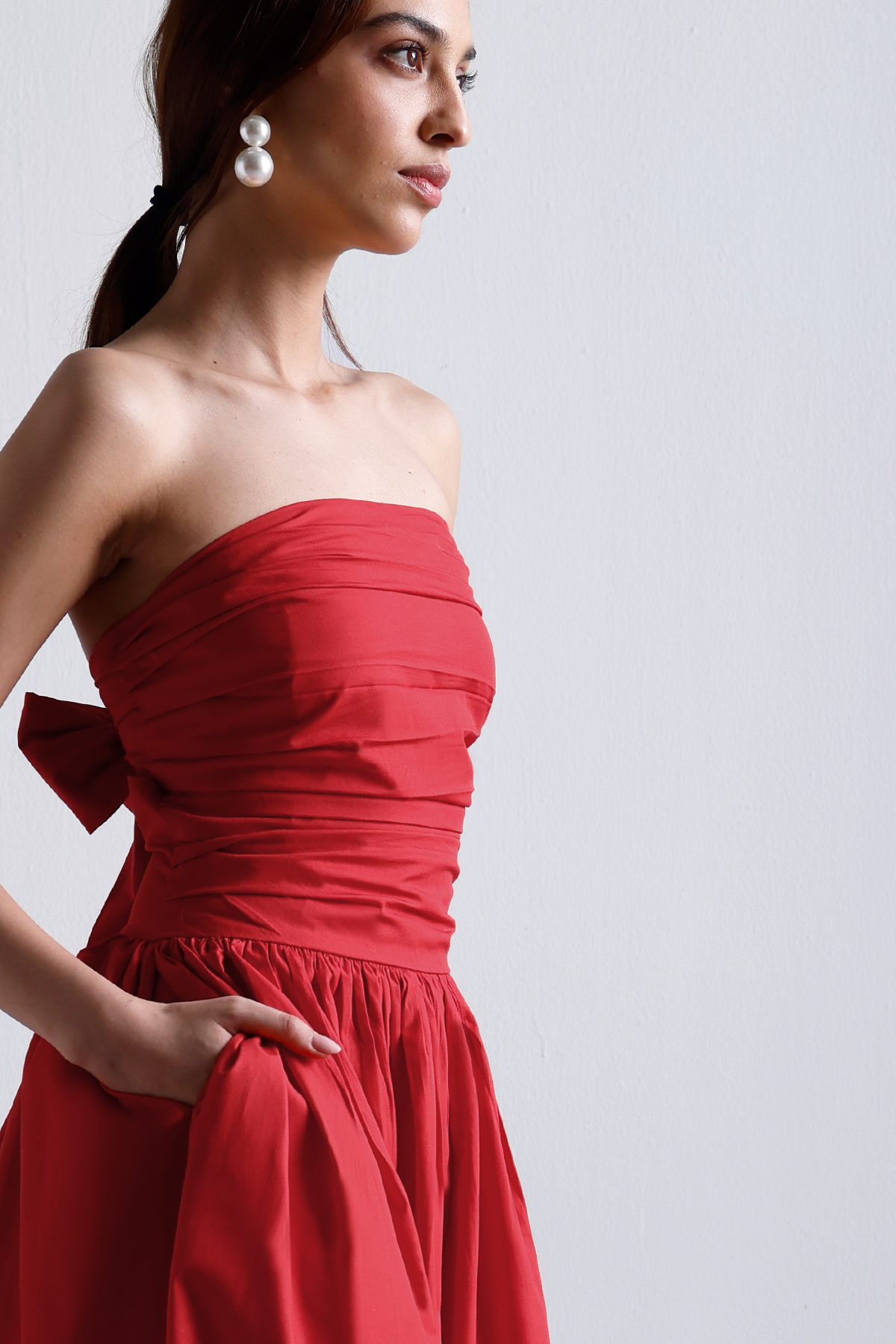 Designed to steal the spotlight, this strapless crimson midi dress features a flattering ruched bodice, a voluminous gathered skirt, and a statement bow at the back. Crafted in breathable cotton with hidden pockets (yes, really), it's the perfect bold dress for date nights, destination weddings, or dancing like no one’s watching.