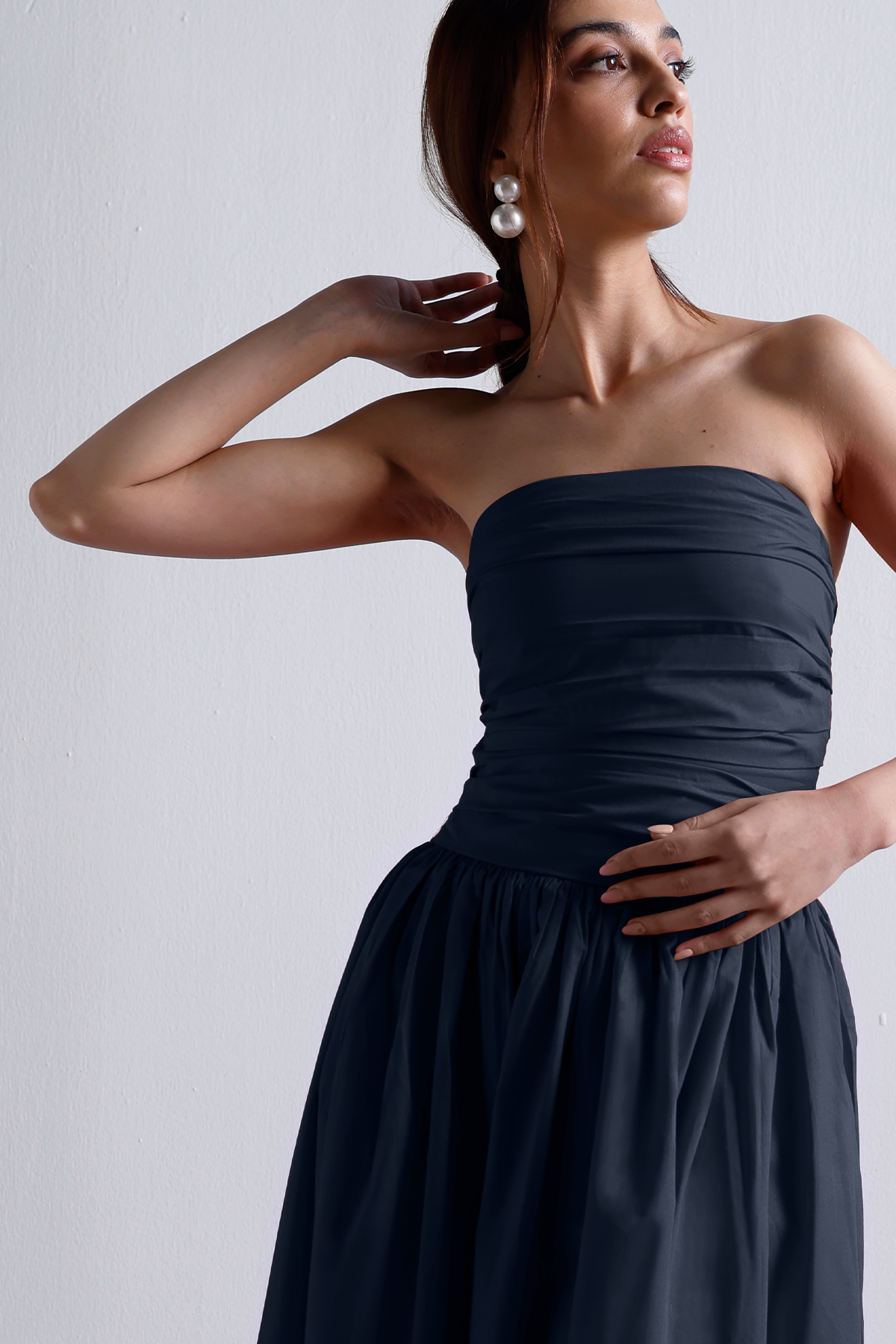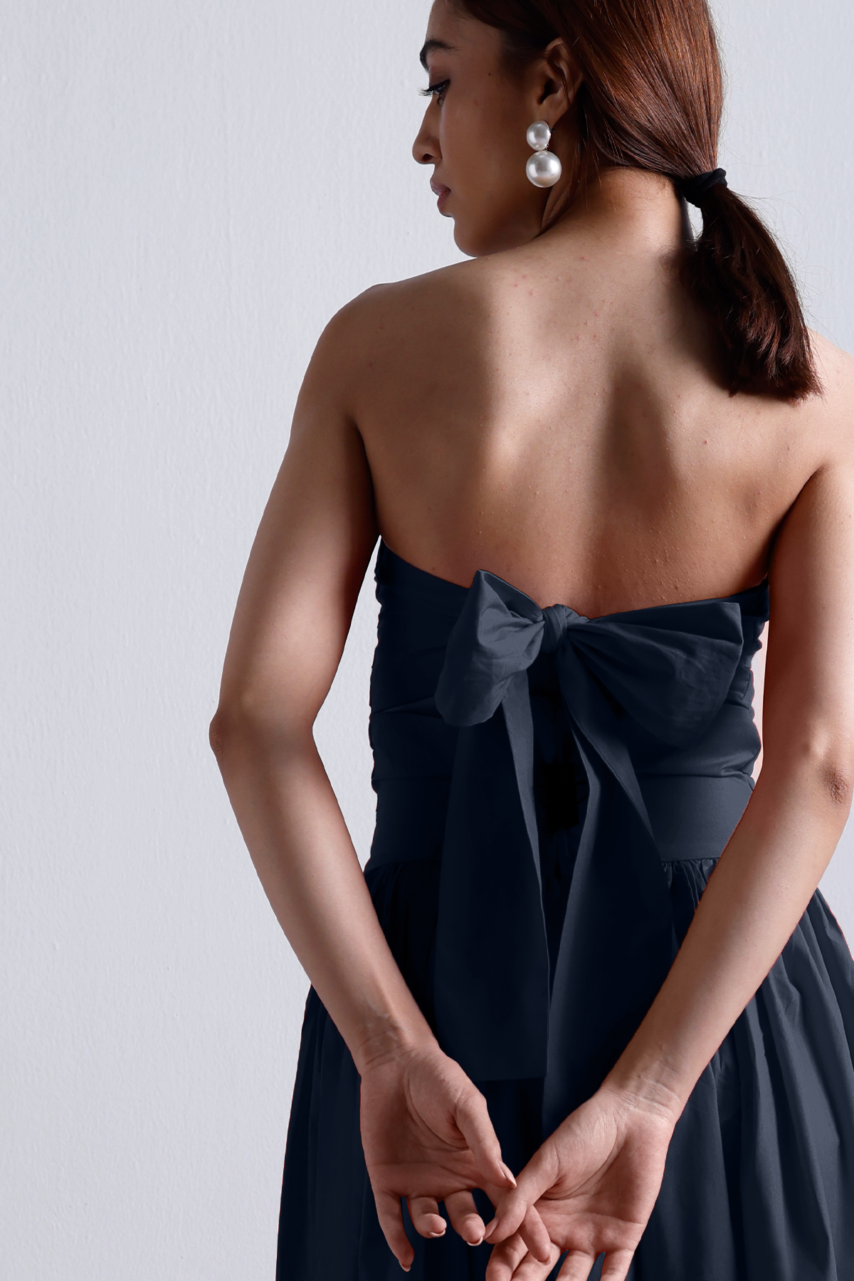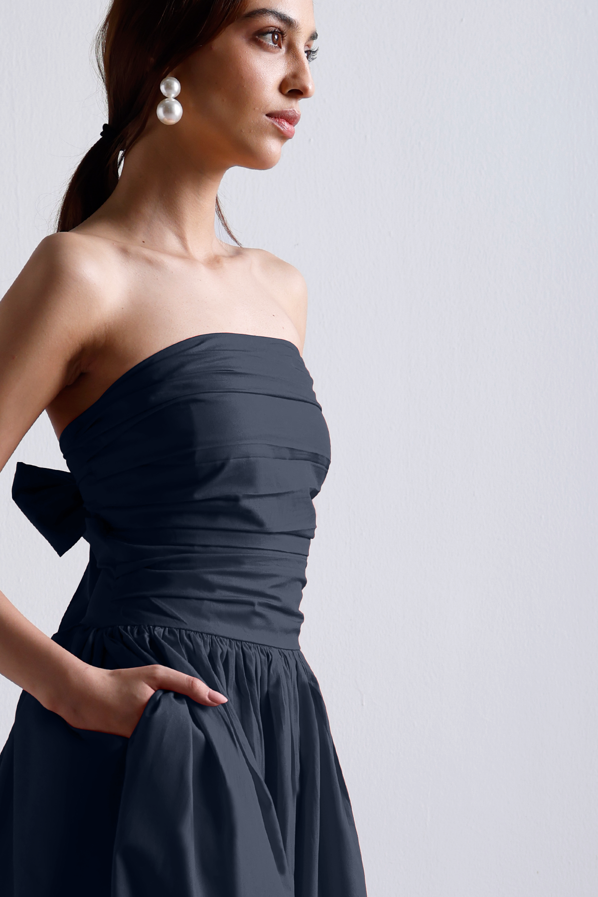 Designed to steal the spotlight, this strapless navy midi dress features a flattering ruched bodice, a voluminous gathered skirt, and a statement bow at the back. Crafted in breathable cotton with hidden pockets (yes, really), it's the perfect bold dress for date nights, destination weddings, or dancing like no one’s watching.