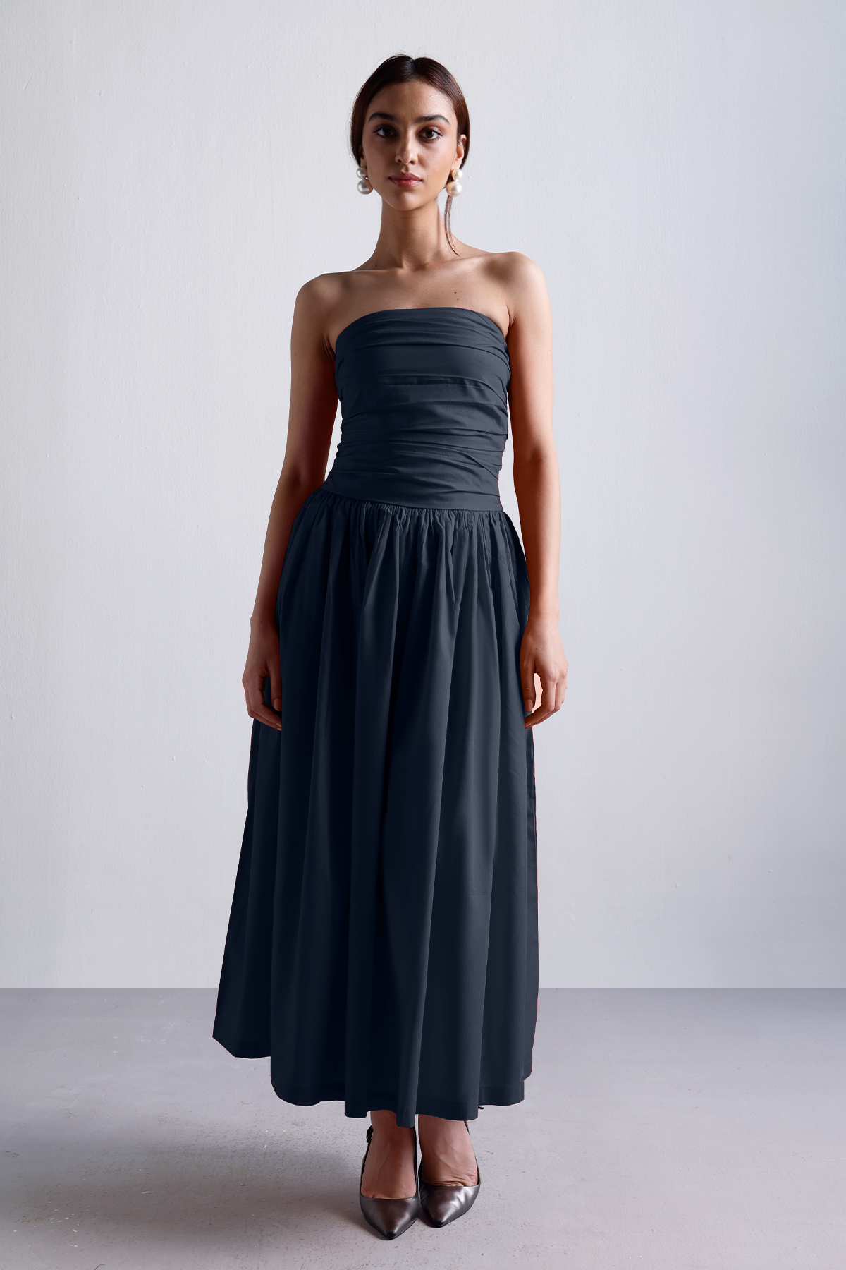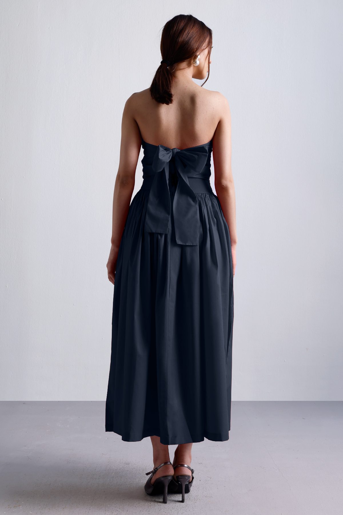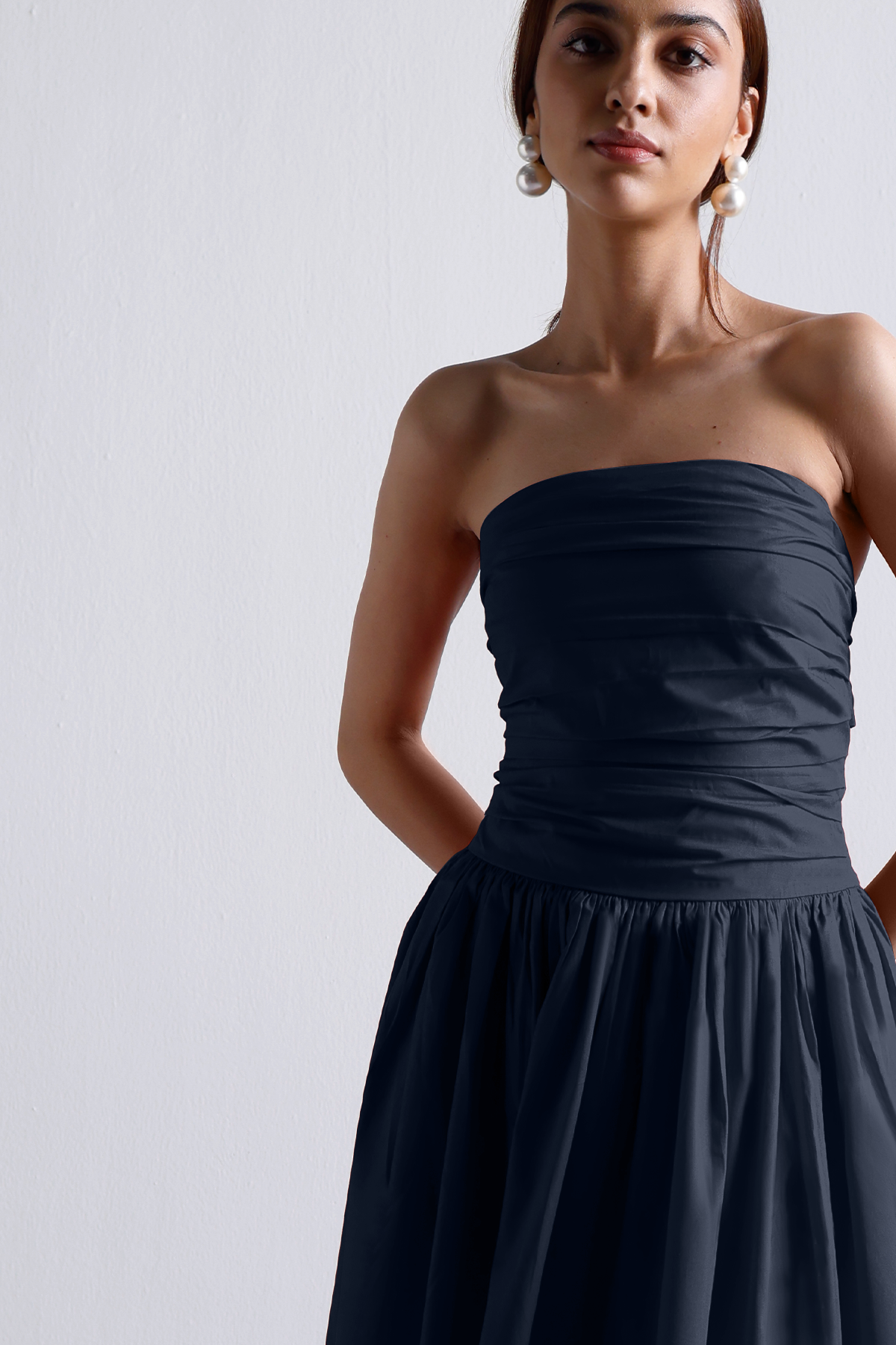 Designed to steal the spotlight, this strapless navy midi dress features a flattering ruched bodice, a voluminous gathered skirt, and a statement bow at the back. Crafted in breathable cotton with hidden pockets (yes, really), it's the perfect bold dress for date nights, destination weddings, or dancing like no one’s watching.