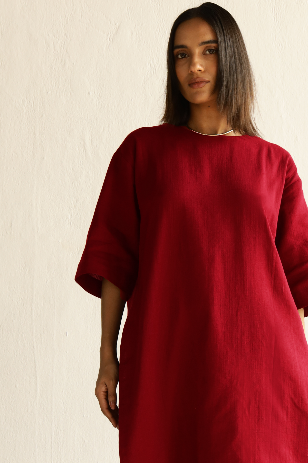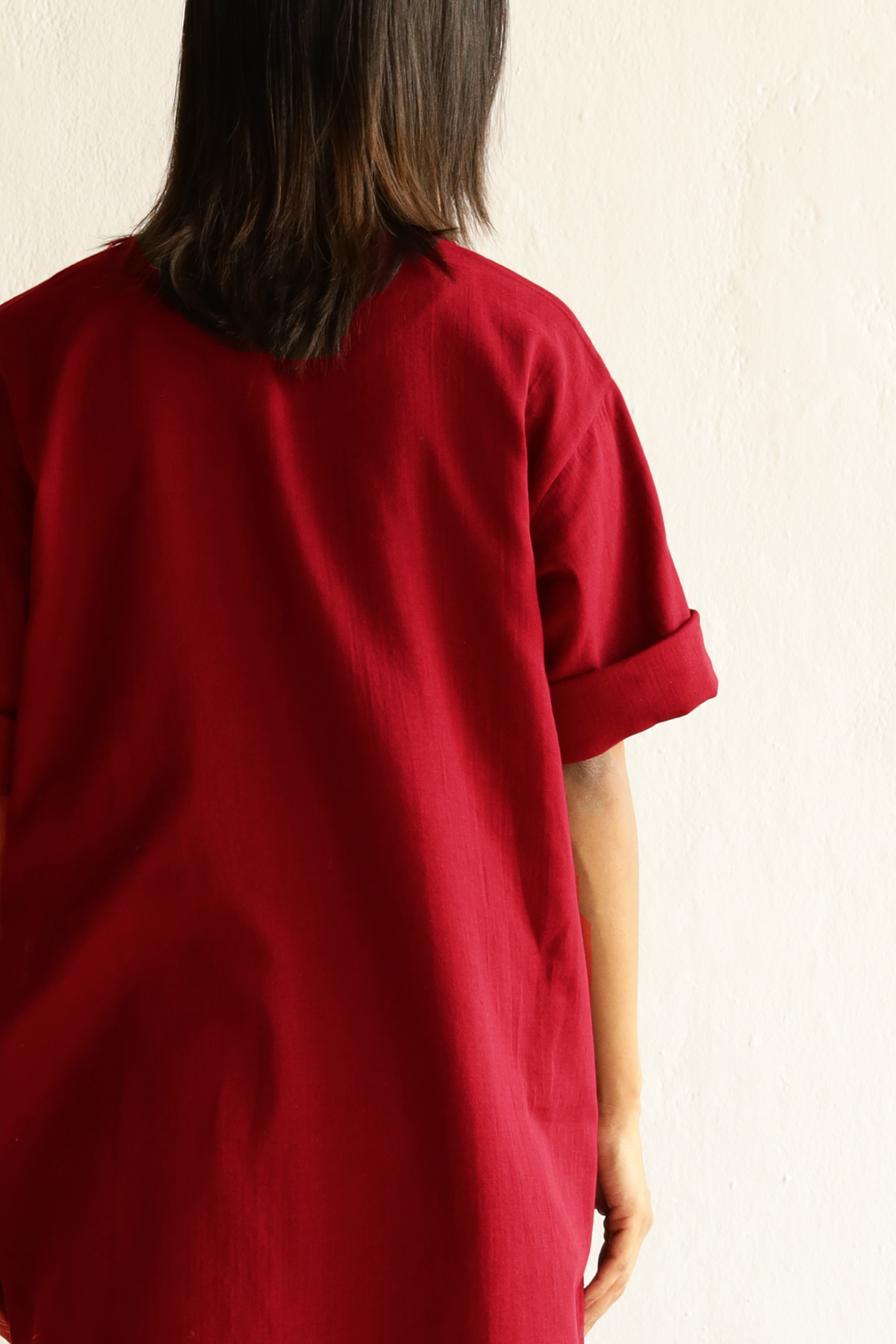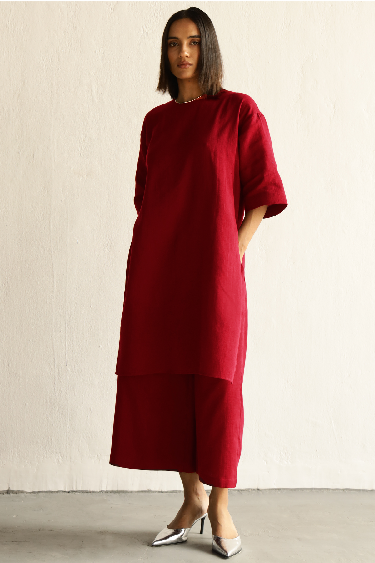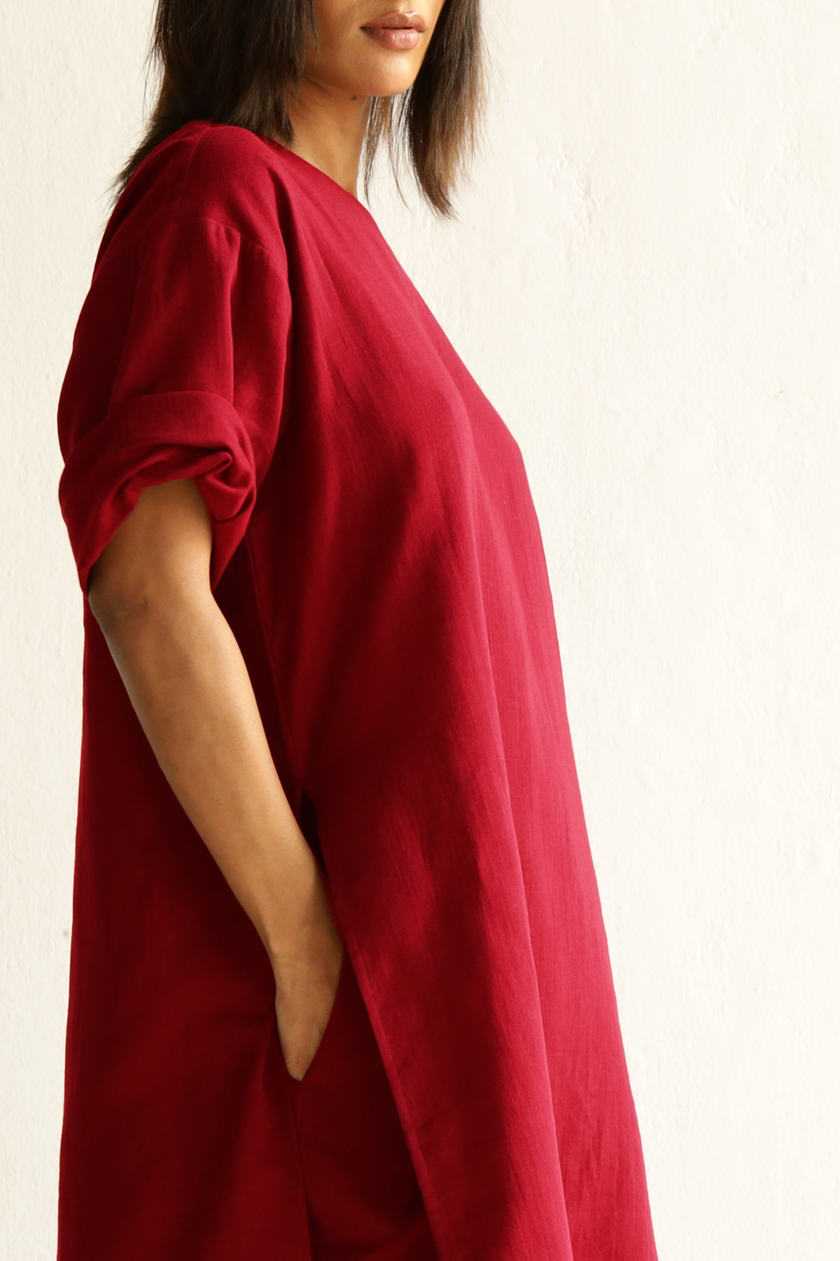 Crimson, big impact. This breezy tunic all clean lines and quiet confidence. Rolled sleeves say ‘I mean business,’ while the top scream comfort chic. Perfect for days you want to look cool and collected—even if you’re secretly winging it