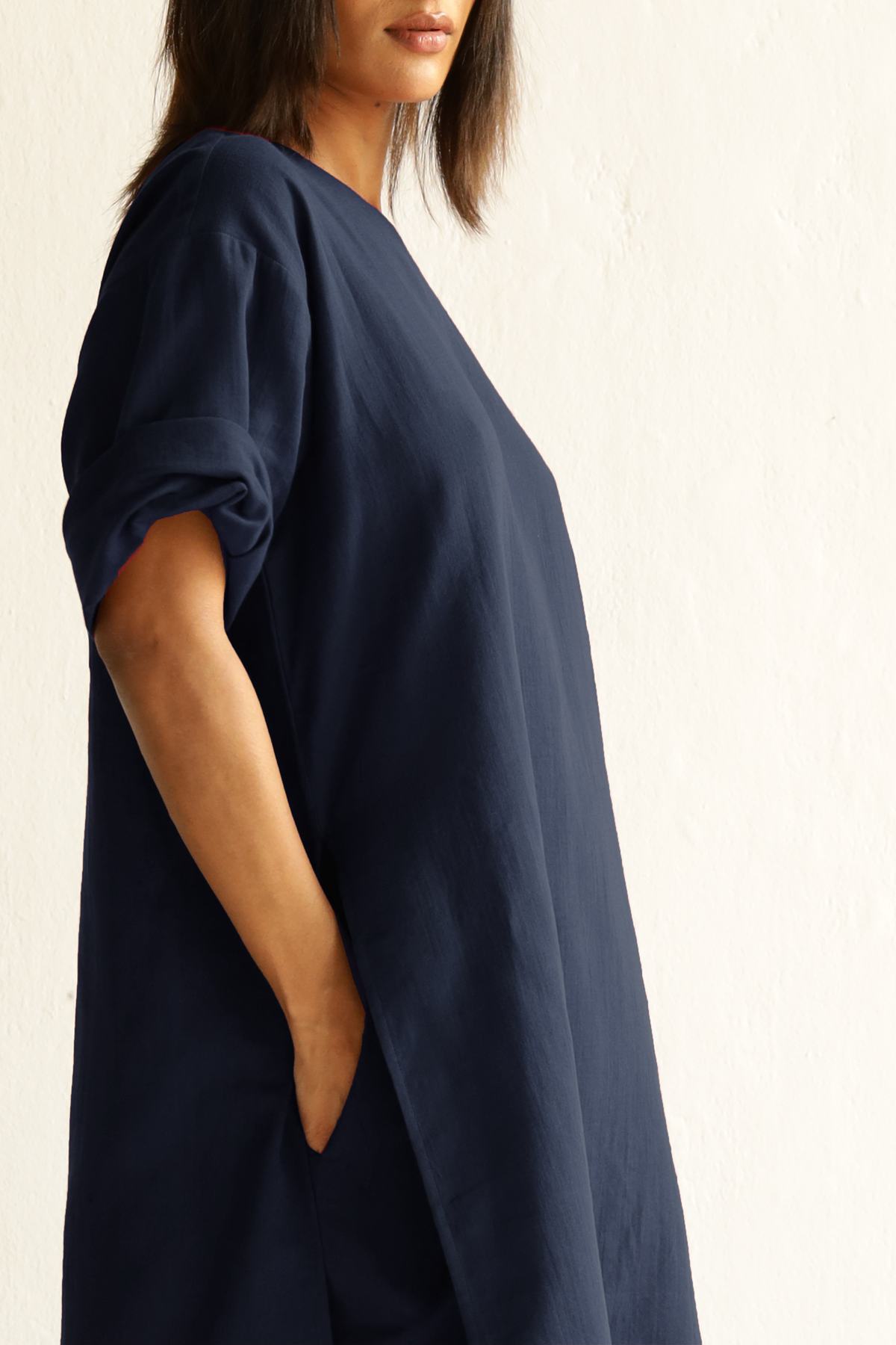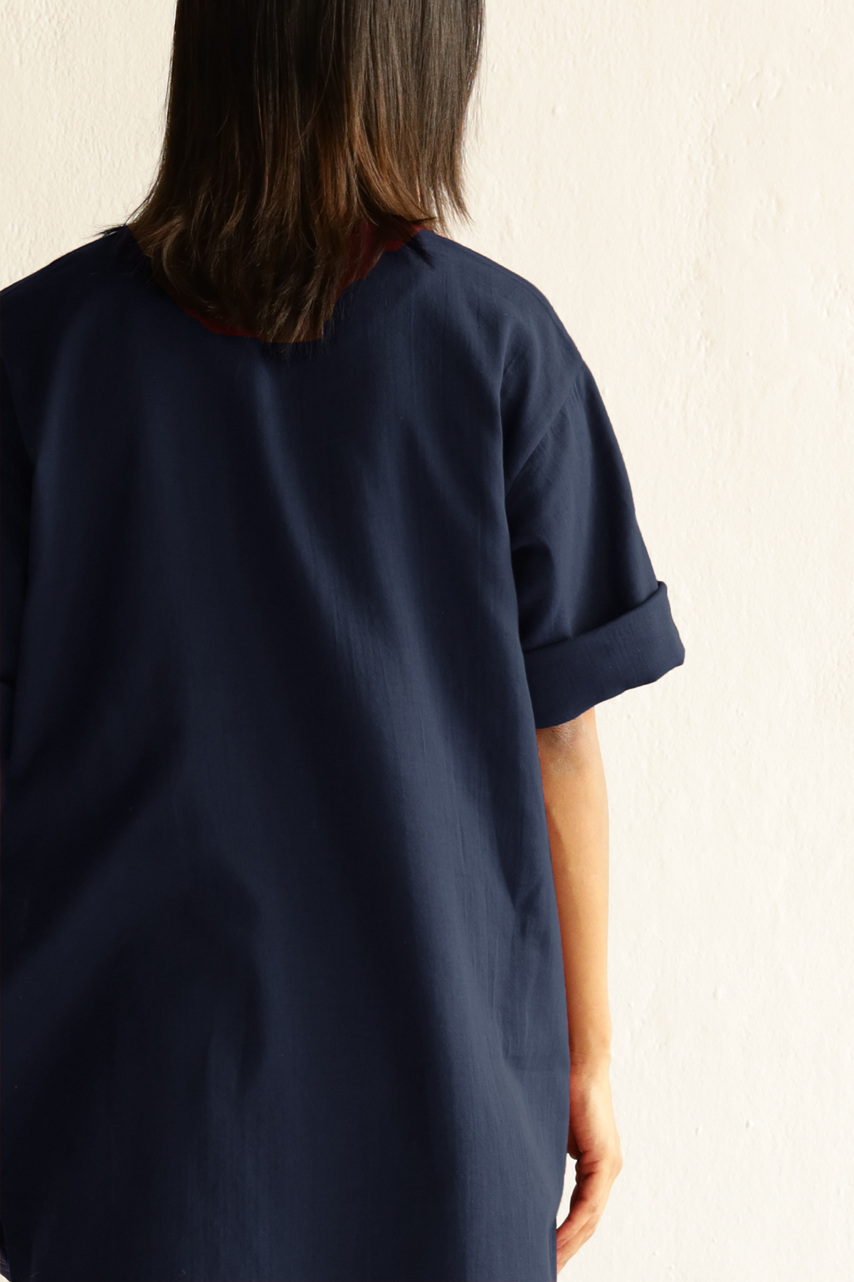 Soft Navy, big impact. This breezy tunic all clean lines and quiet confidence. Rolled sleeves say ‘I mean business,’ while the top scream comfort chic. Perfect for days you want to look cool and collected—even if you’re secretly winging it.