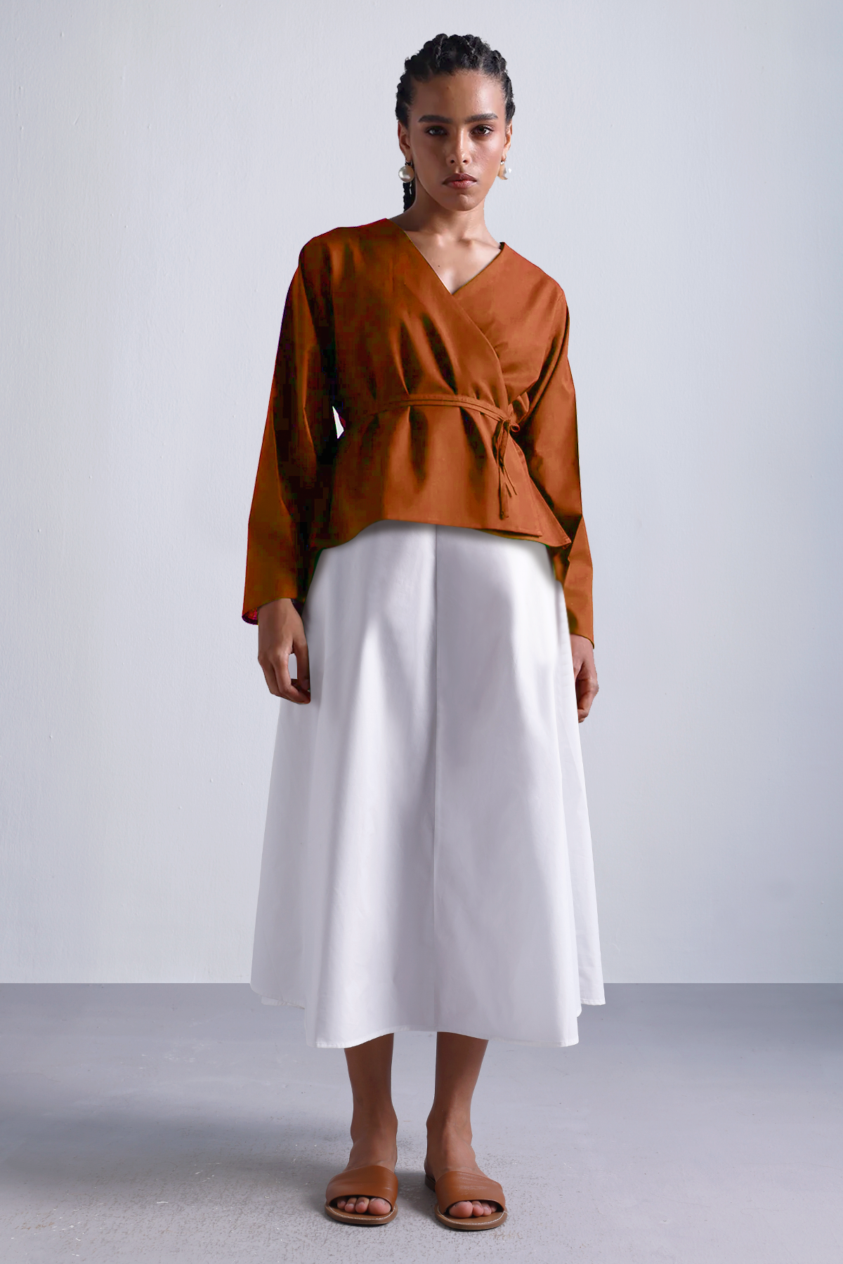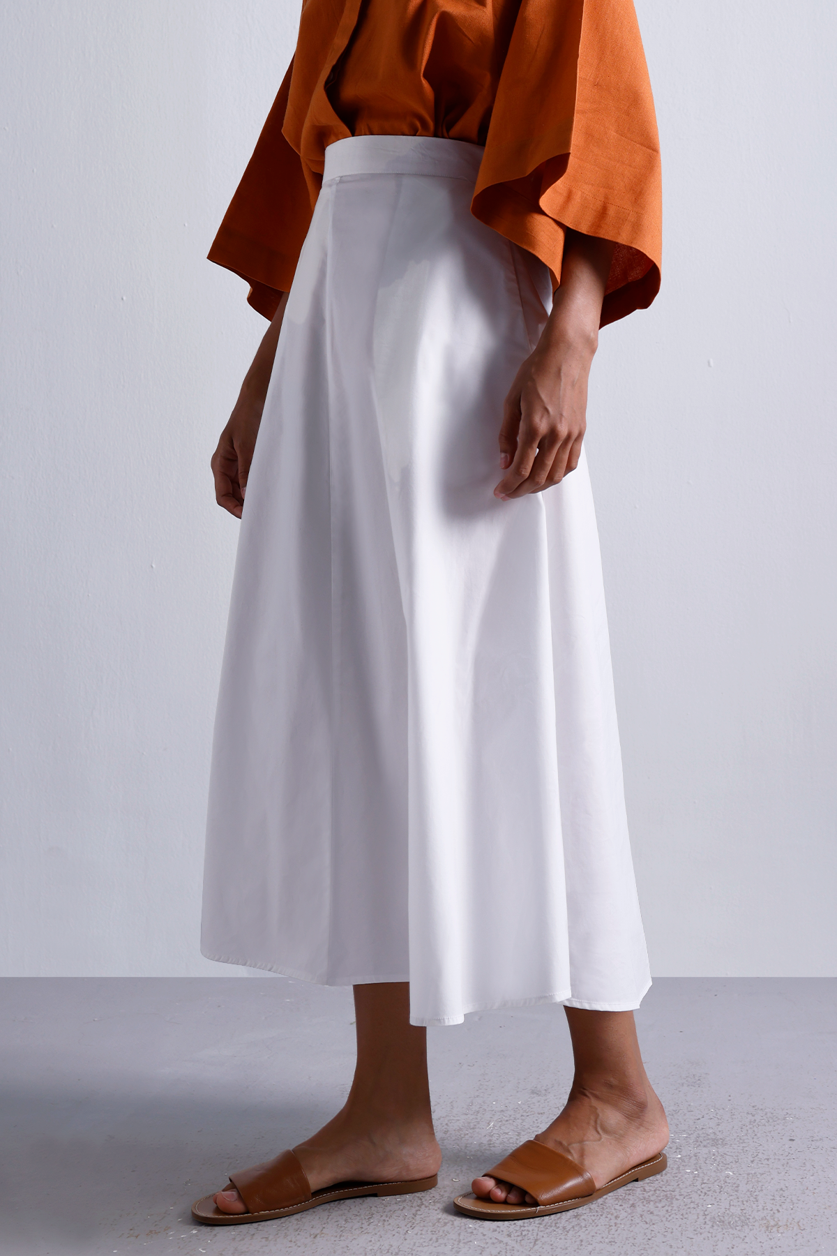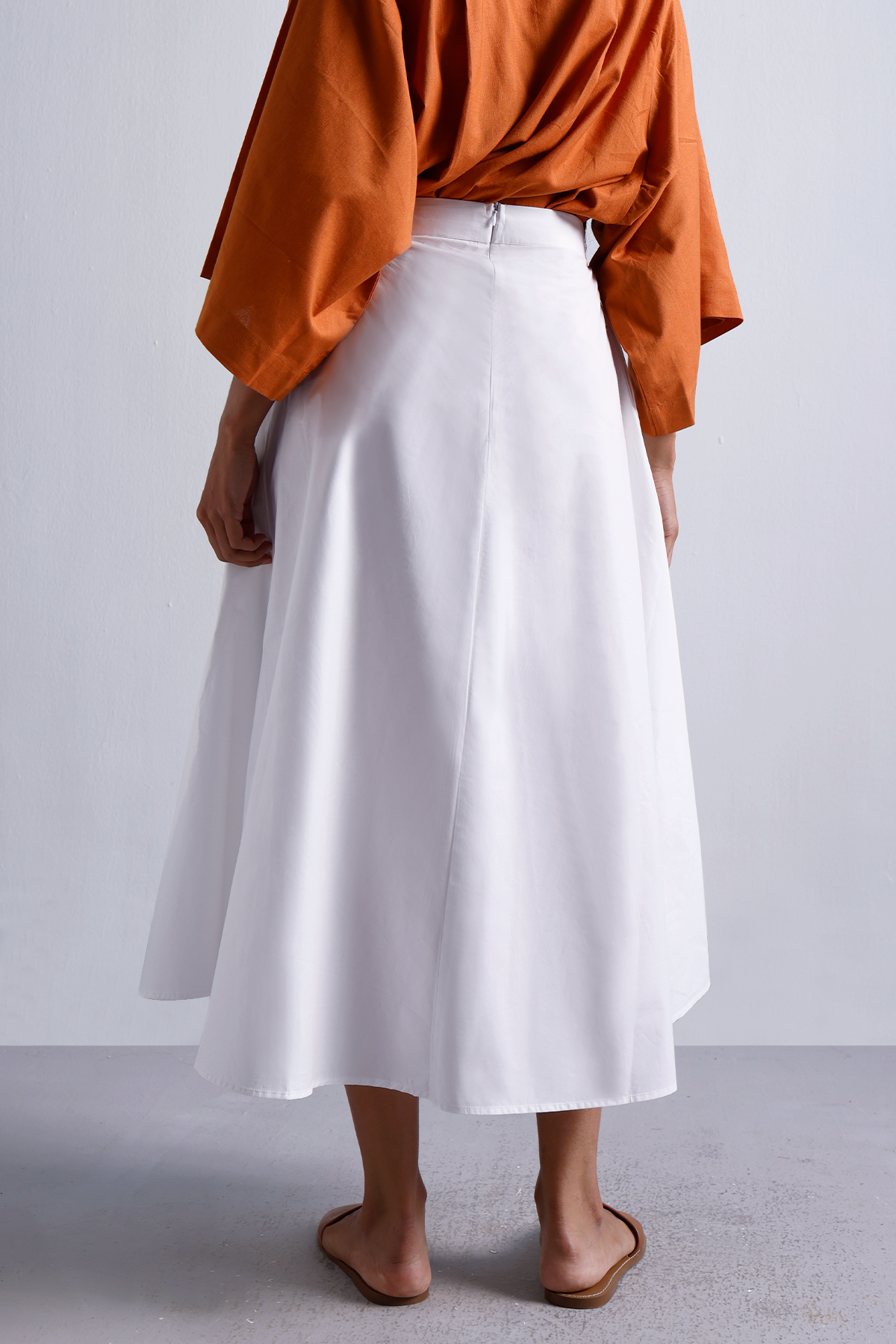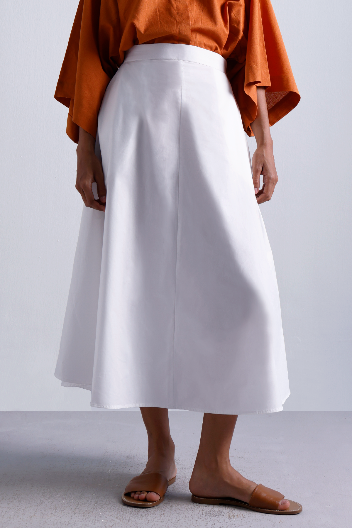 A wardrobe essential that moves as effortlessly as you do. Crafted from sturdy-yet-breathable cotton twill, this cloud white flared midi skirt is all about structure with ease. The high-rise waist cinches gently, while the clean back zipper keeps things polished. Pair it with crisp shirts, soft knits, or flowy blouses—this one works hard year-round.