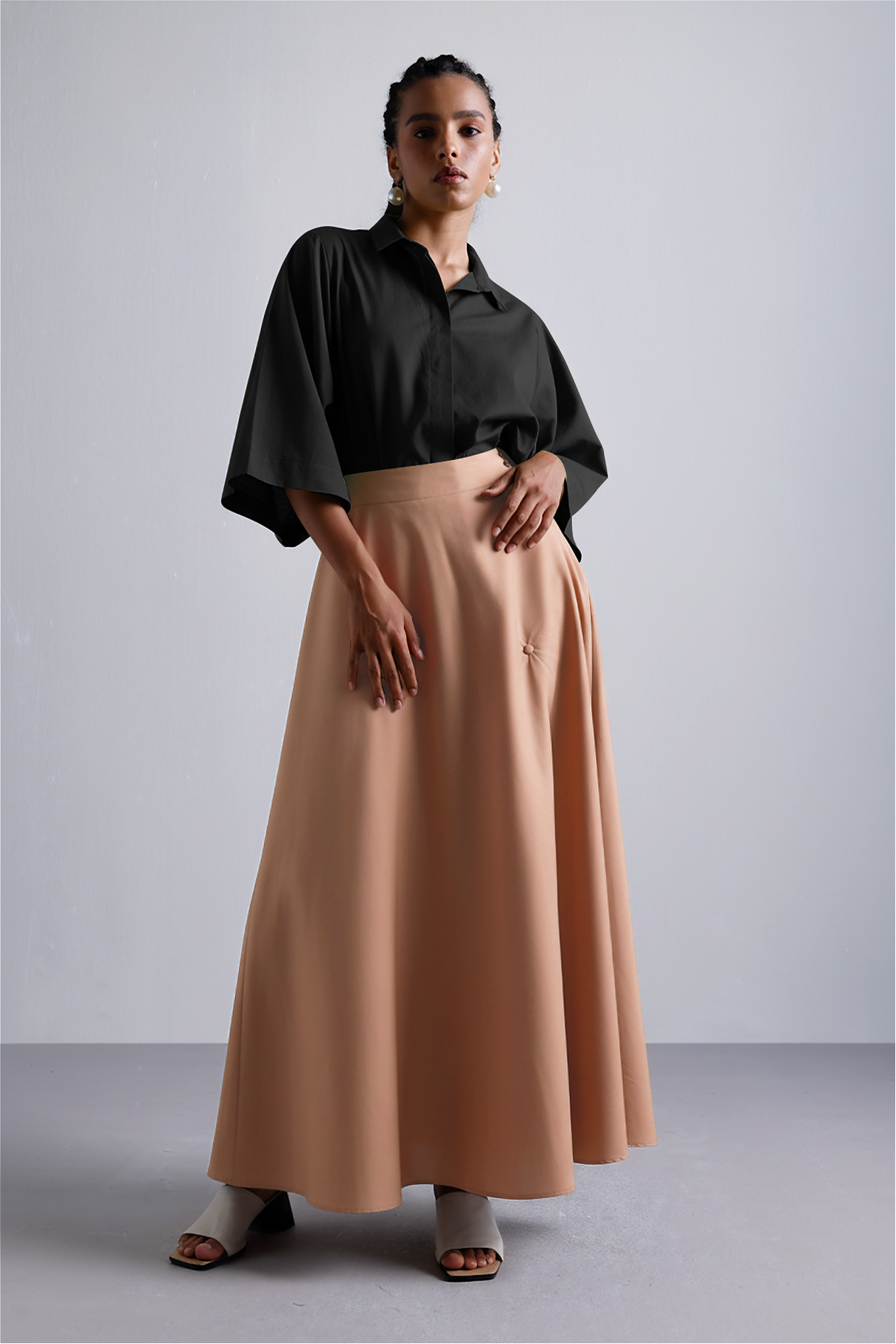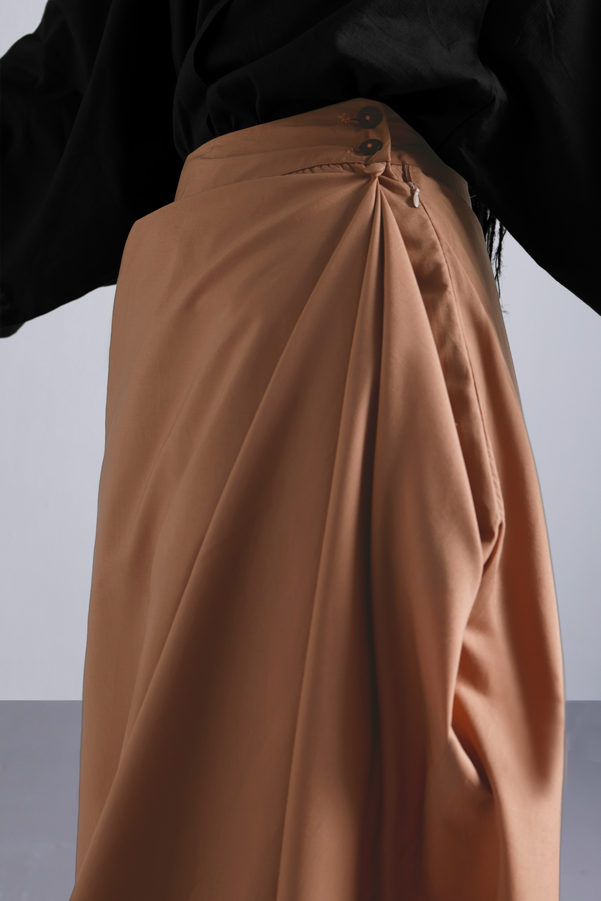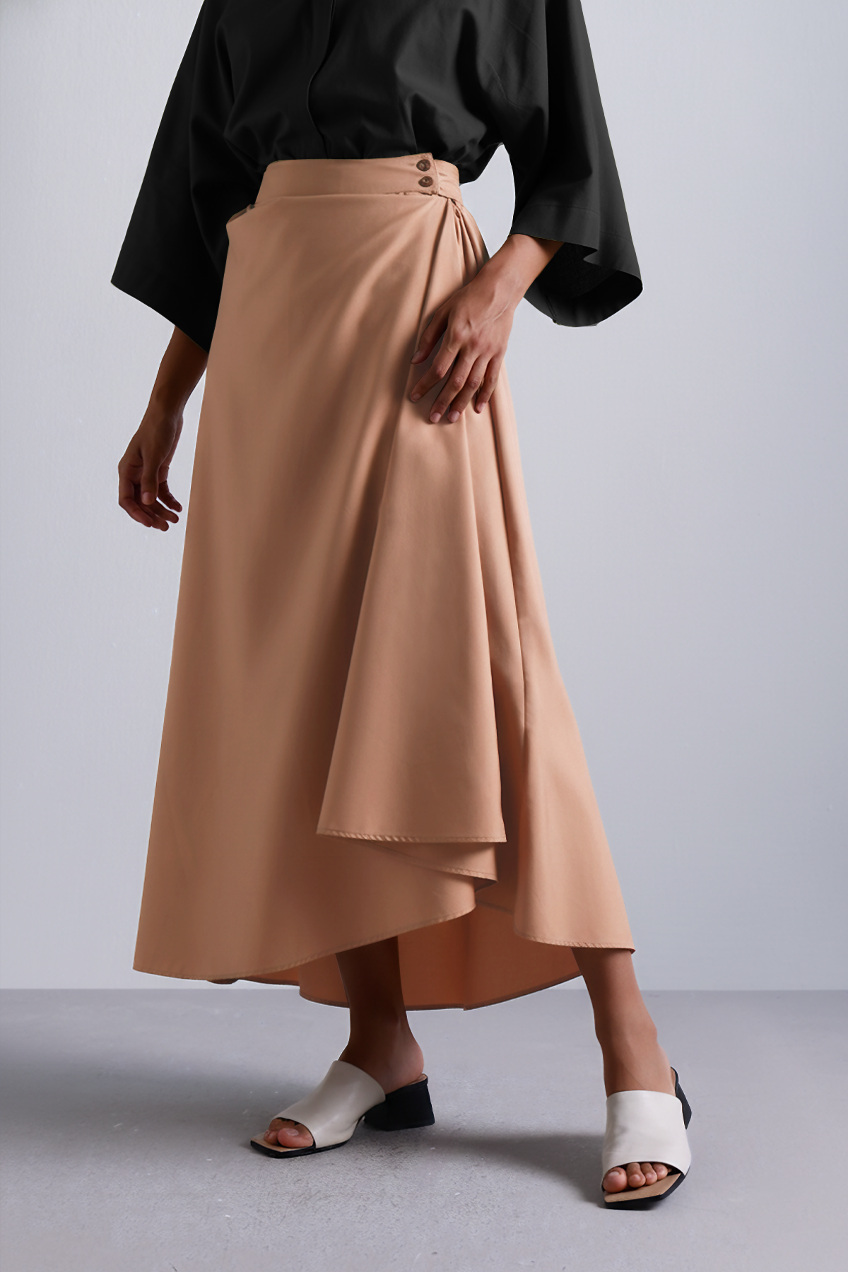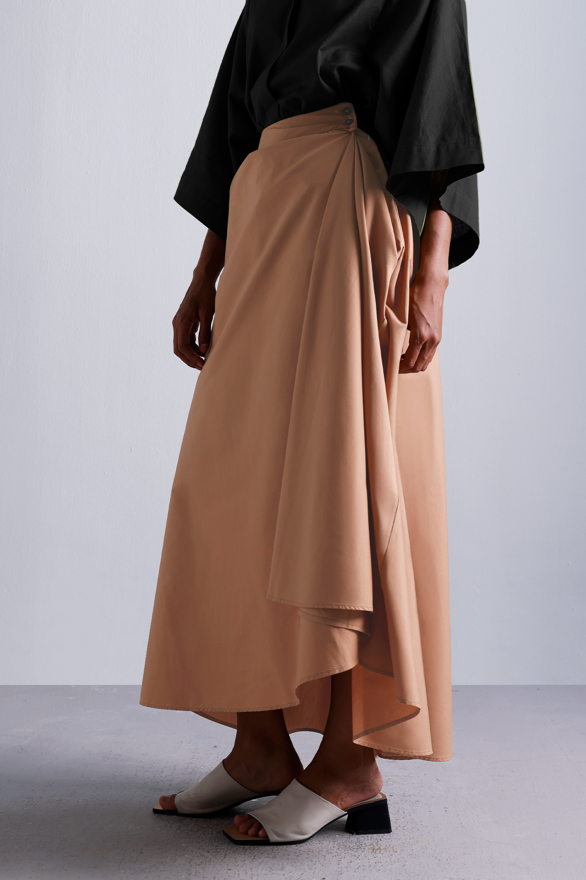 This wrap skirt in Dust peach features an asymmetric drape and functional button detail, flowy, flattering, and just structured enough. Featuring a cross-over flap, sculpted drape, and minimal, it moves with you through coffee catchups, gallery visits, and late brunches.Thoughtfully cut to fall just right, it nods to Japanese minimalism with a lived-in ease. Earthy, effortless, and made to be worn on repeat.