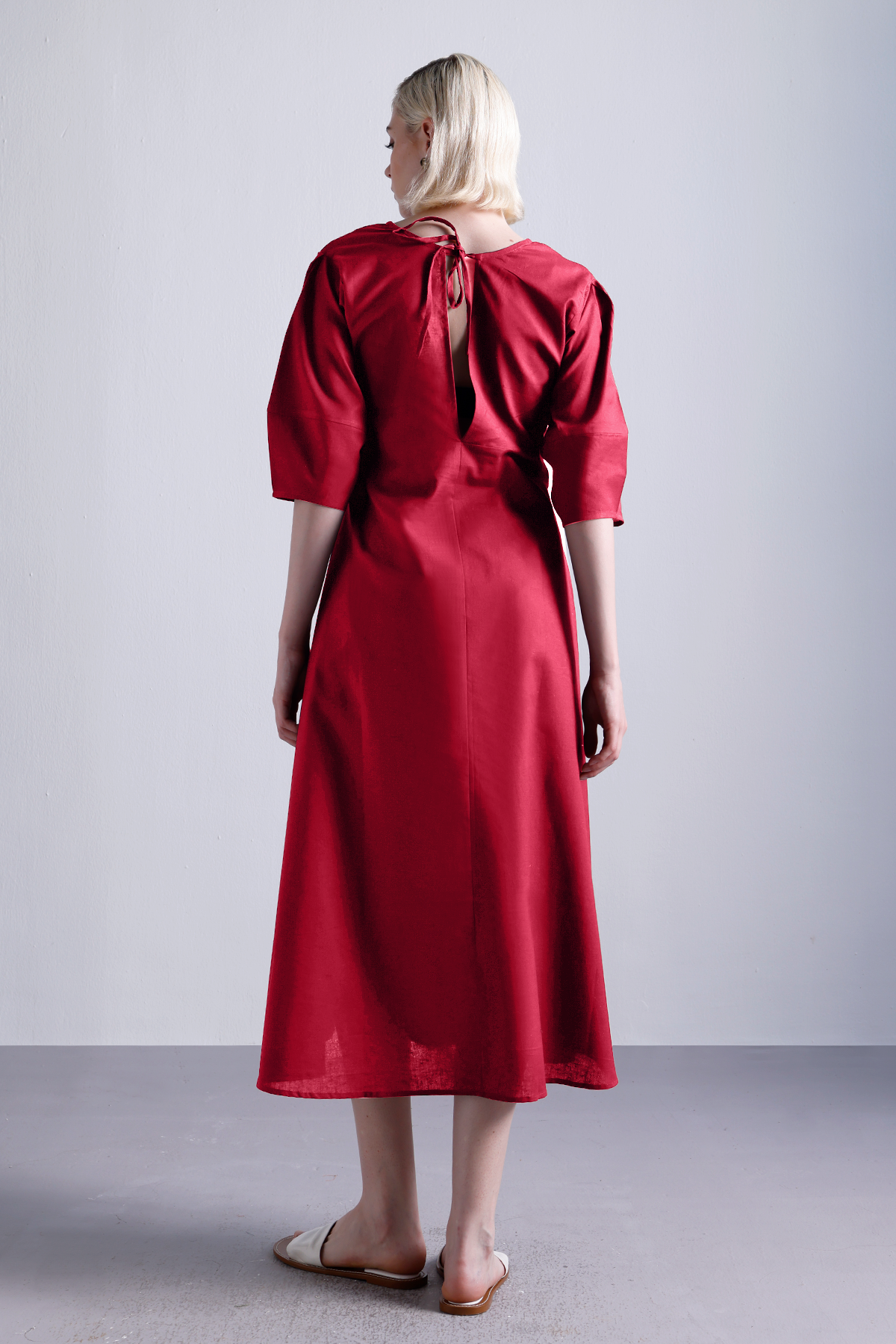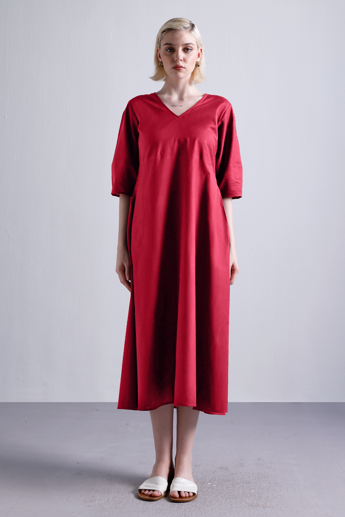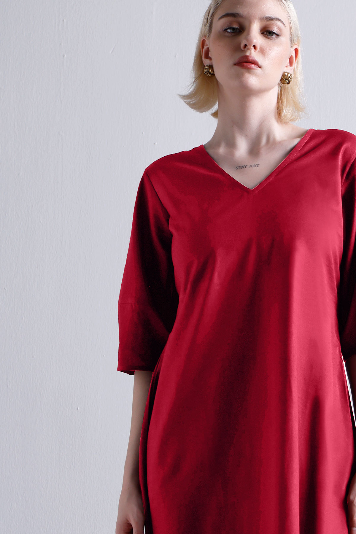 This Crimson dress hits the sweet spot between structure and slouch. Features include a flattering V-neck, elbow-length sleeves, and a flowy A-line cut that flatters without clinging. Just add minimal slides or a messy bun—it’s that kind of piece.