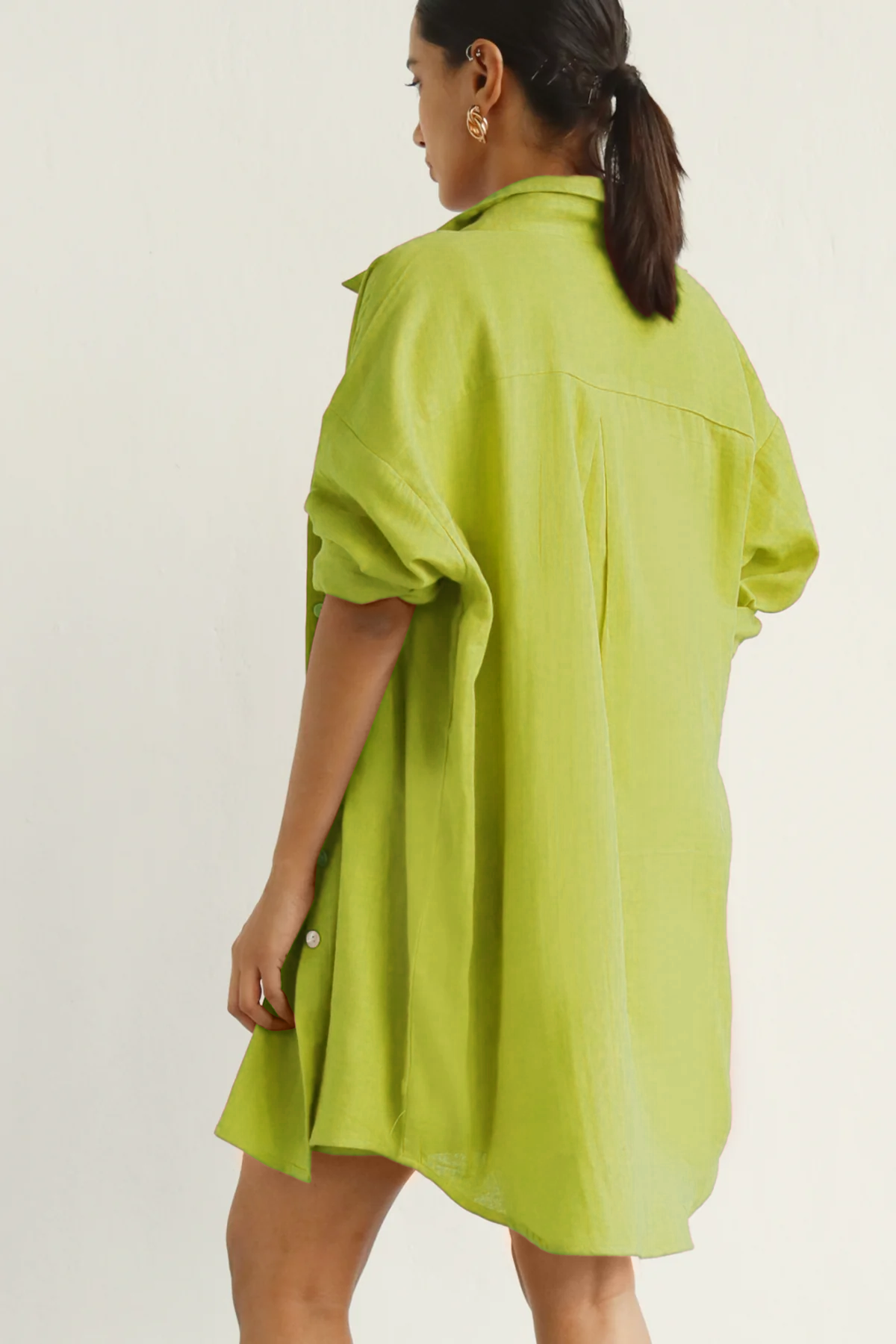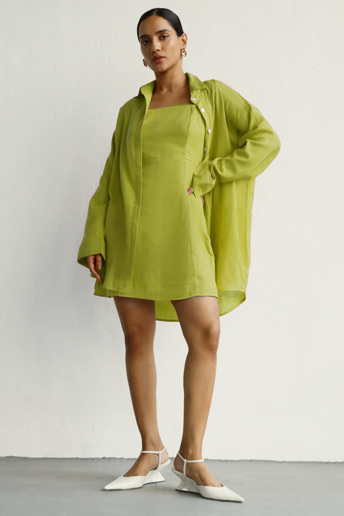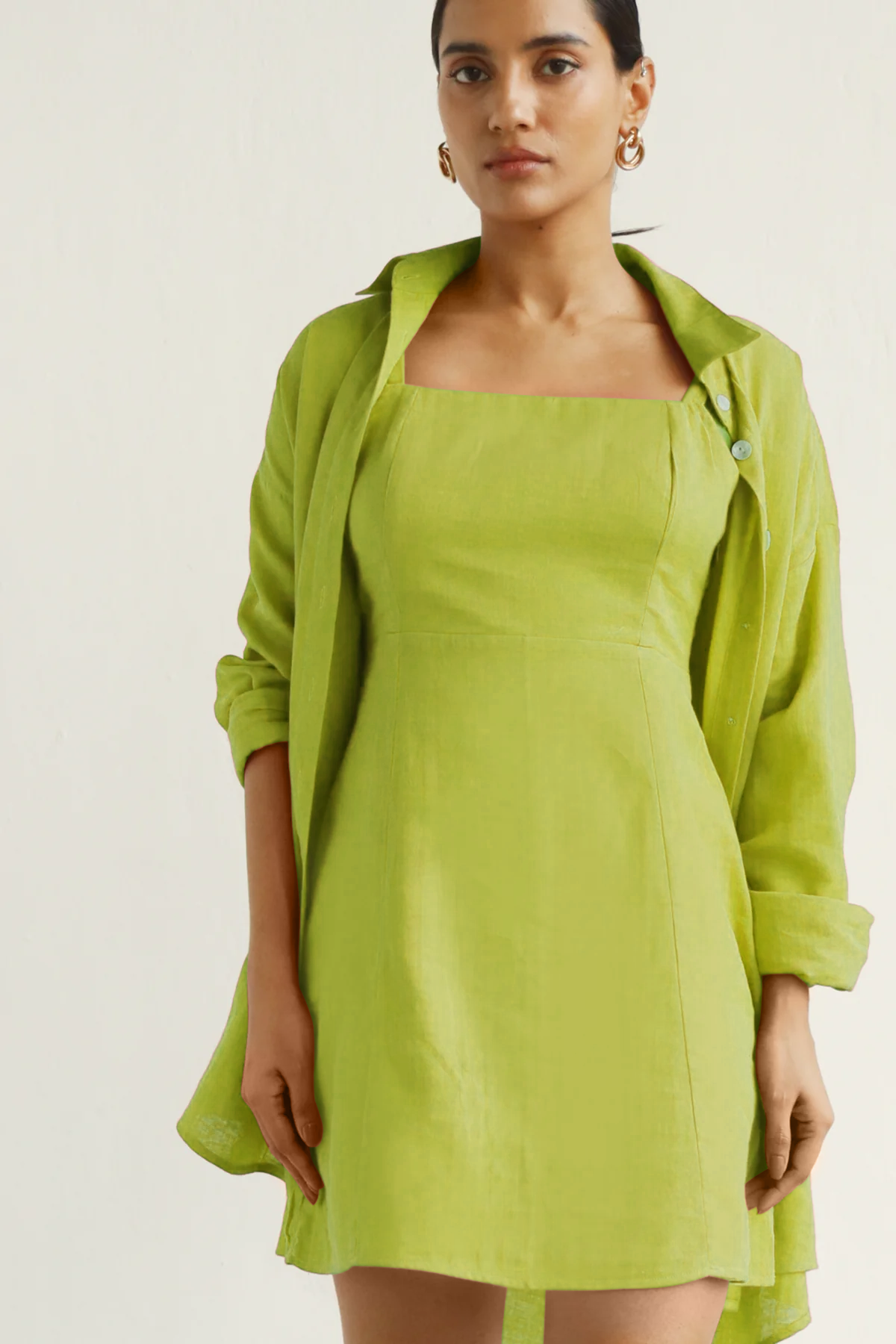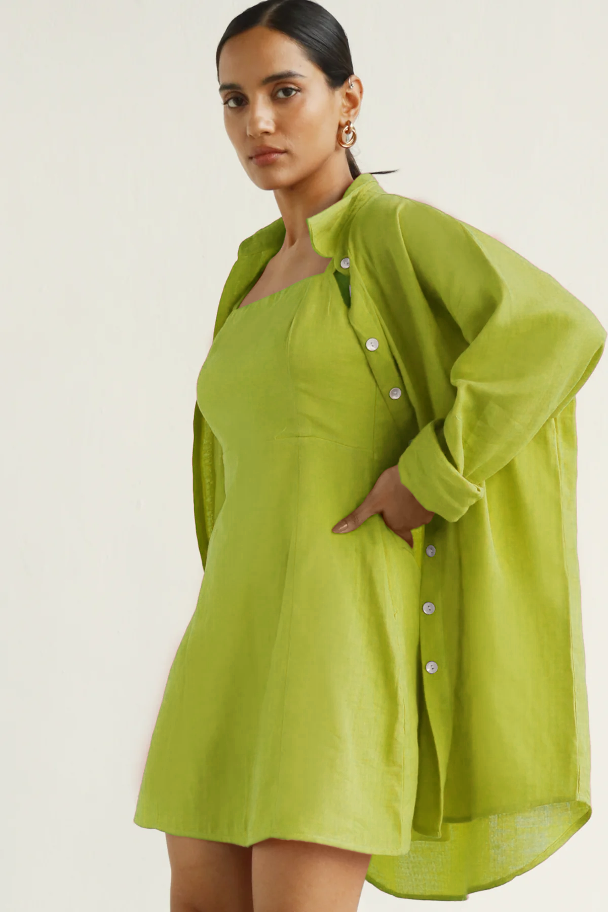 Minimal effort, maximum impact. A square-neck lime green dress that hugs just right, layered with a floaty, oversized shirt for that nonchalant charm. Wear them together or break them up—your wardrobe, your rules. This co-ord is easy on the skin and strong on the style game.