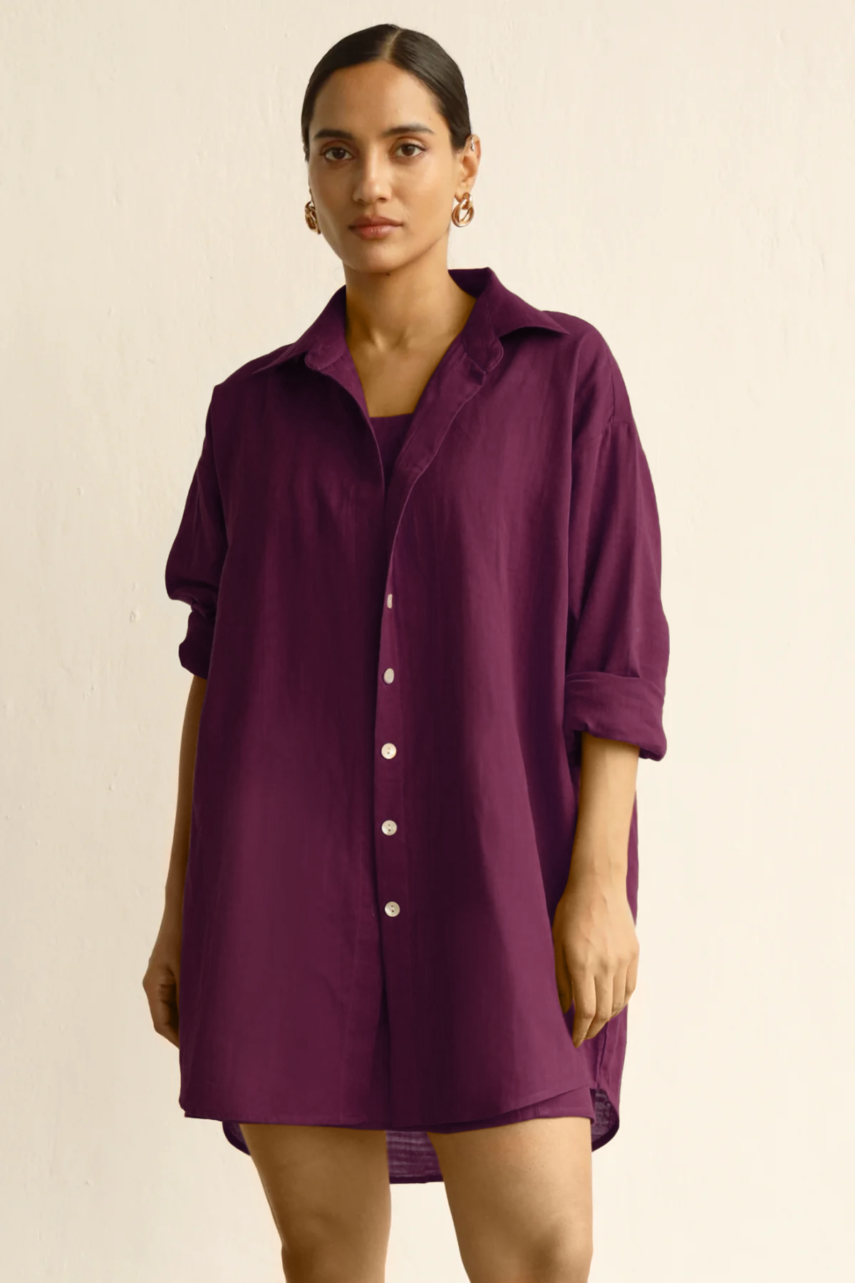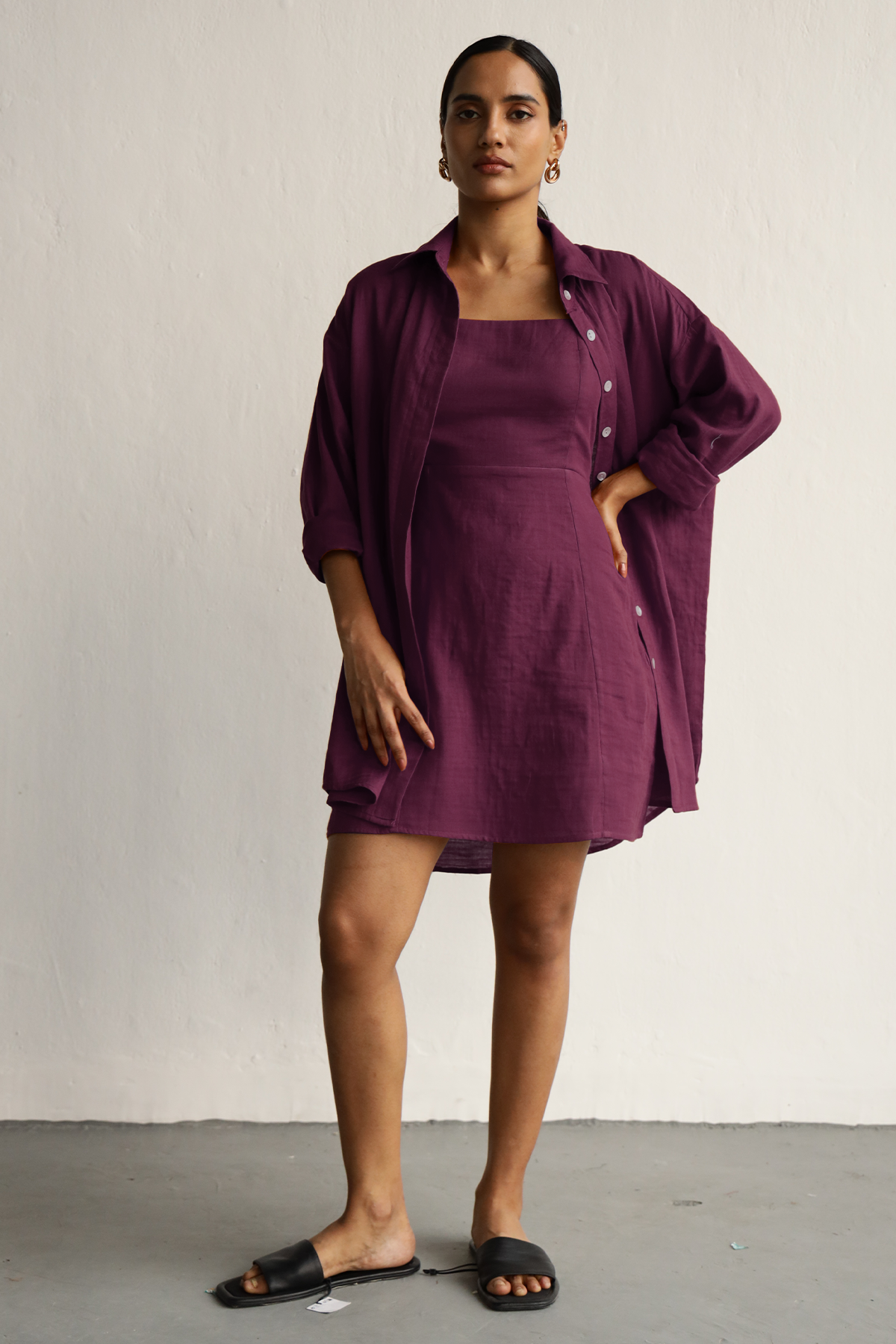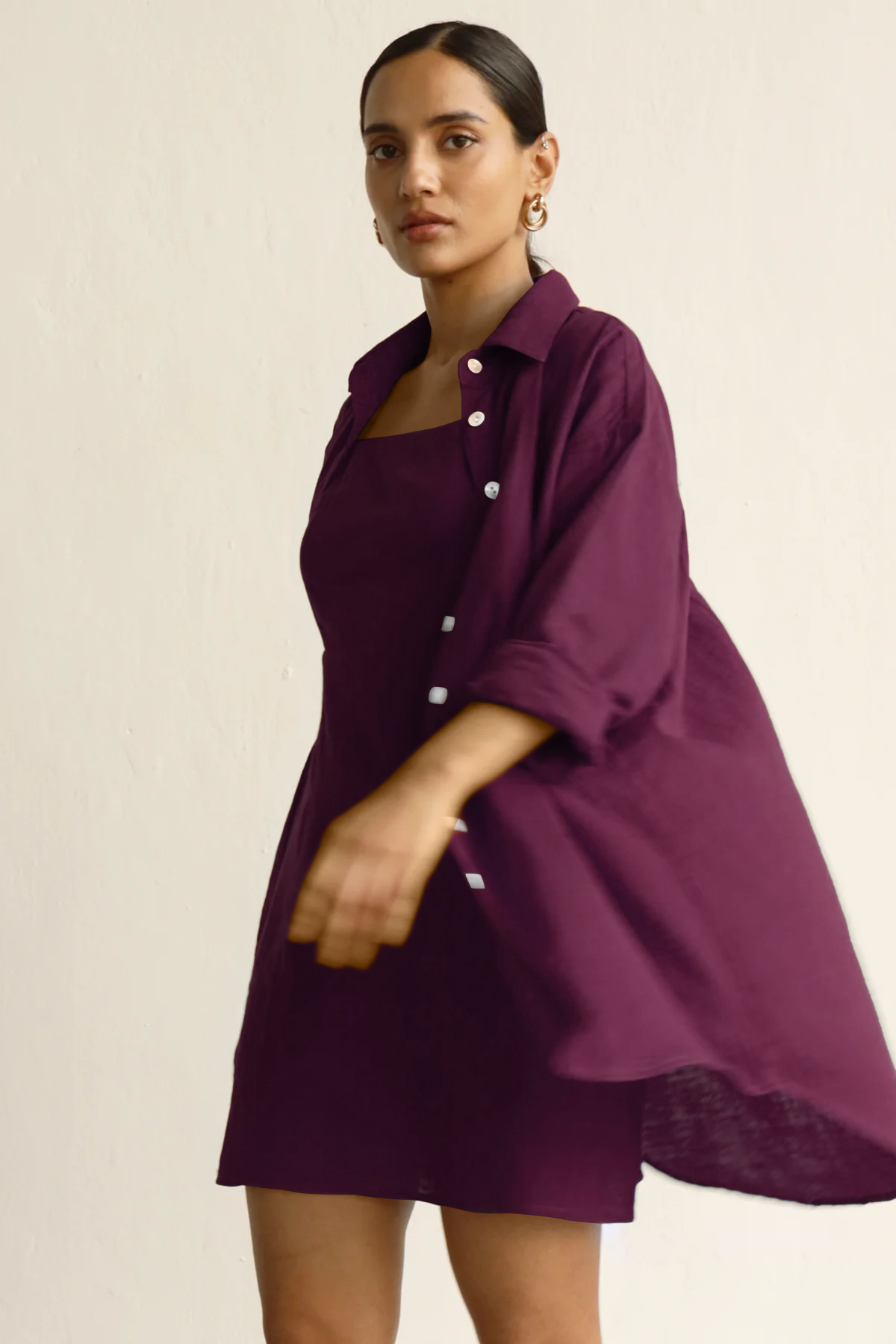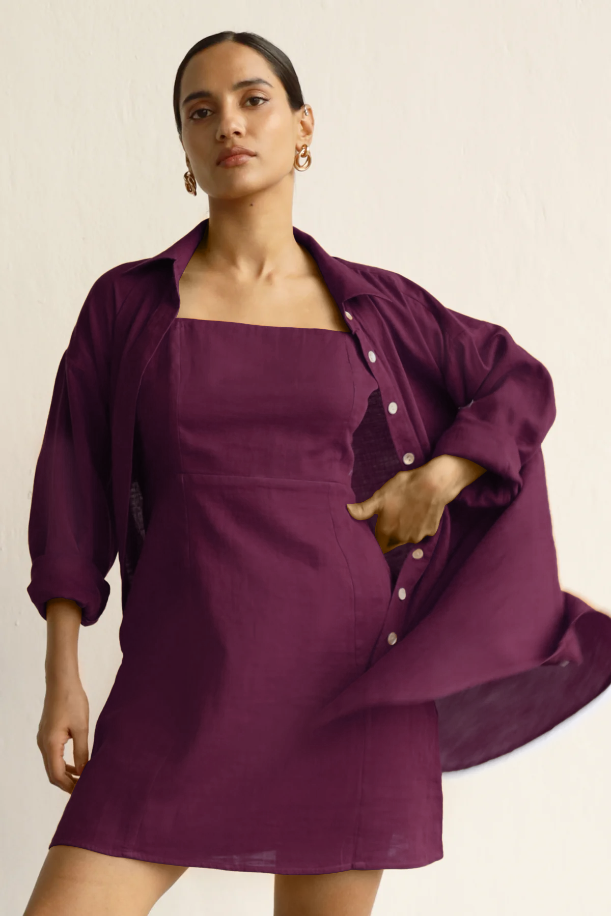 Minimal effort, maximum impact. A square-neck linen dress that hugs just right, layered with a floaty, oversized shirt for that nonchalant charm. Wear them together or break them up—your wardrobe, your rules. This co-ord is easy on the skin and strong on the style game.