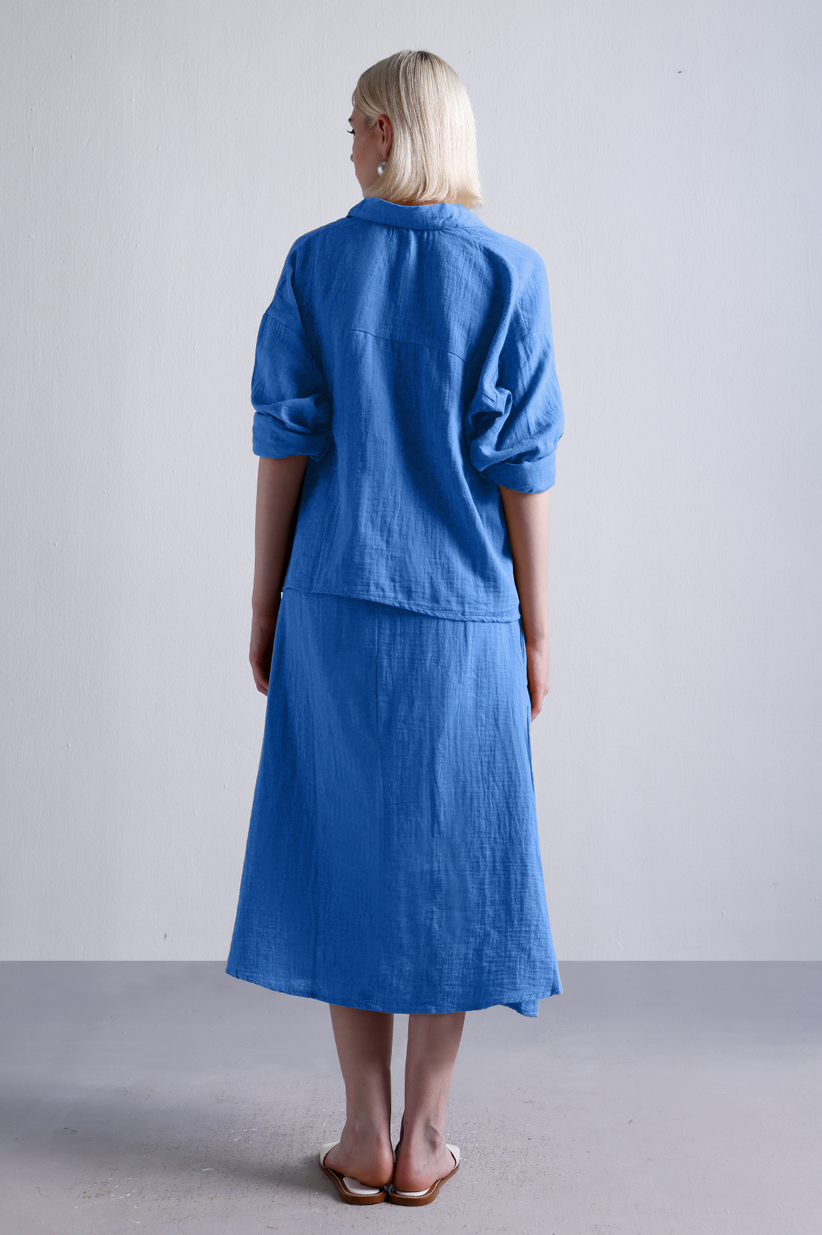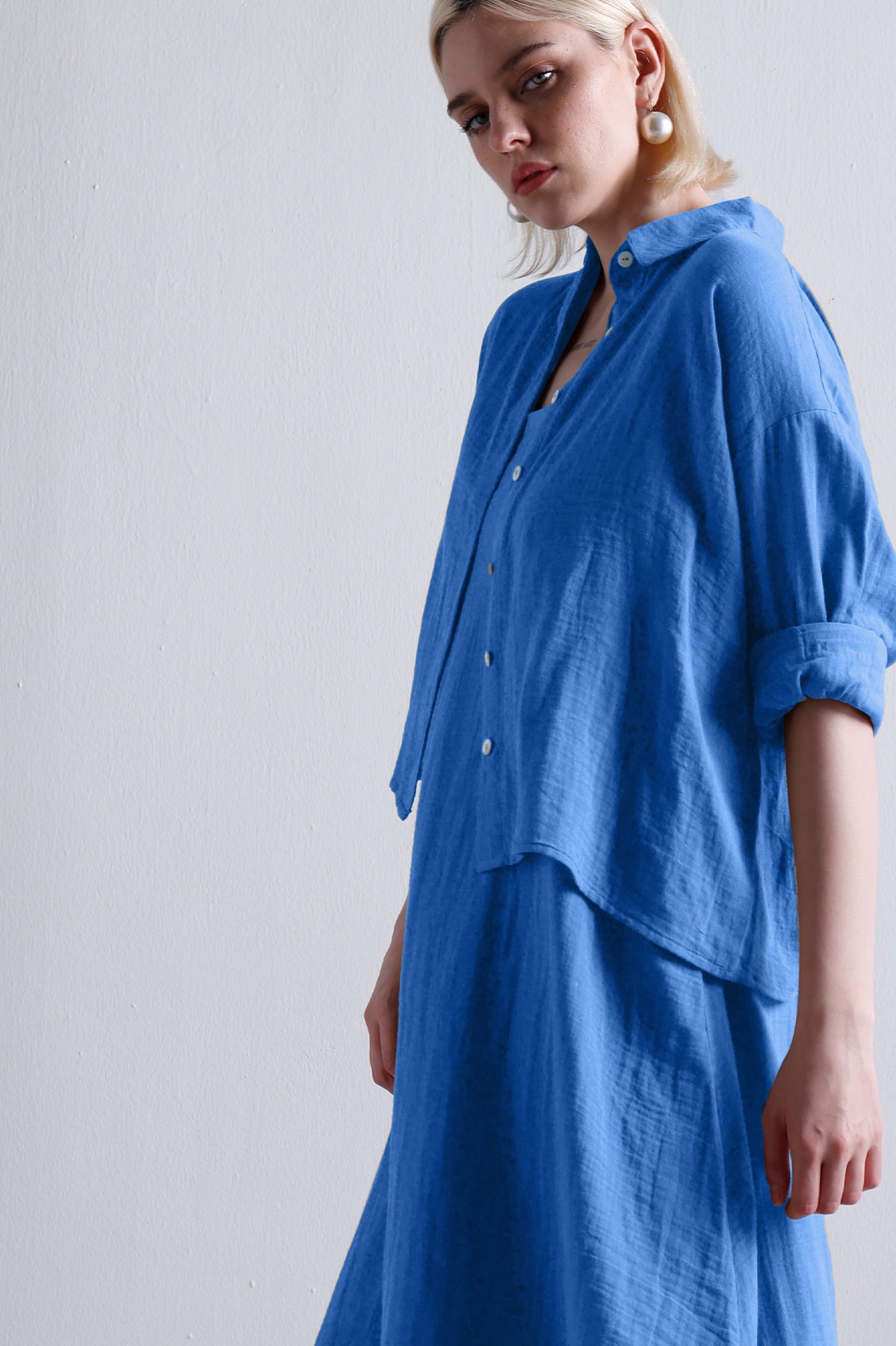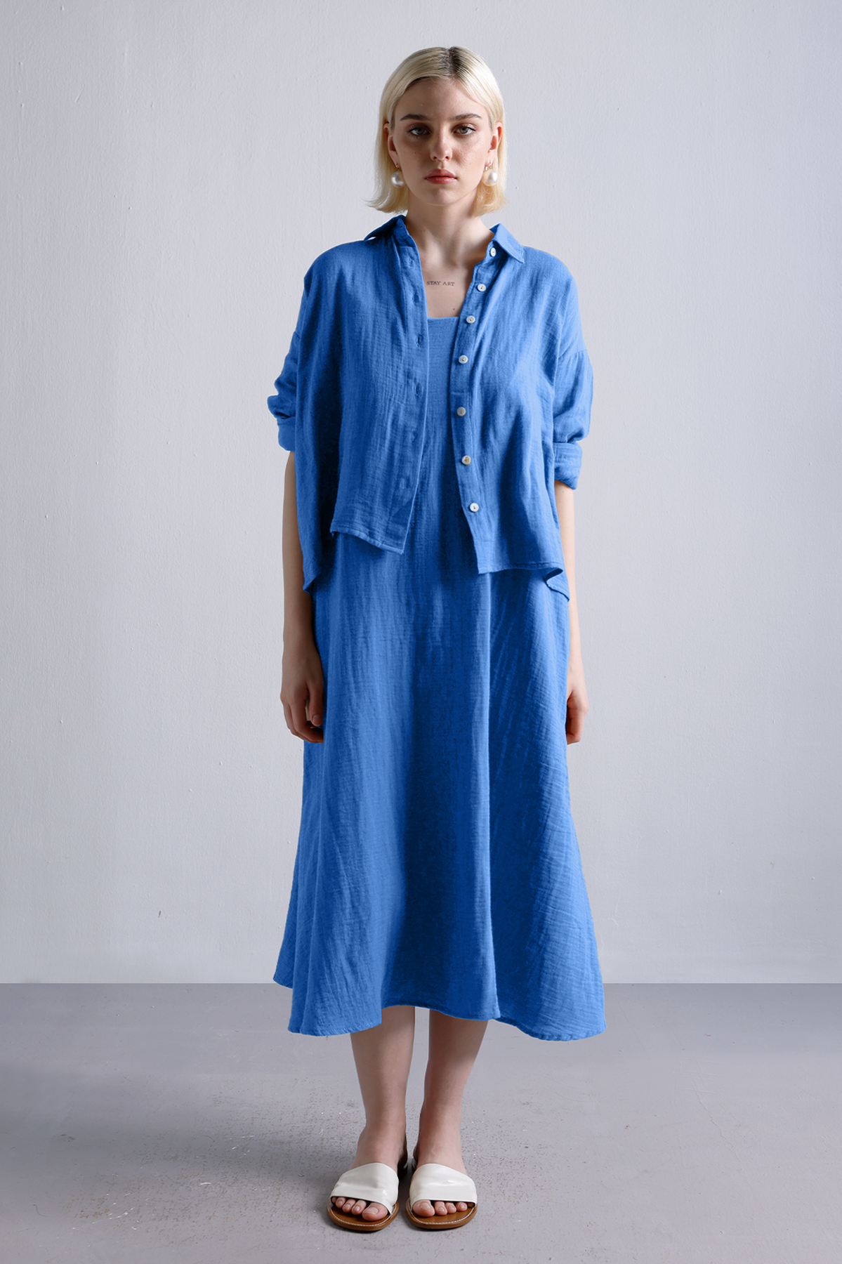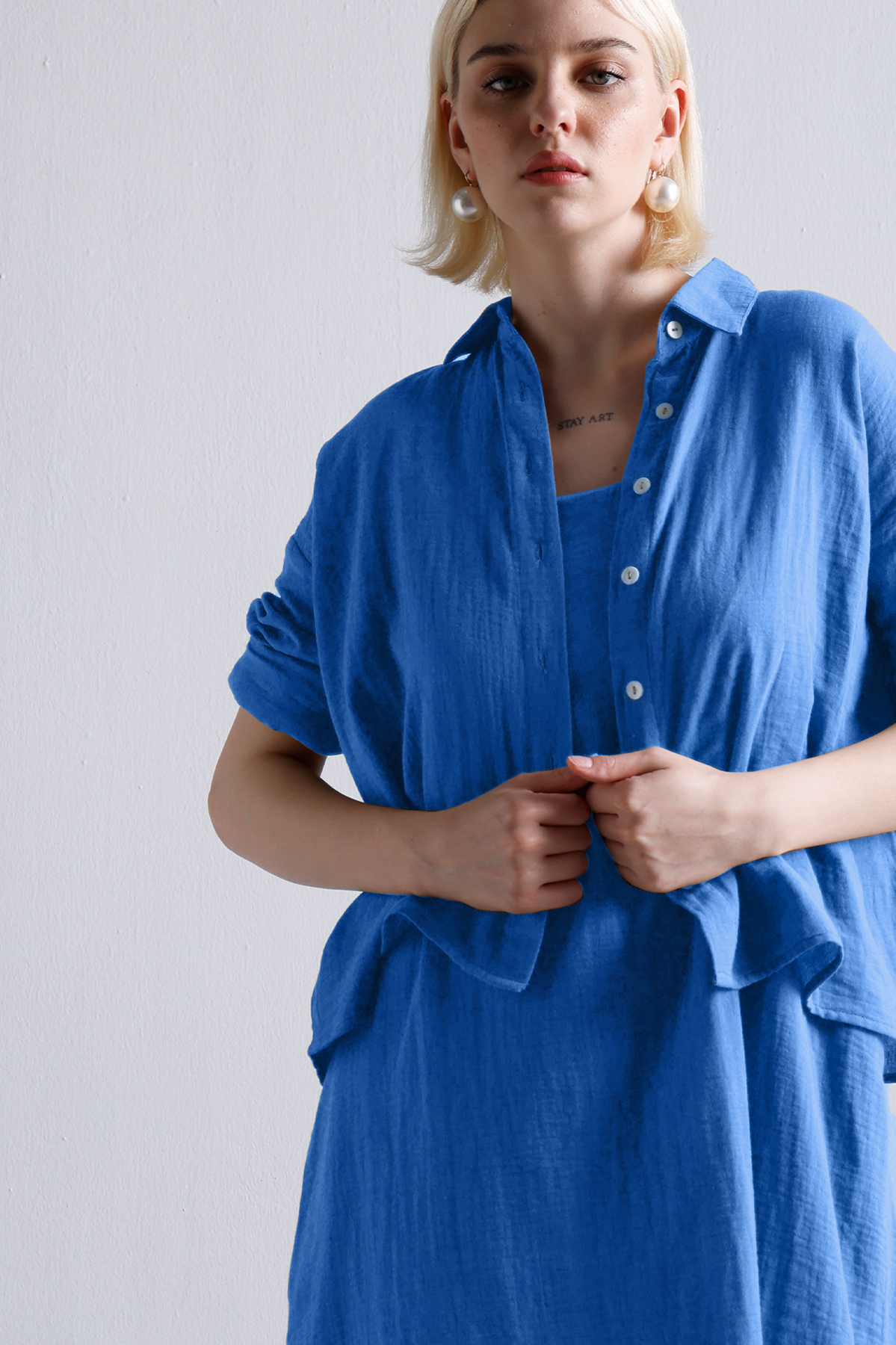 A slip dress co-ord set that moonlights as your getaway plan. Flowy, flattering, and crafted in 100% Cotton, it pairs with anything—especially the matching shirt. Breezy enough for errands, polished enough for dinner. Basically, your summer solution in one set.