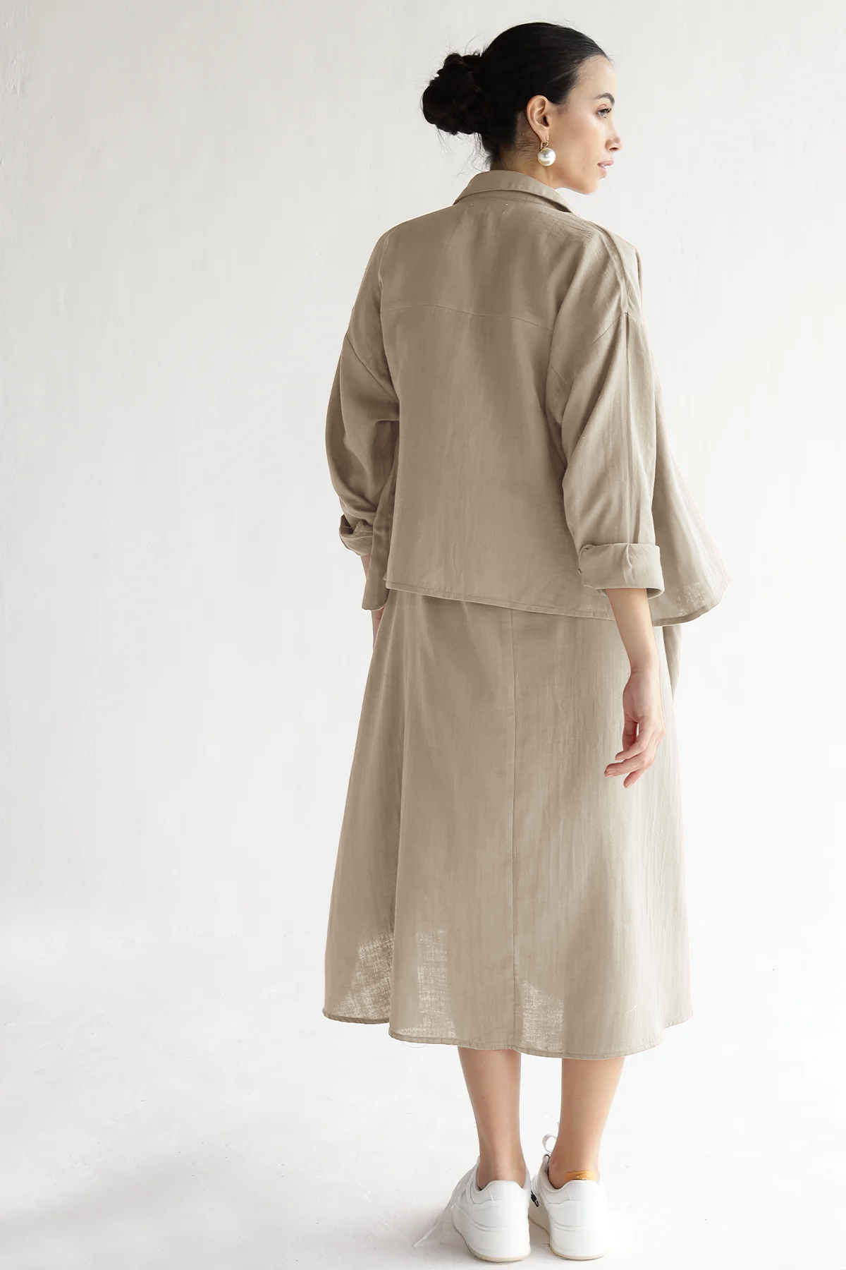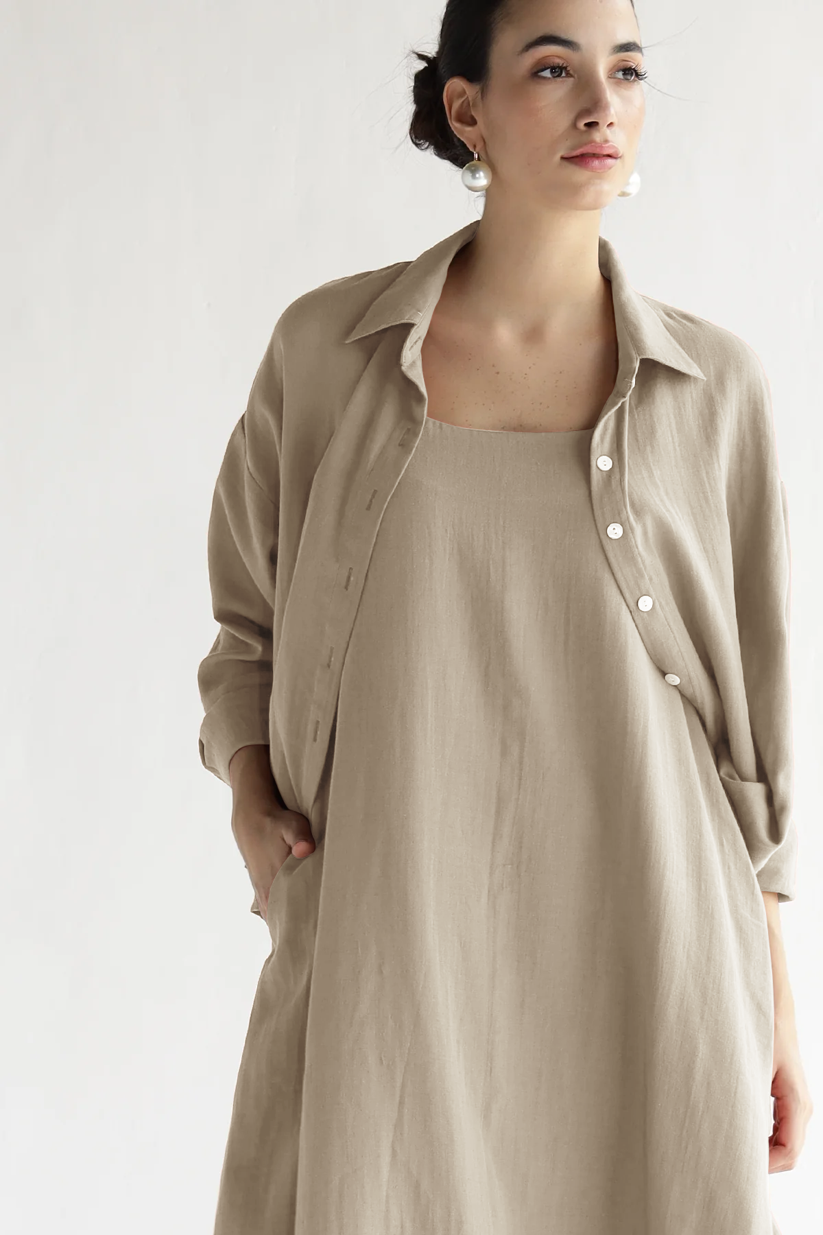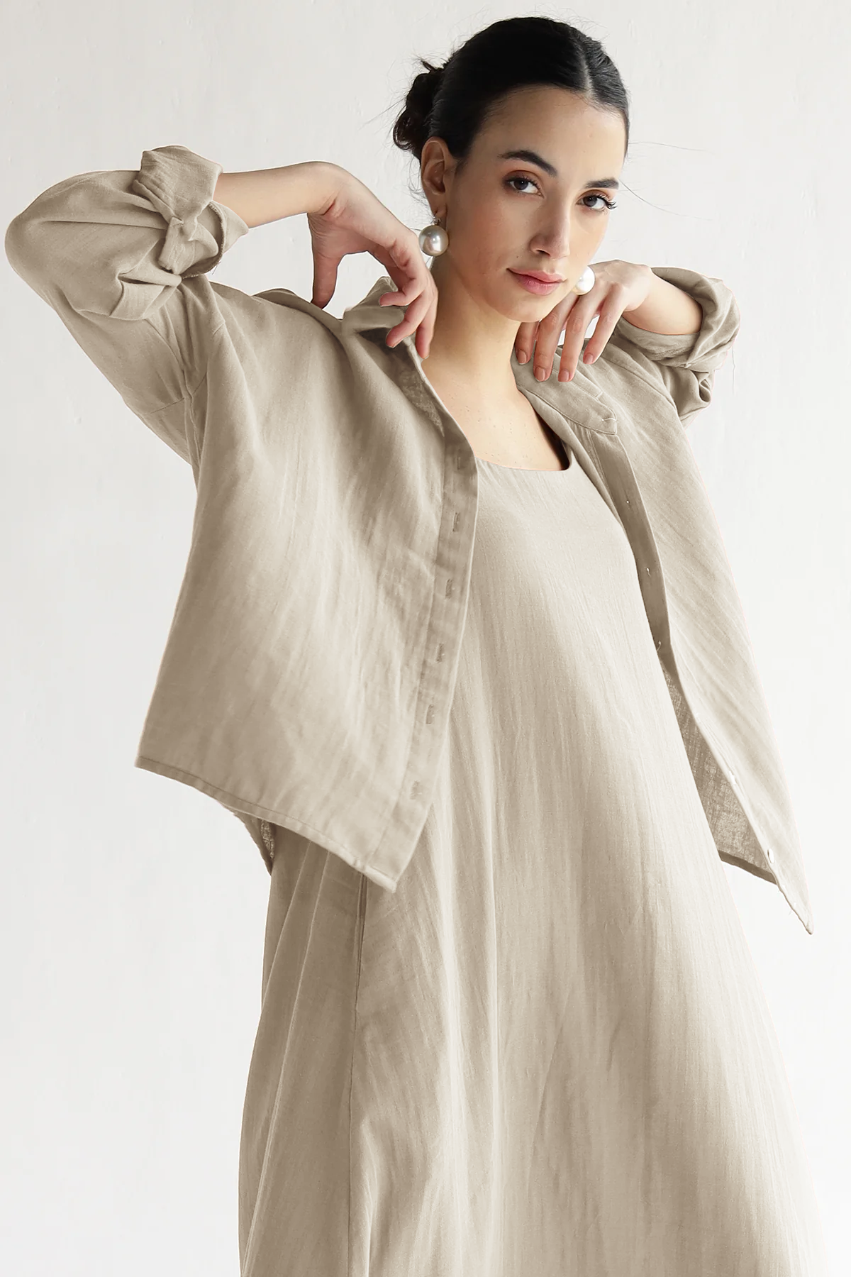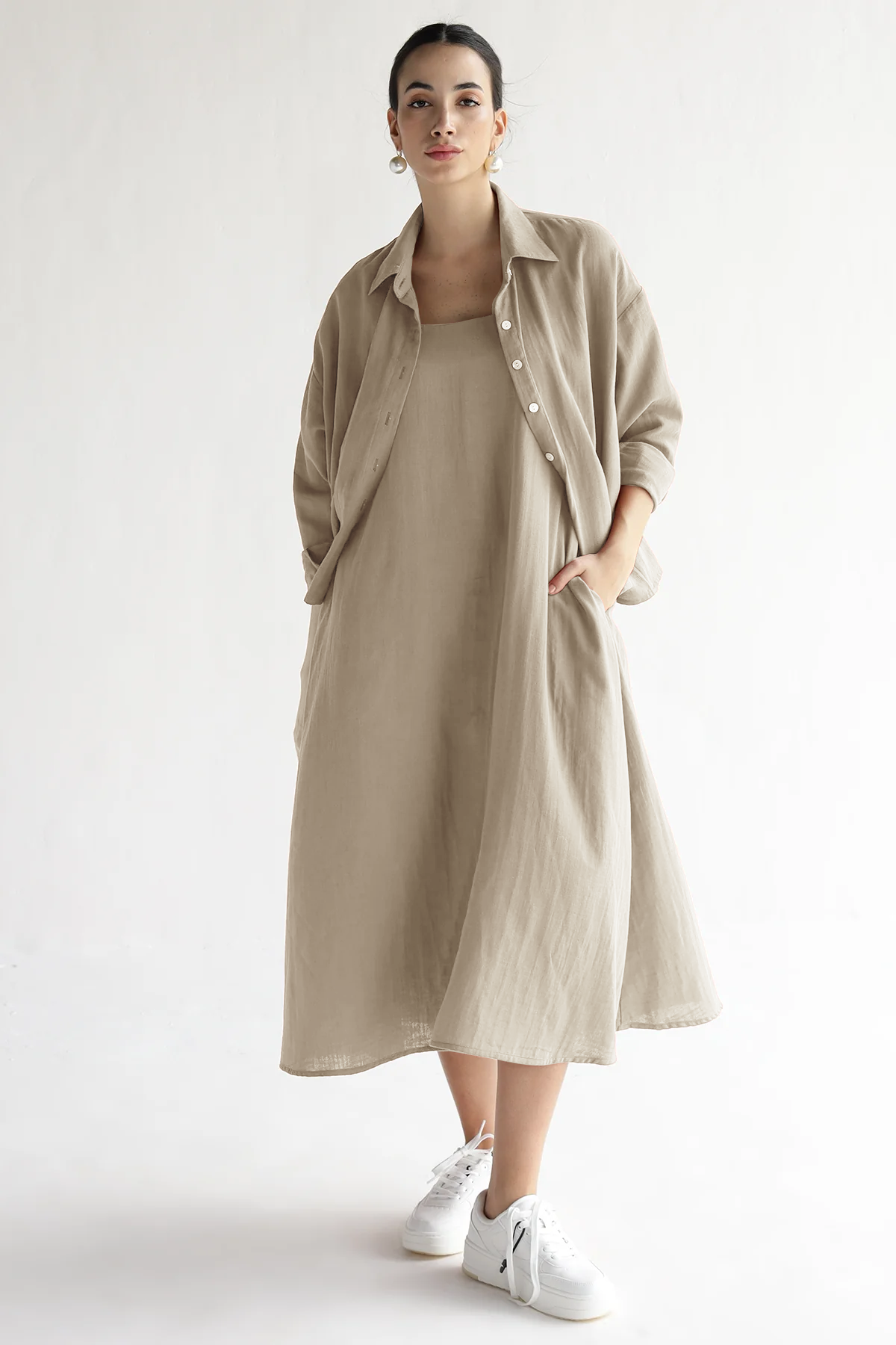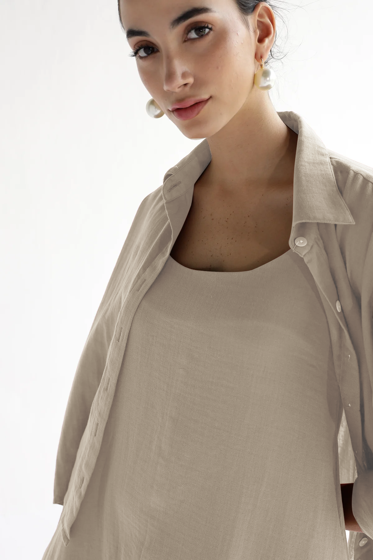 A slip dress co-ord set that moonlights as your getaway plan. Flowy, flattering, and crafted in 100% Cotton, it pairs with anything—especially the matching shirt. Breezy enough for errands, polished enough for dinner. Basically, your summer solution in one set.