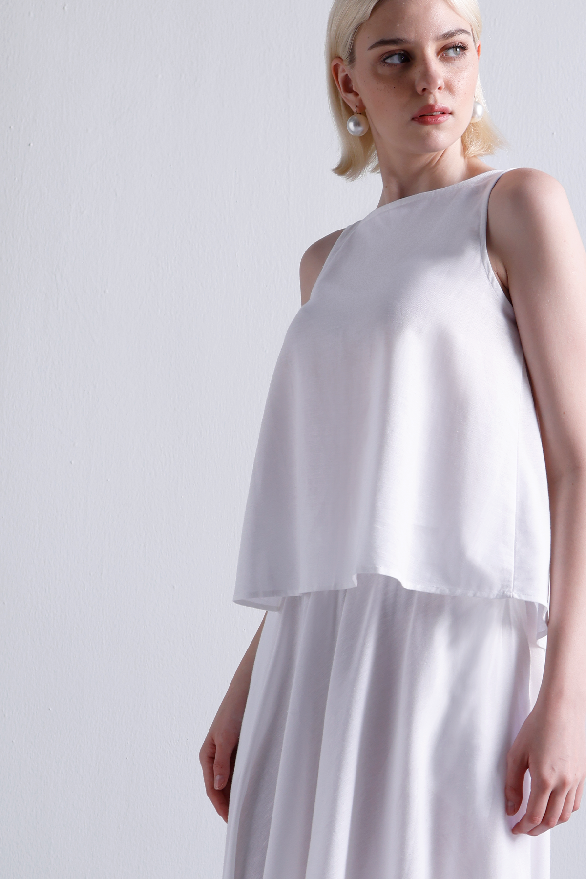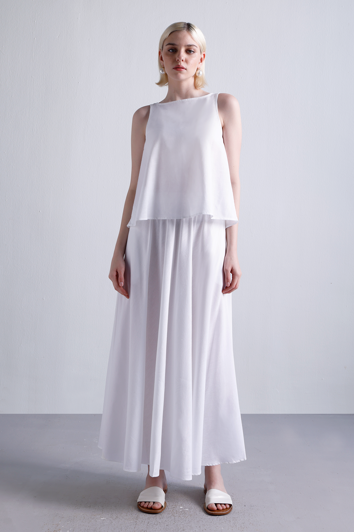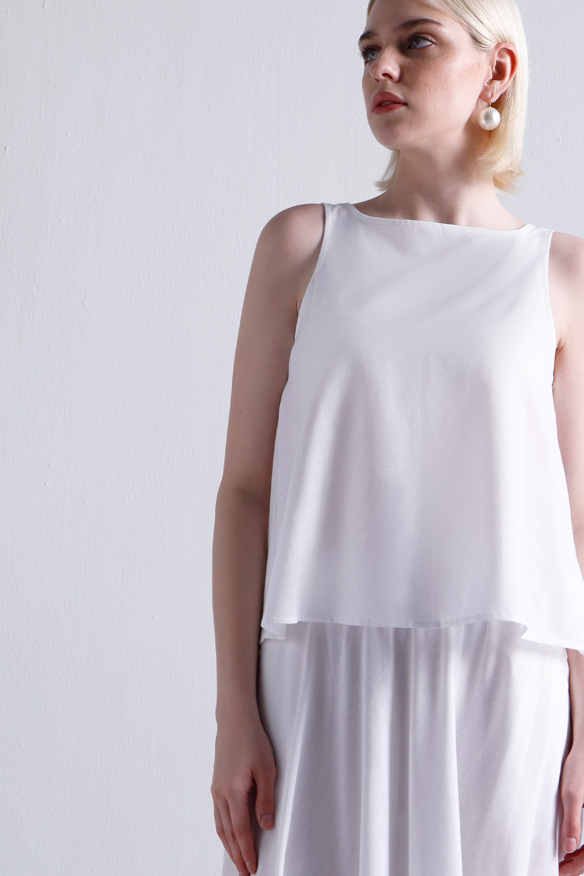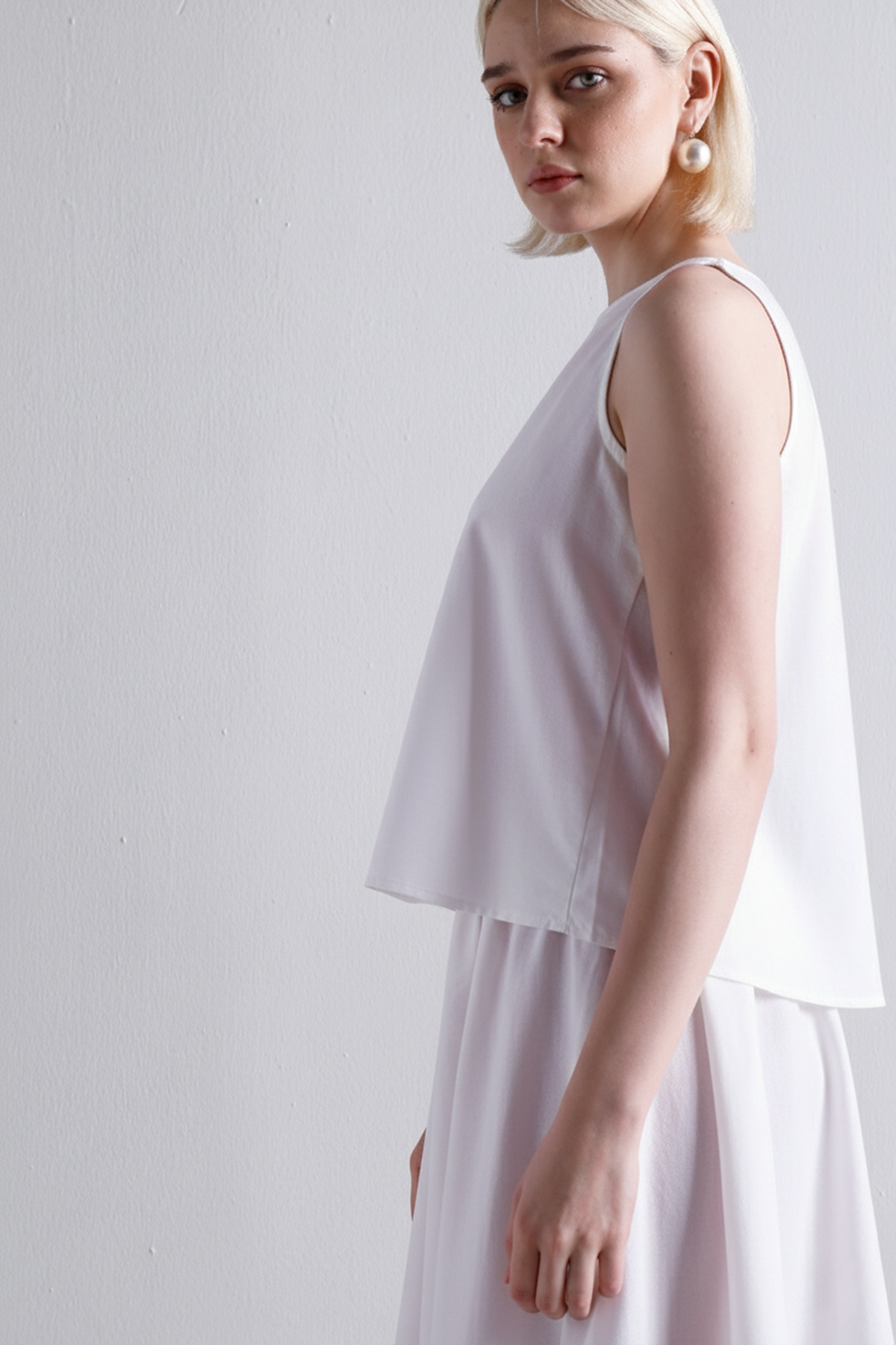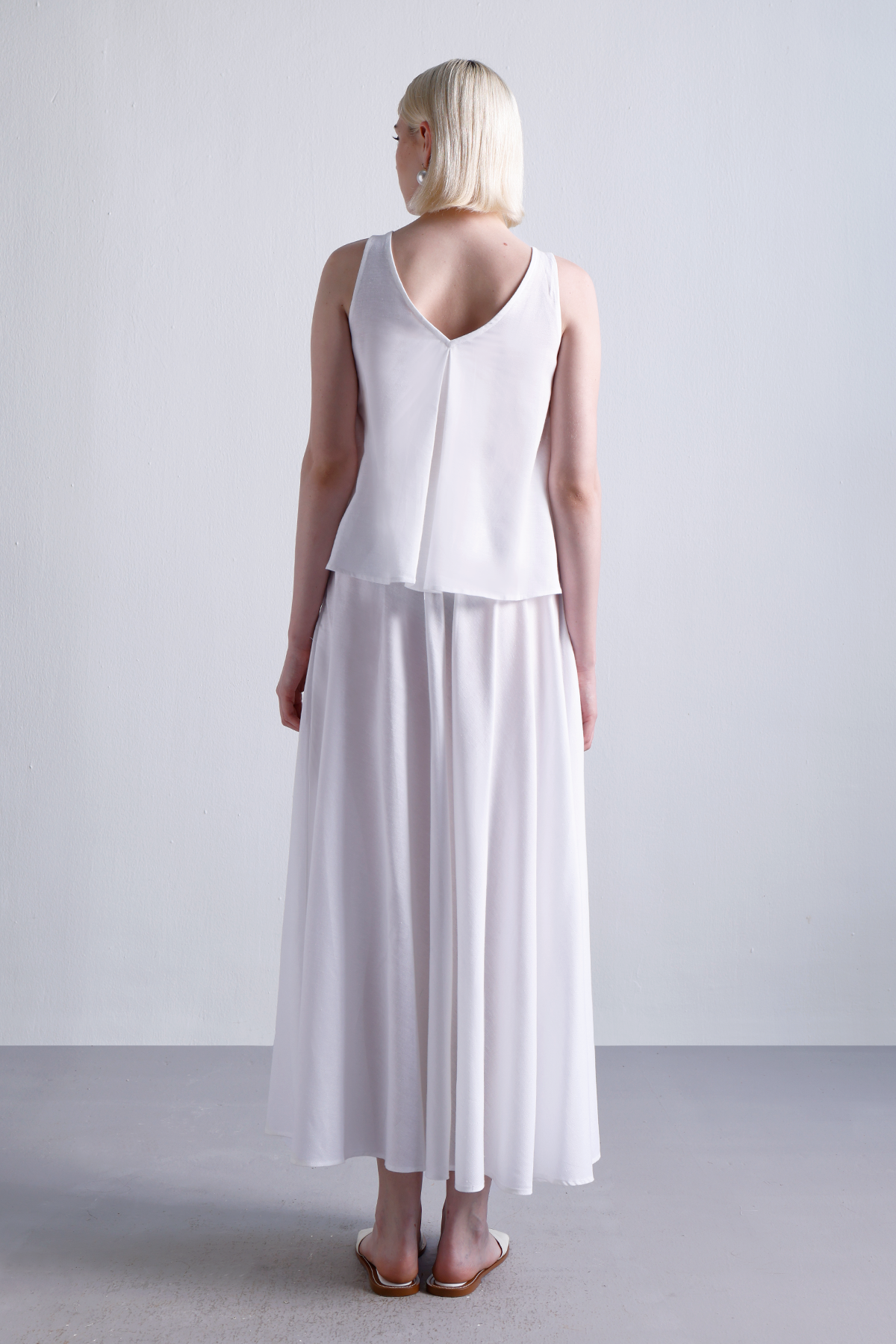 A white sleeveless flared top with a statement pleat back, paired with a high-waisted flared midi skirt. The airy silhouette offers all-day comfort, while functional side pockets add practicality. Crafted in breathable cotton, this versatile two-piece set is perfect for everyday wear, travel, or weekend dressing. Effortless. Elevated. Easy to style.